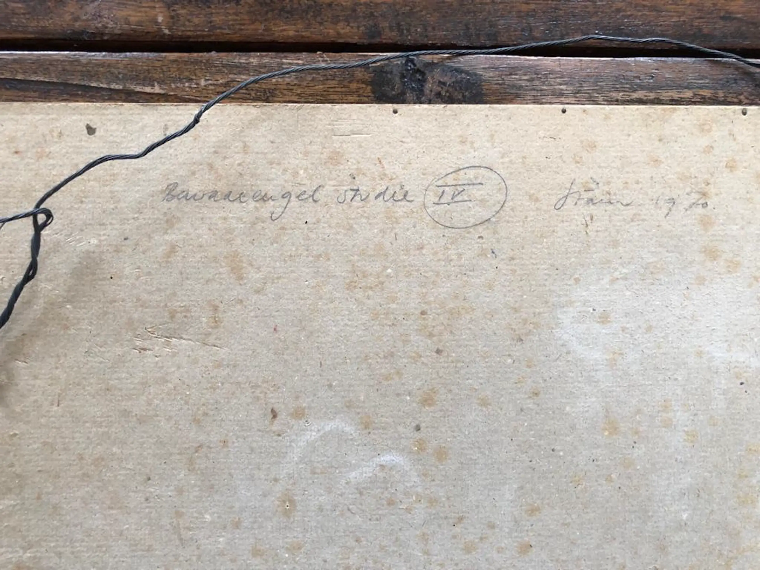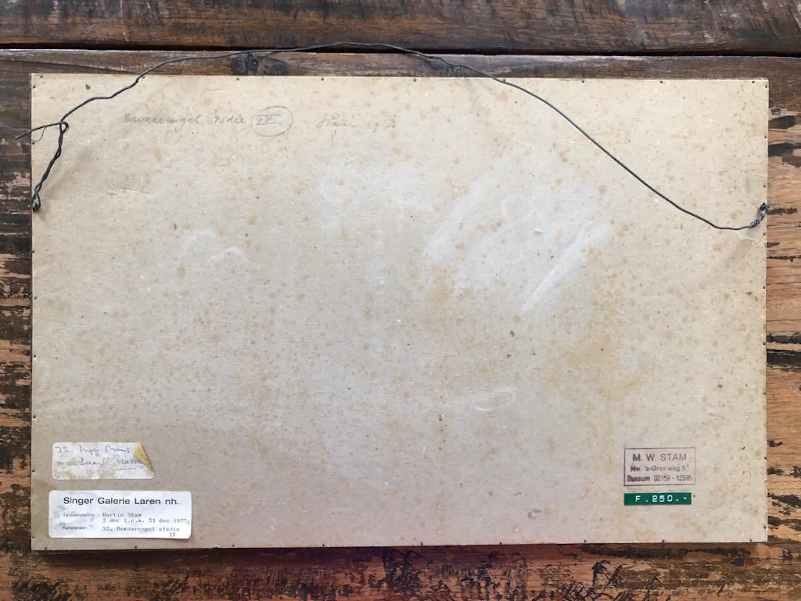 Het gaat om een tekening uit de tentoonstelling "Martin Stam, Schilderijen, Tekeningen, en Etsen" in het Singer Museum in Laren van 4 t/m 31 december 1977. Studiostempel en tentoonstellingsticker op achterzijde. Het gaat om catalogusnummer 32. Ook een prijslabel nog aanwezig.