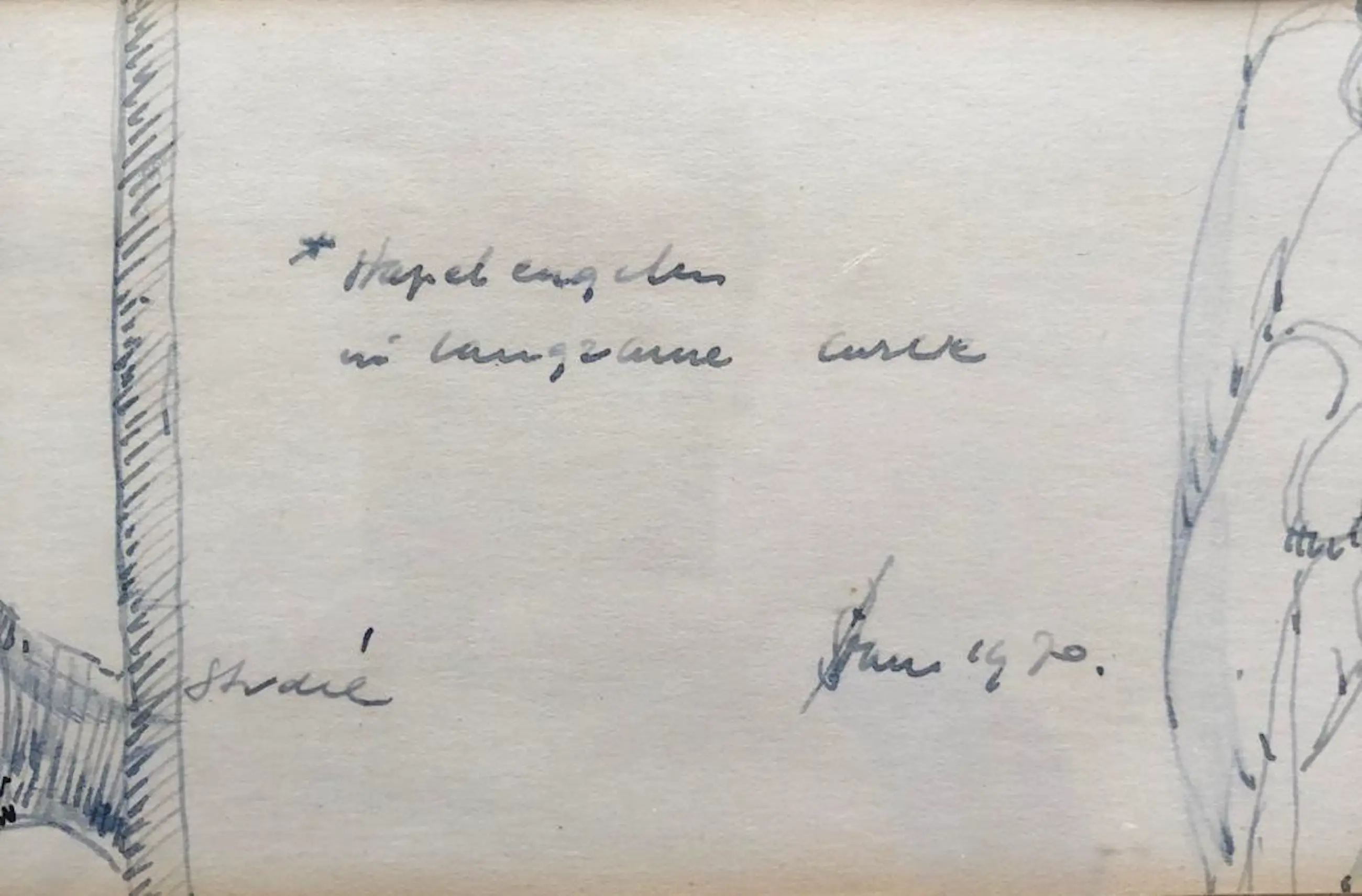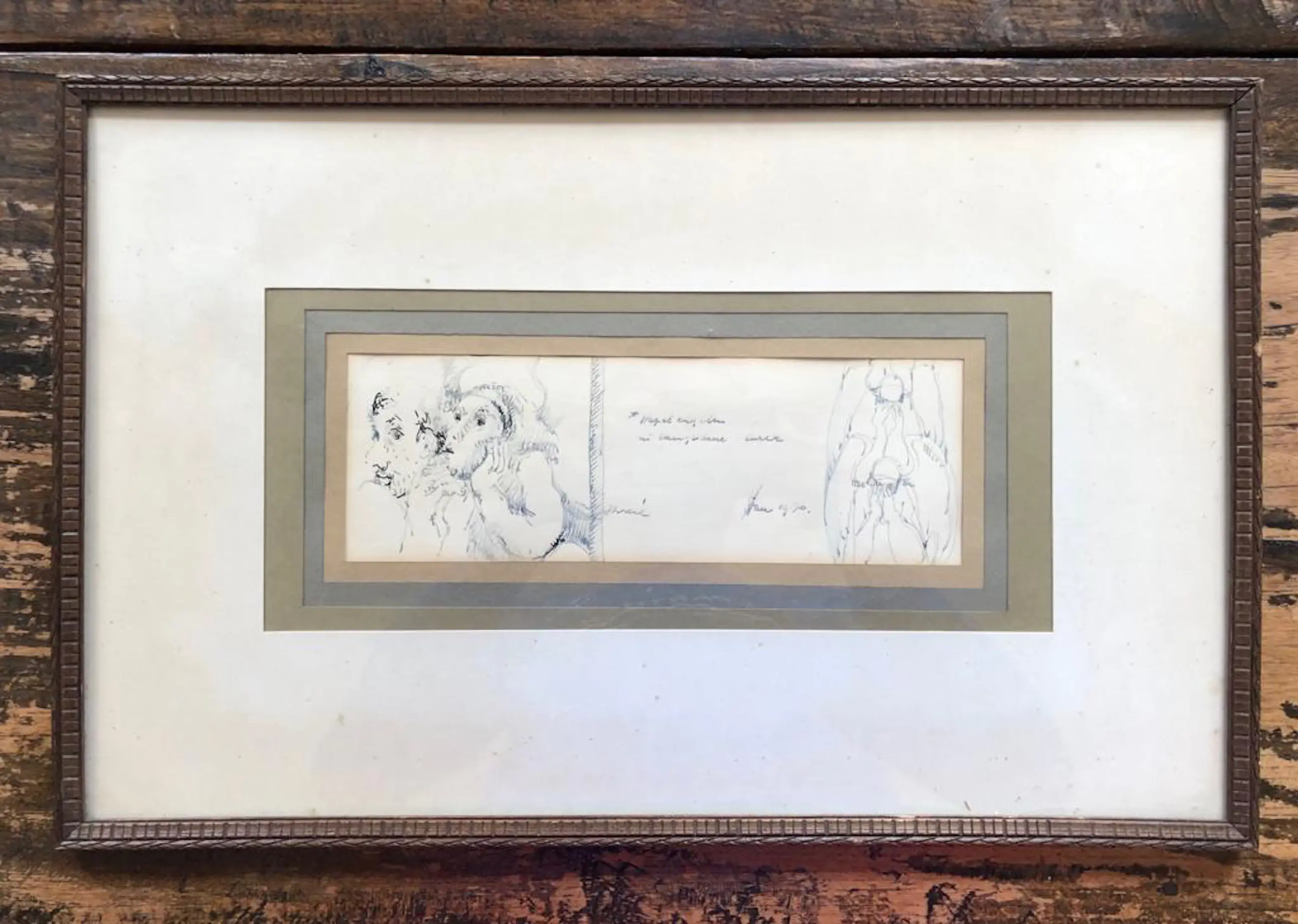 Afmetingen tekening: 10 x 29 cm en 36 x 56 cm incl. lijst en passepartout. Gelijst achter glas in luxe lijst uit jaren '70. De conditie is goed.