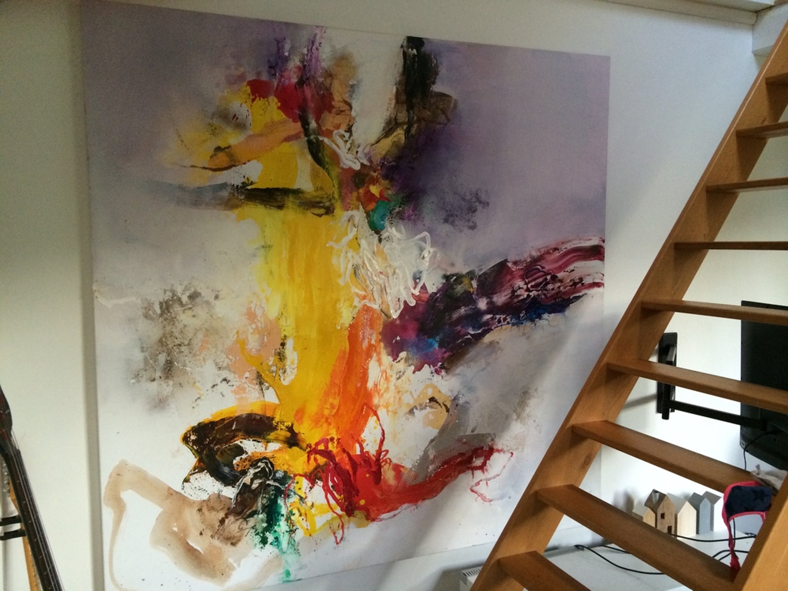 Kleurrijk olieverfdoek van 1.80 x 1.80 m. Gesigneerd. Tot grote tevredenheid in twee huizen gehangen, maar in ons nieuwe, kleinere huis komt het niet meer tot zijn recht. Heeft een grote muur nodig.