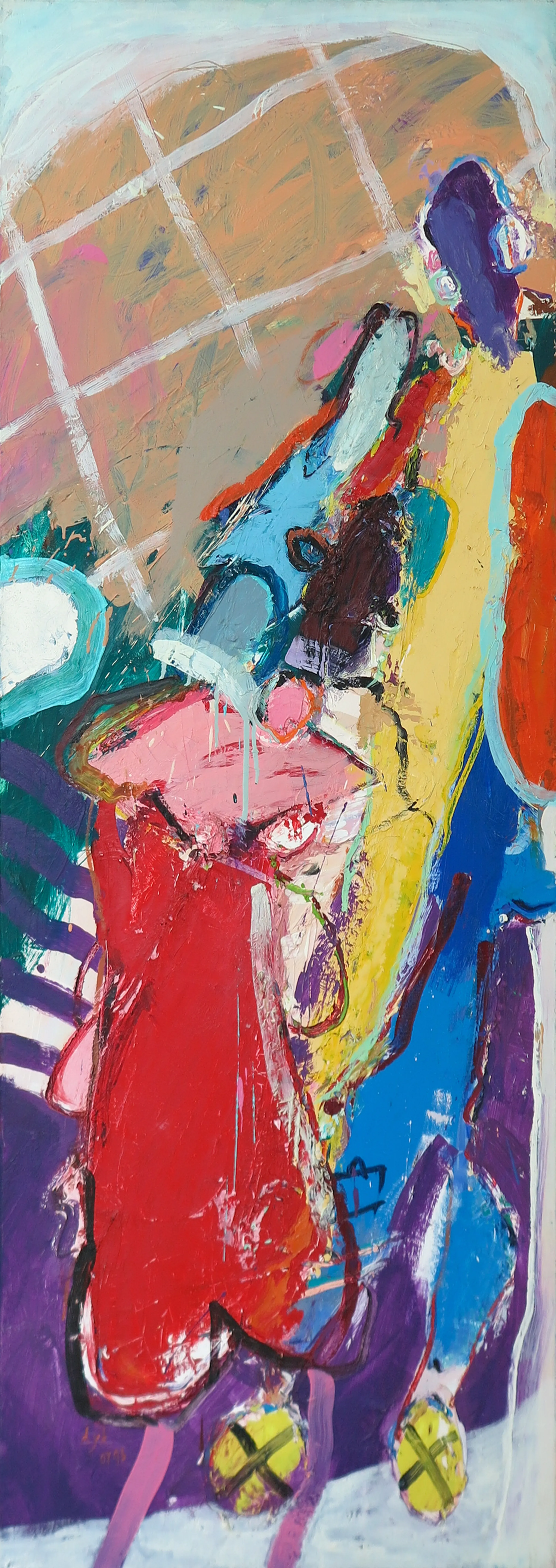 | Wat lichte slijtage langs de randen en hoeken van het doek. Hier en daar enkele barstjes in de verflaag. Klein plekje verfverlies midden links tegen de rand. | |