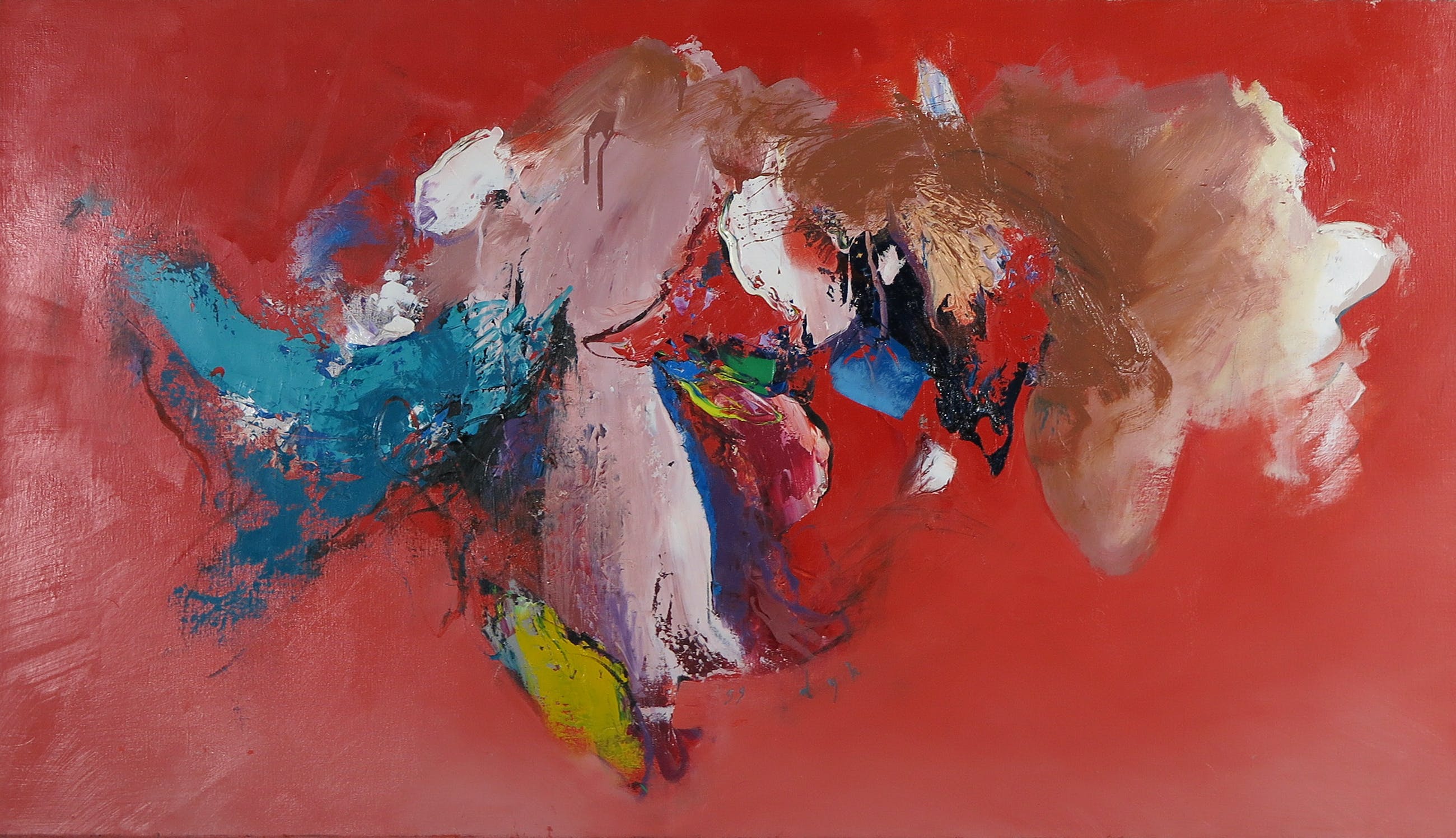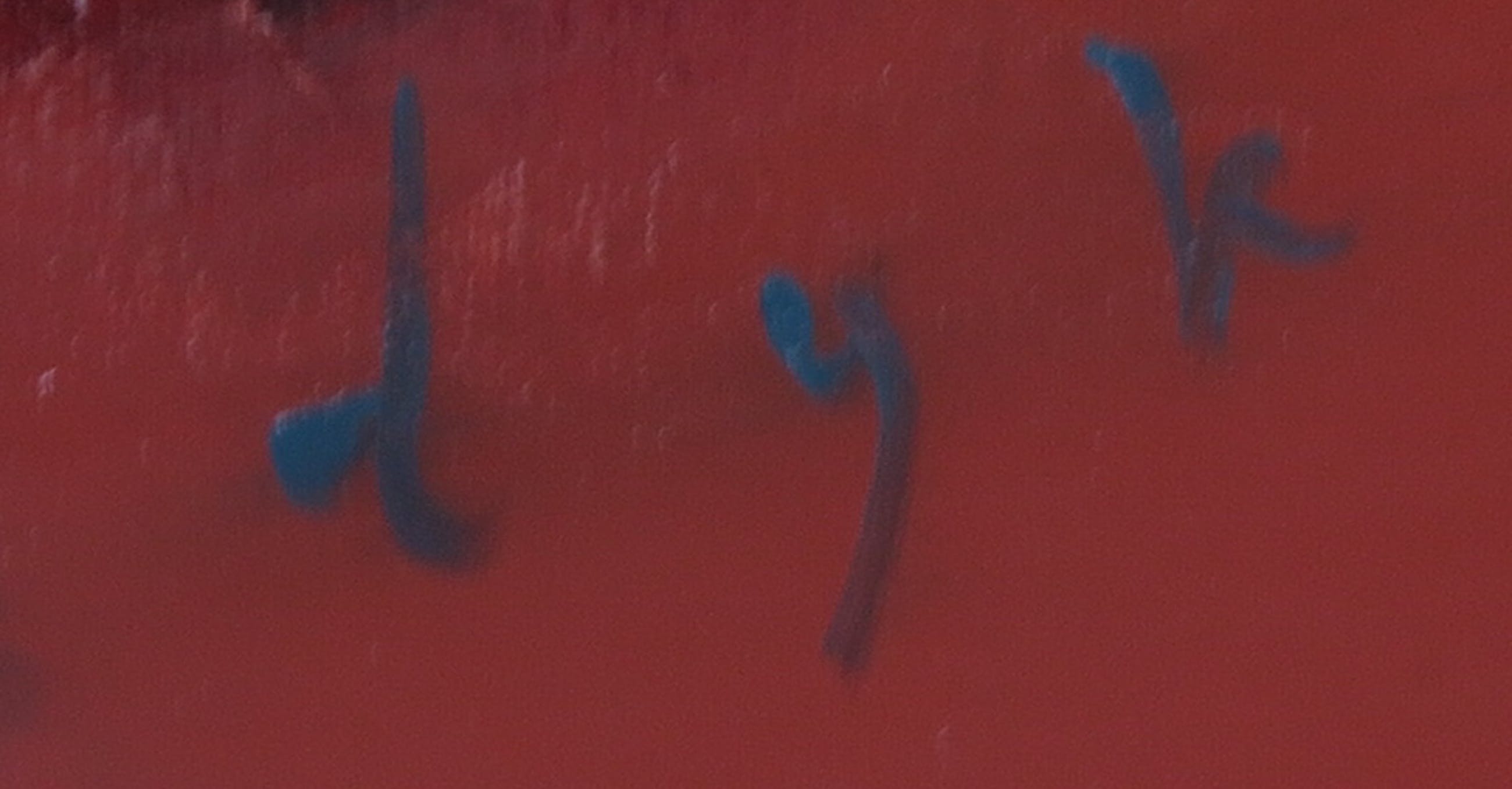 | Hier en daar wat licht verfverlies en langs de hoeken van het doek. | |