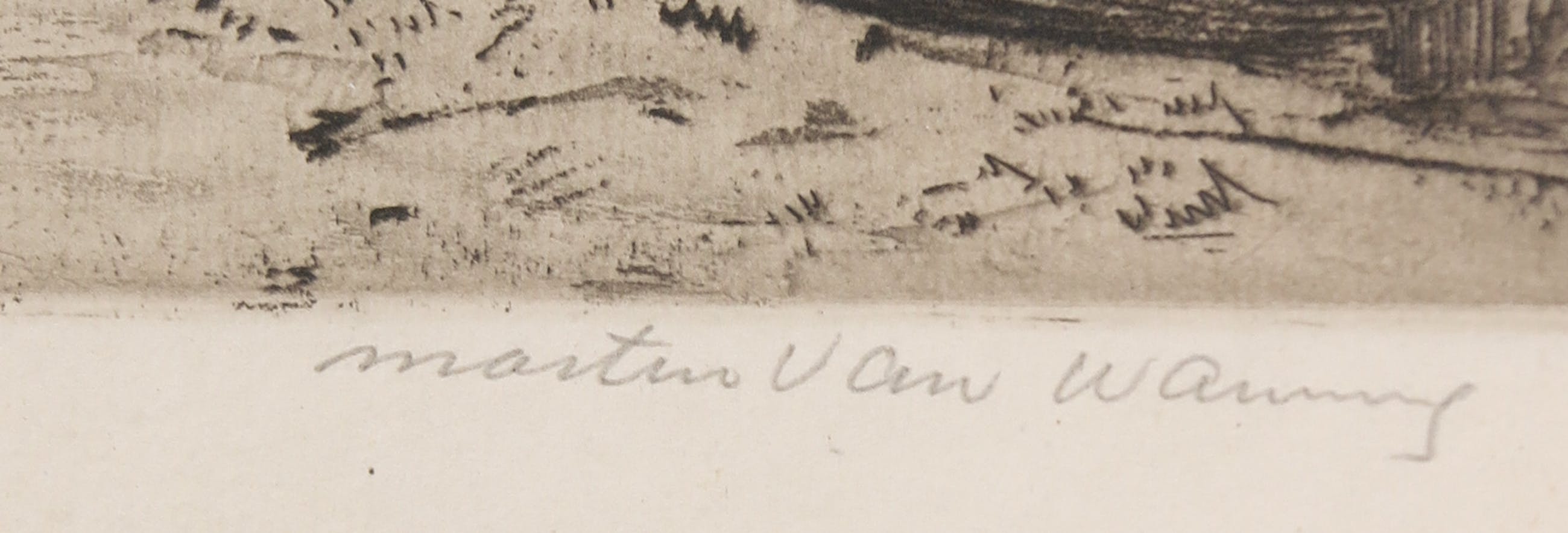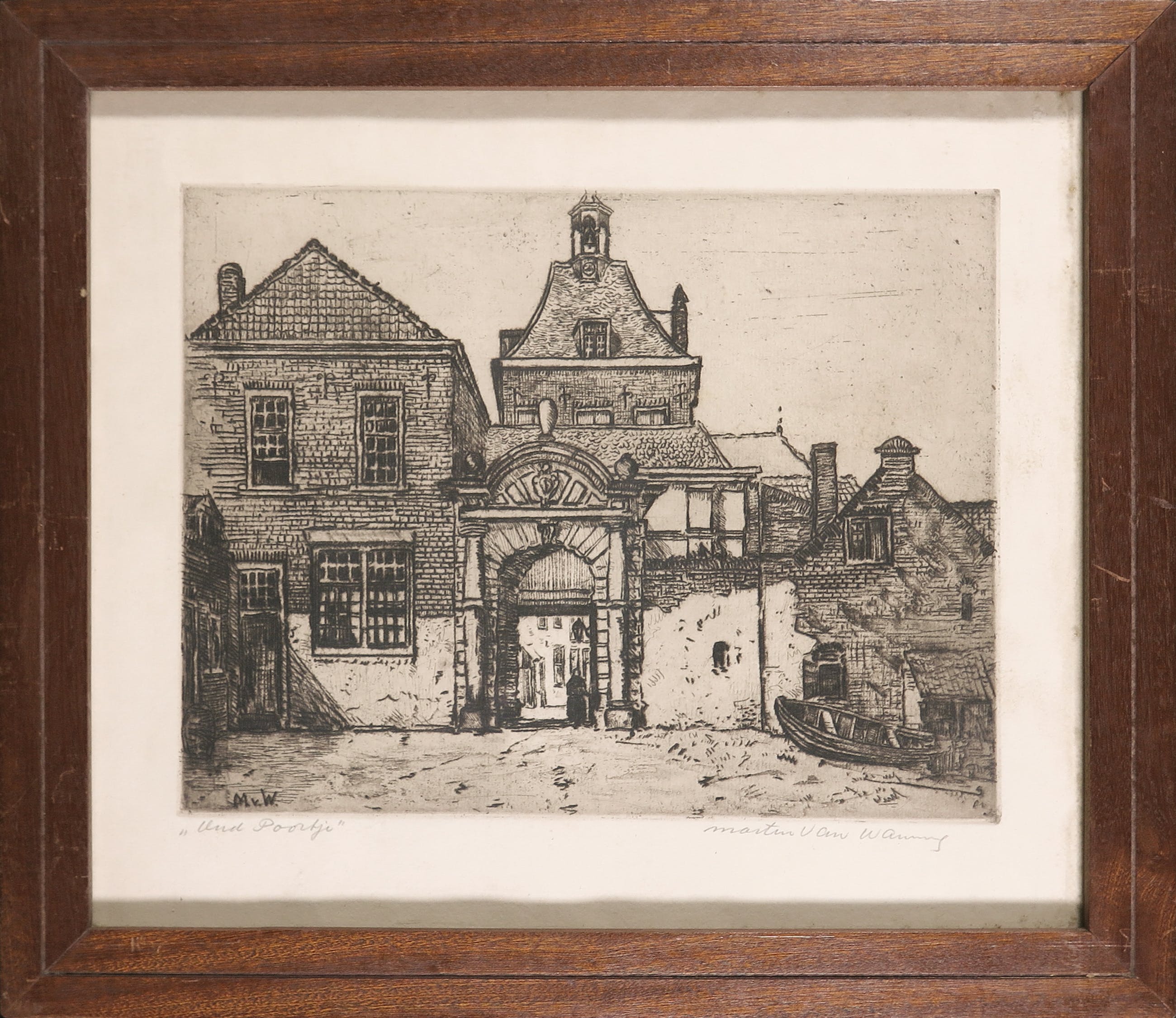 Ets van een oud poortje in een vissersdorp. Linksonder in de plaat gesigneerd, rechtsonder met potlood gesigneerd.