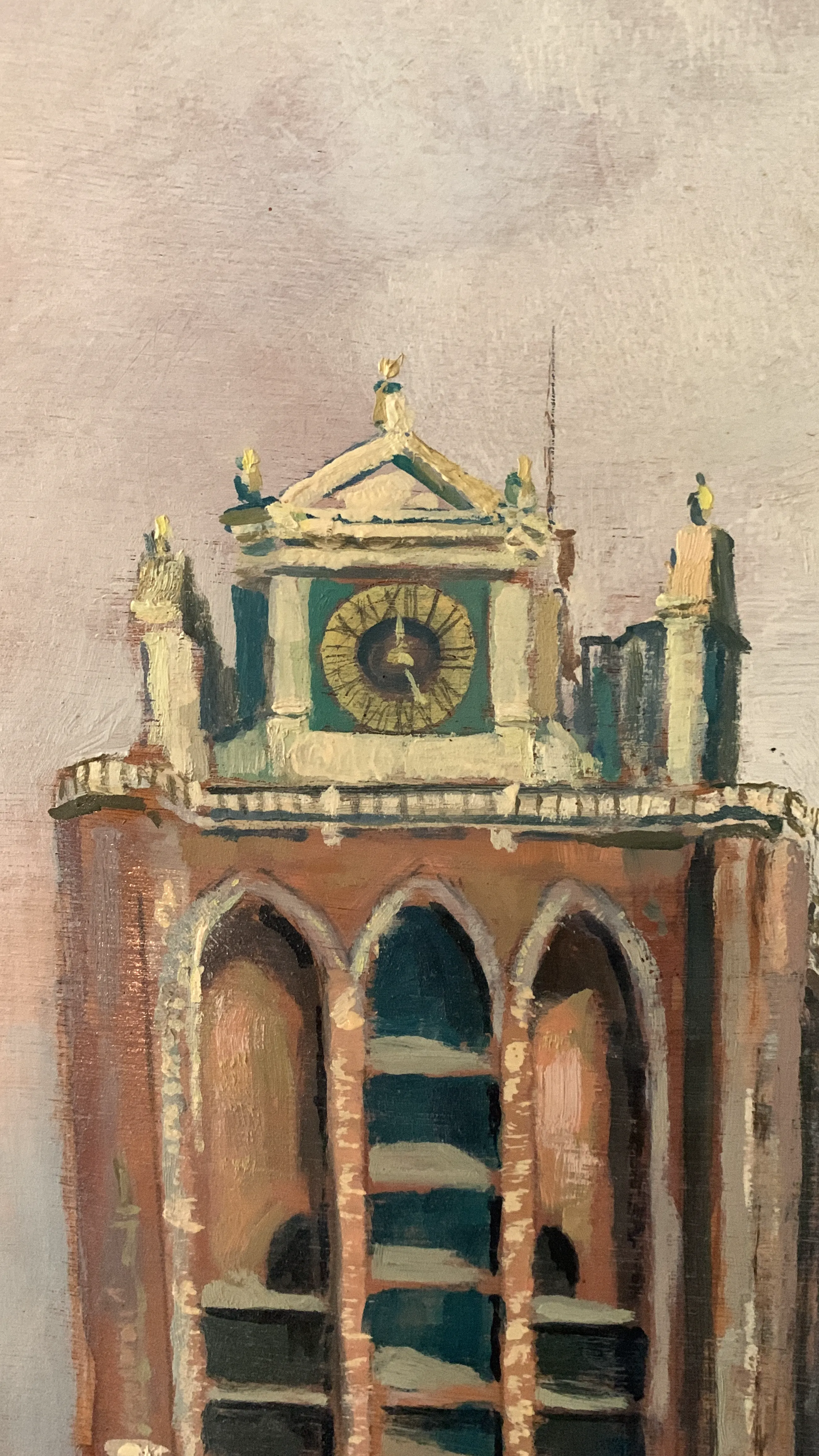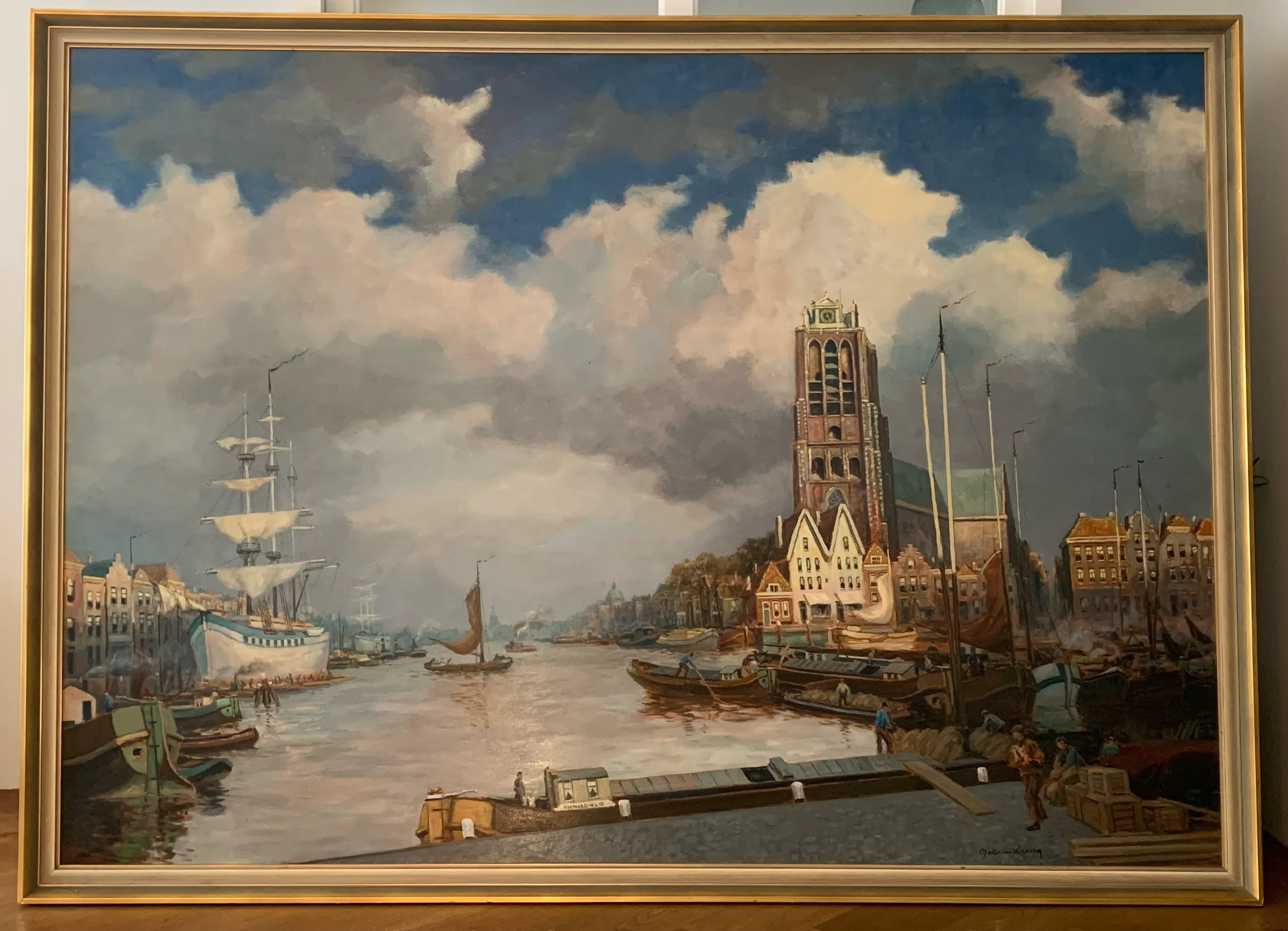 Het is een uitzonderlijk groot olieverfschilderij op paneel van 165x225 cm - in uitstekende staat - met daarop een voorstelling op Dordrecht. Om precies te zijn is het een uitzicht op de beroemde stompe toren vanaf de Grote Kerk, gezien vanaf de Bomhaven met het water van de Oude Maas daar links van. Bepaalde elementen van de voorstelling zijn wat gefantaseerd zoals bv. de oever aan de overkant. Ondanks deze imperfectie is het een vrolijk, kleurrijk en helder geschilderd werk, waarbij vooral het specialisme van de schilder, de beroemde wolkenpartijen met het doorheen schijnende zonlicht, opvalt.