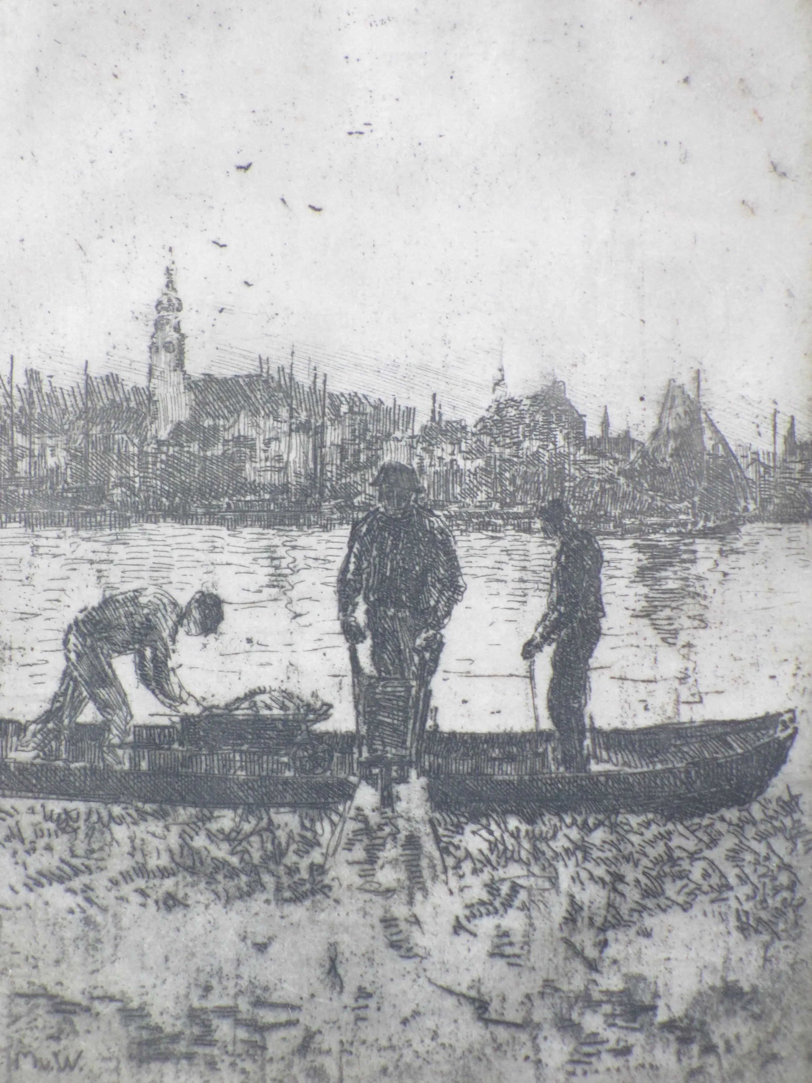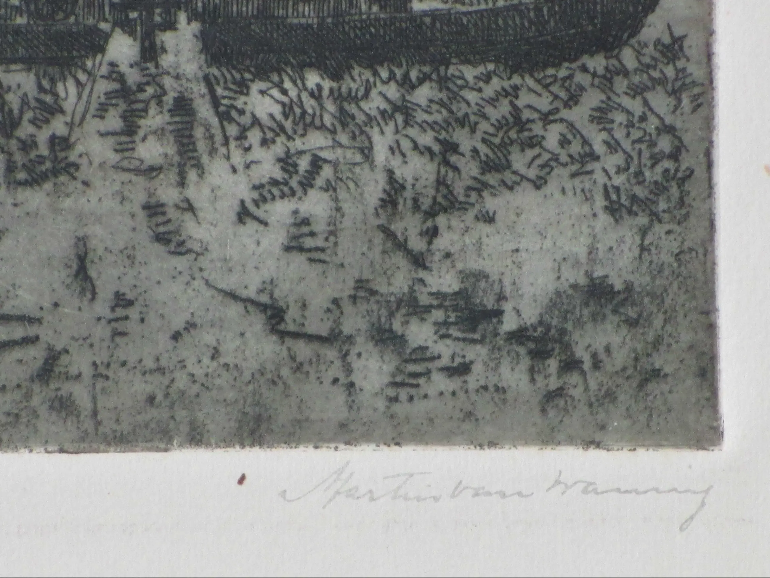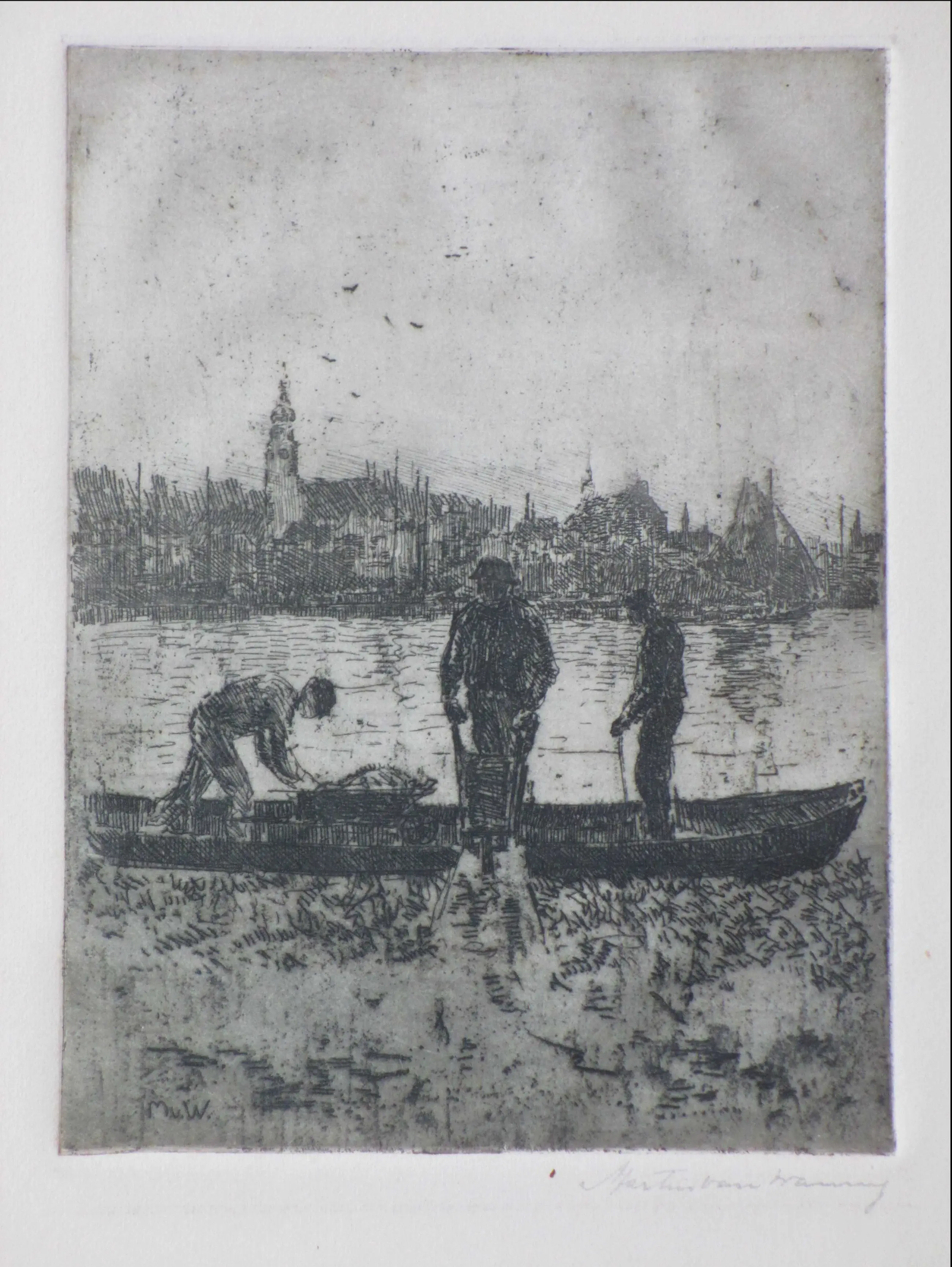 Ets door Martin van Waning Voorstelling van lossende havenarbeiders bij een schuit aan de rivier Losbladig, beeldmaat 20x15, bladmaat 33x24 Gesigneerd in potlood r.o.: 'Martin van Waning' Gemonogrammeerd in de druk l.o.: 'MvW' Authenticiteit volledig gegarandeerd