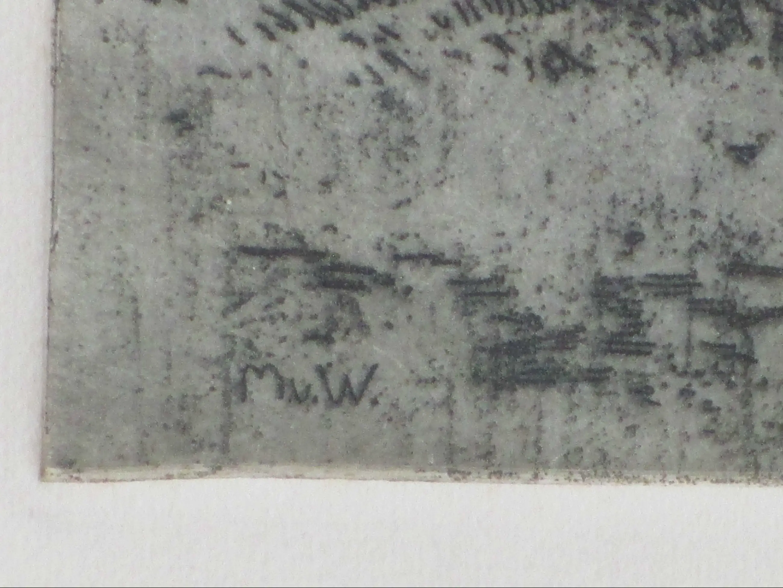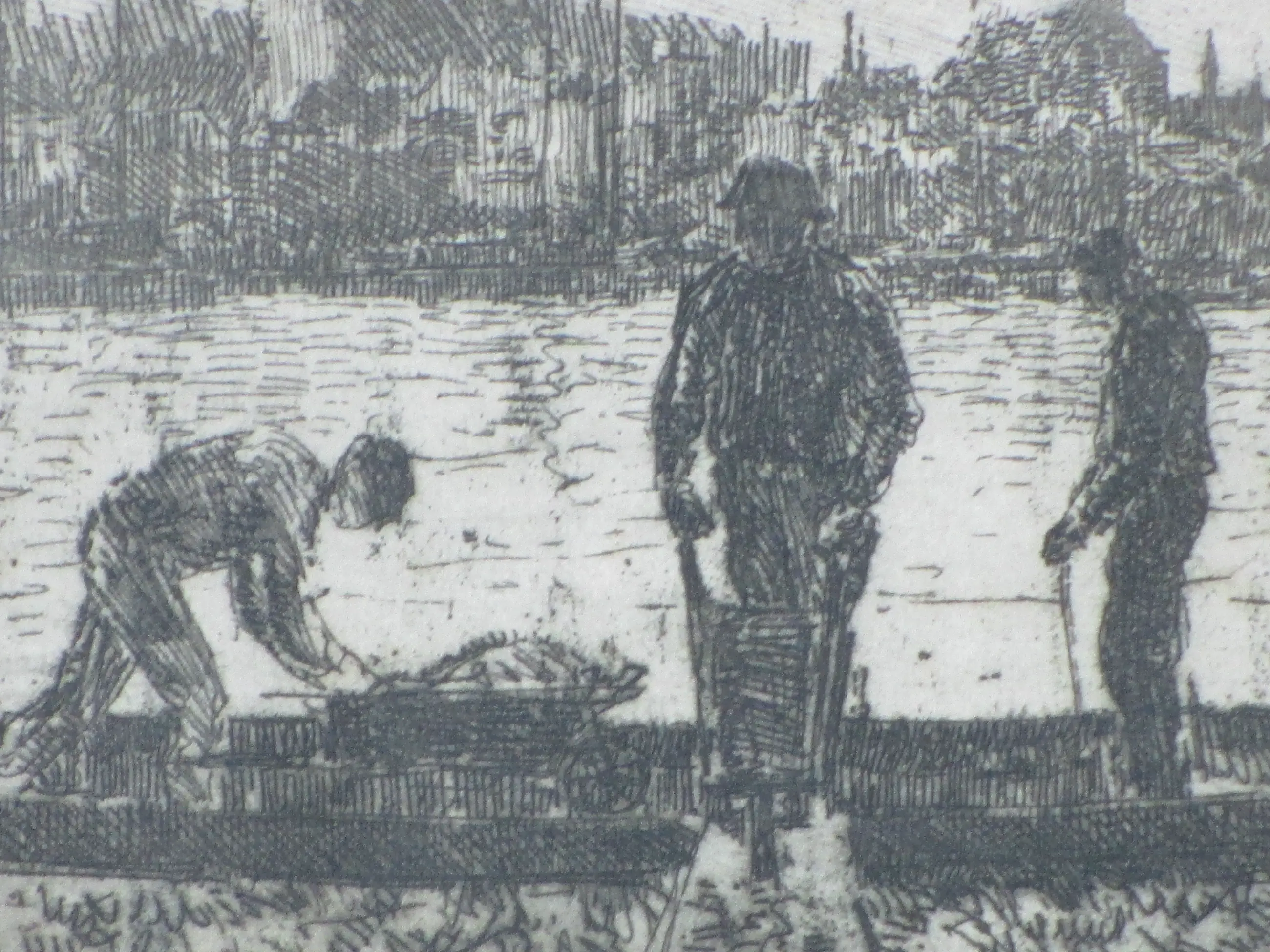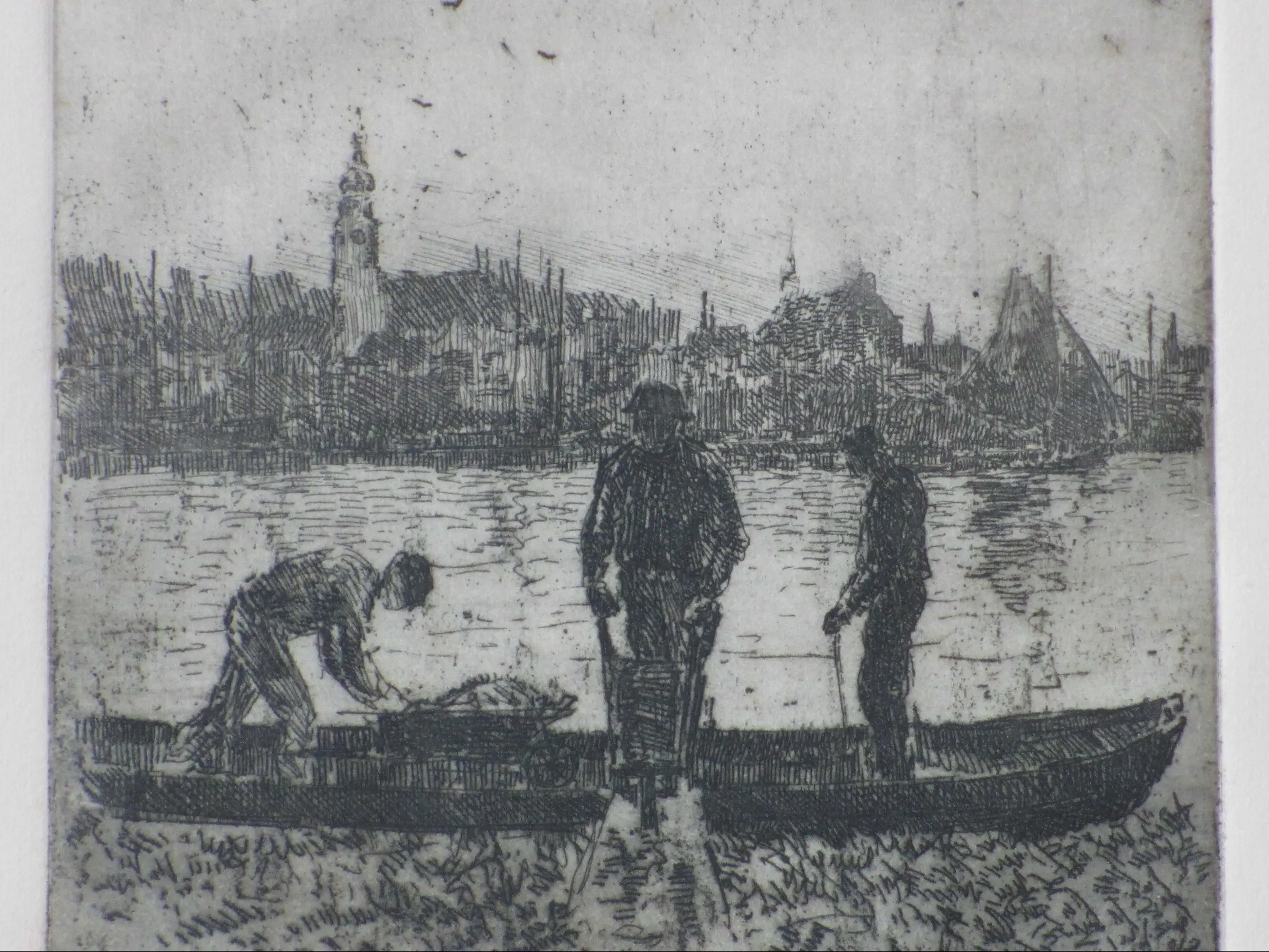 Ets door Martin van Waning Voorstelling van lossende havenarbeiders bij een schuit aan de rivier Losbladig, beeldmaat 20x15, bladmaat 33x24 Gesigneerd in potlood r.o.: 'Martin van Waning' Gemonogrammeerd in de druk l.o.: 'MvW' Authenticiteit volledig gegarandeerd