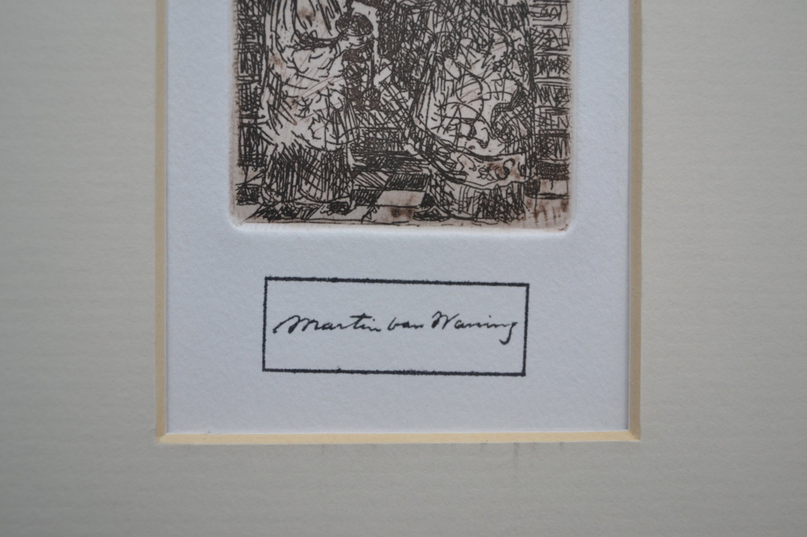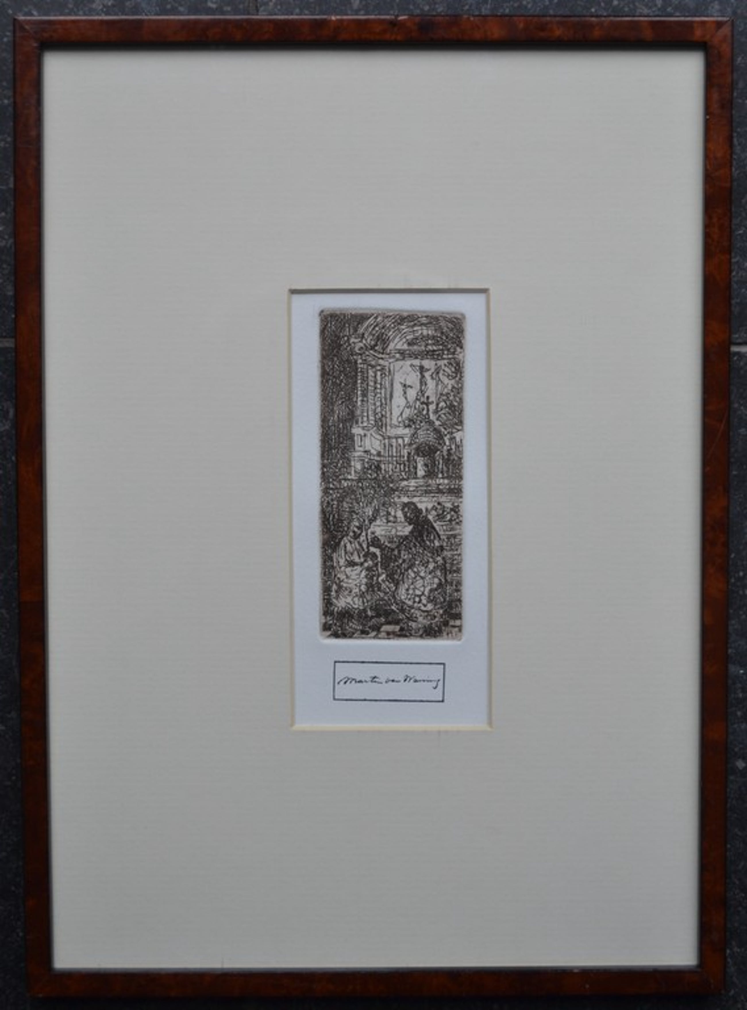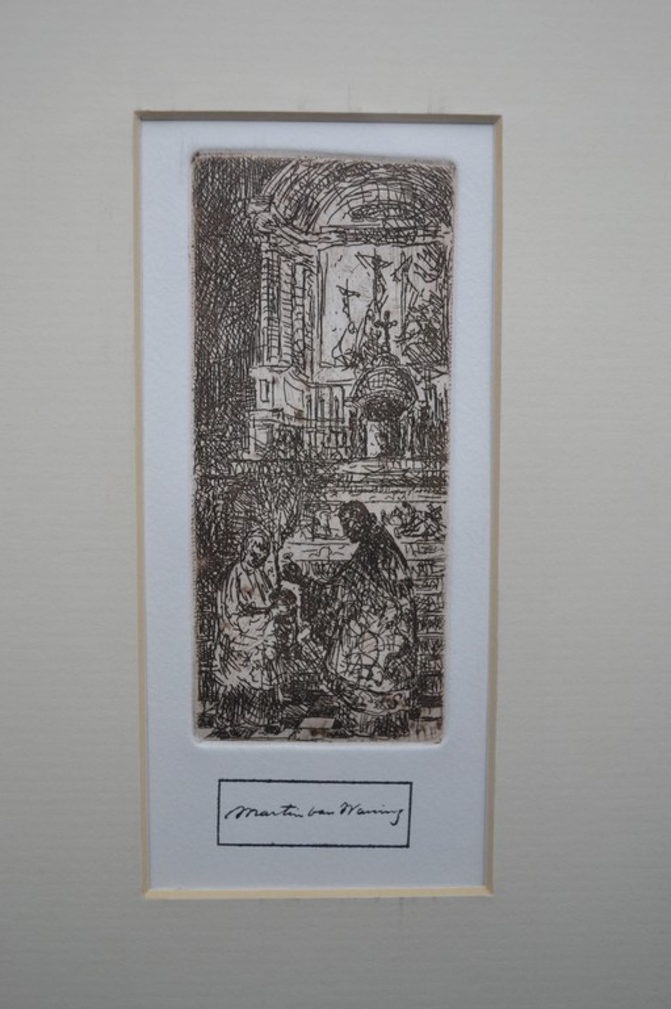 Fraaie ets van Martin van Waning. Betreft een religieuze voorstelling. De ets is voorzien van het ateliersstempel onder het werk. In fraaie conditie. Met passe-partout in wortelnotenhouten lijst. Buitenmaat 35 x 25 cm. Binnenmaat 12 x 5 cm.
