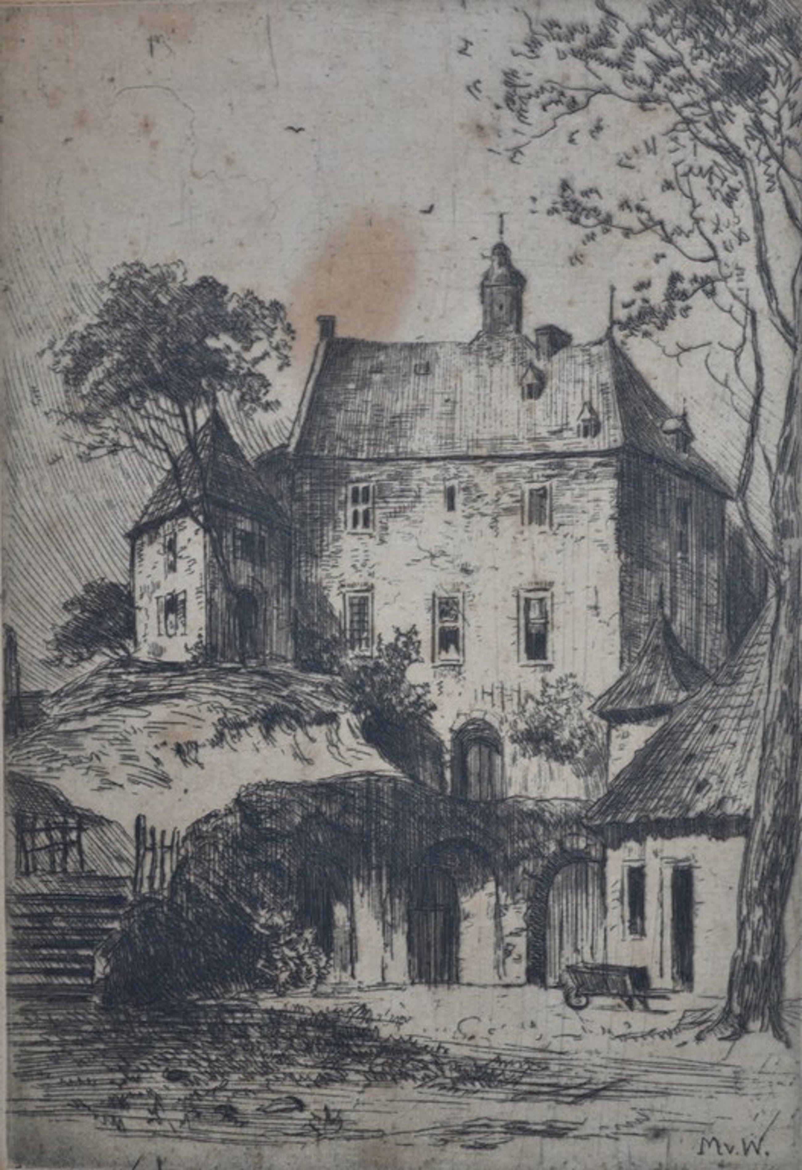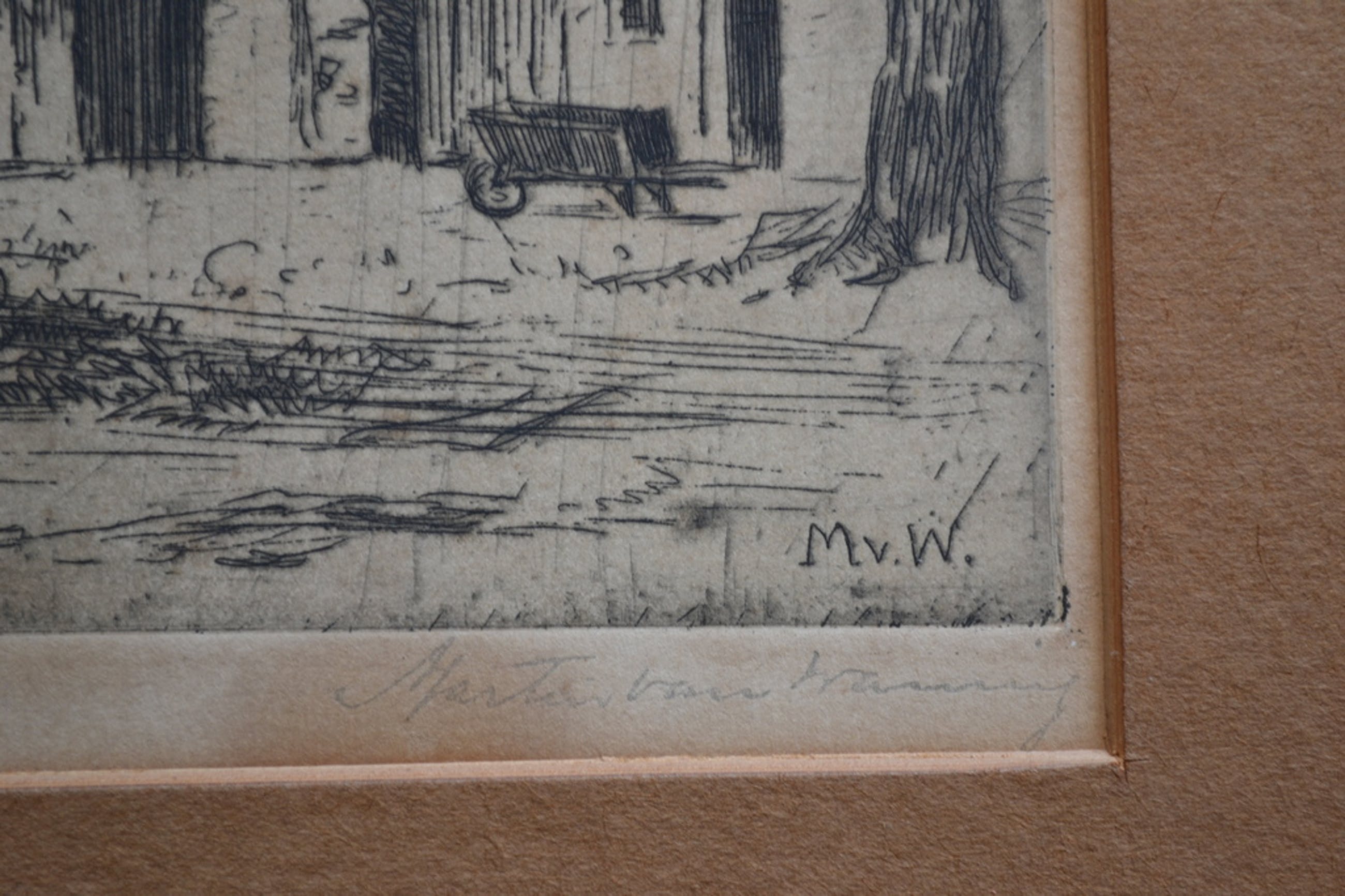 Fraaie ets van de Martin van Waning. Rechtsonder zowel in de plaat als in potlood gesigneerd. Ets heeft paar lichte verkleuringen (zie foto's) maar is verder in mooie staat. In lijstje achter glas.