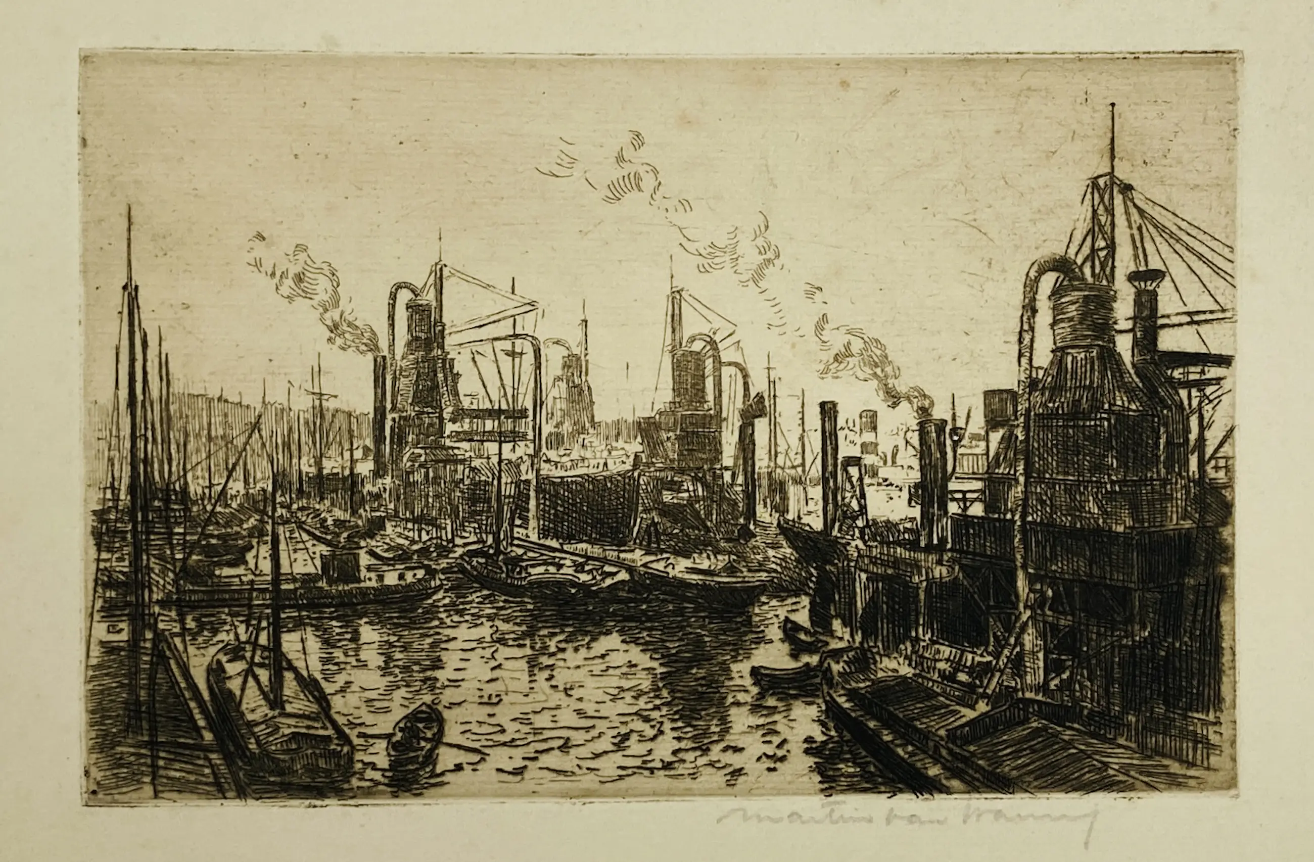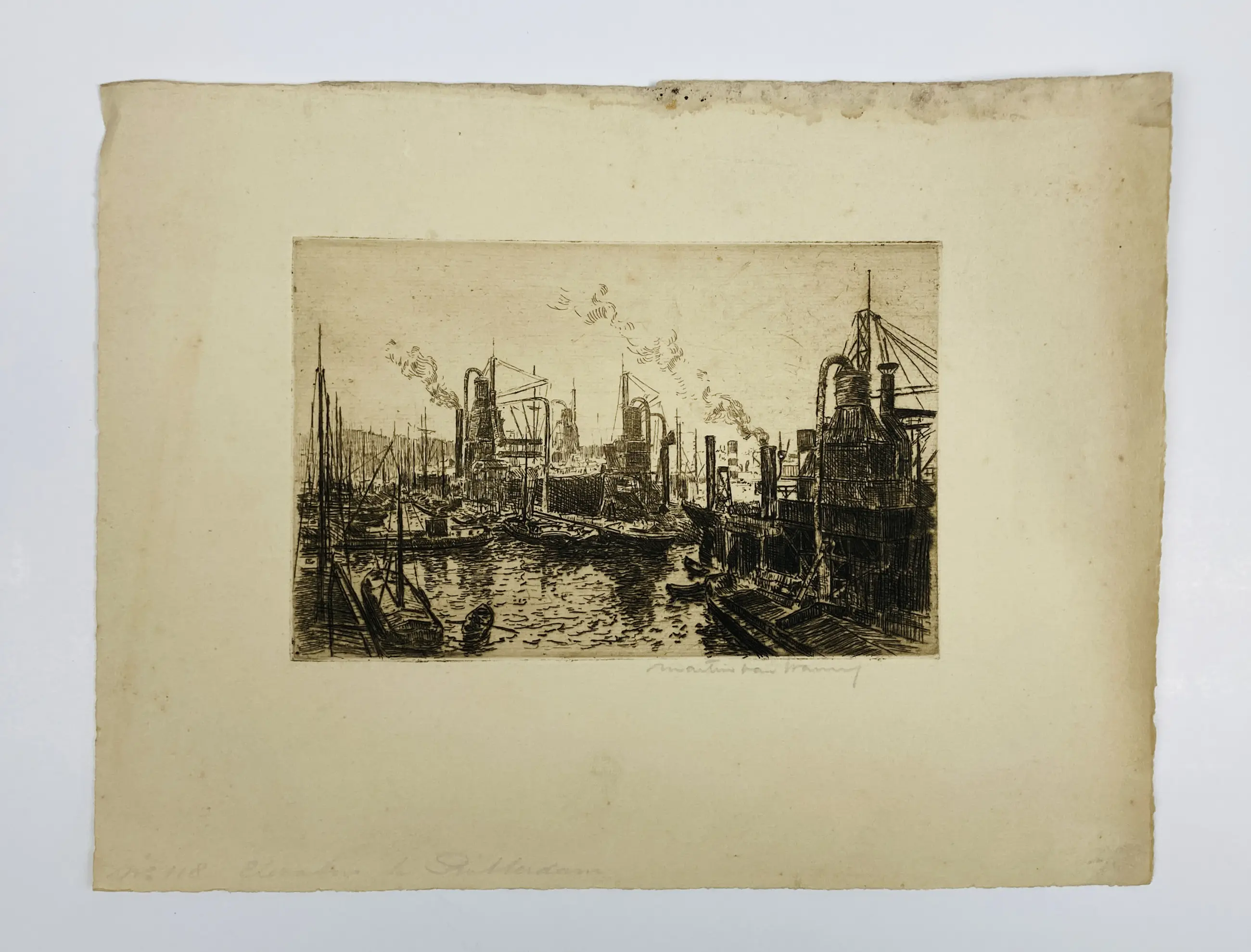 Een gave ets van de Nederlandse kunstenaar Martin van Waning (1889 - 1972). Het werk verkeert in goede conditie en is handgesigneerd door de kunstenaar. In de wit rand zitten wat kleine vlekjes, maar dat kan wegvallen door een nieuwe passe-partout.