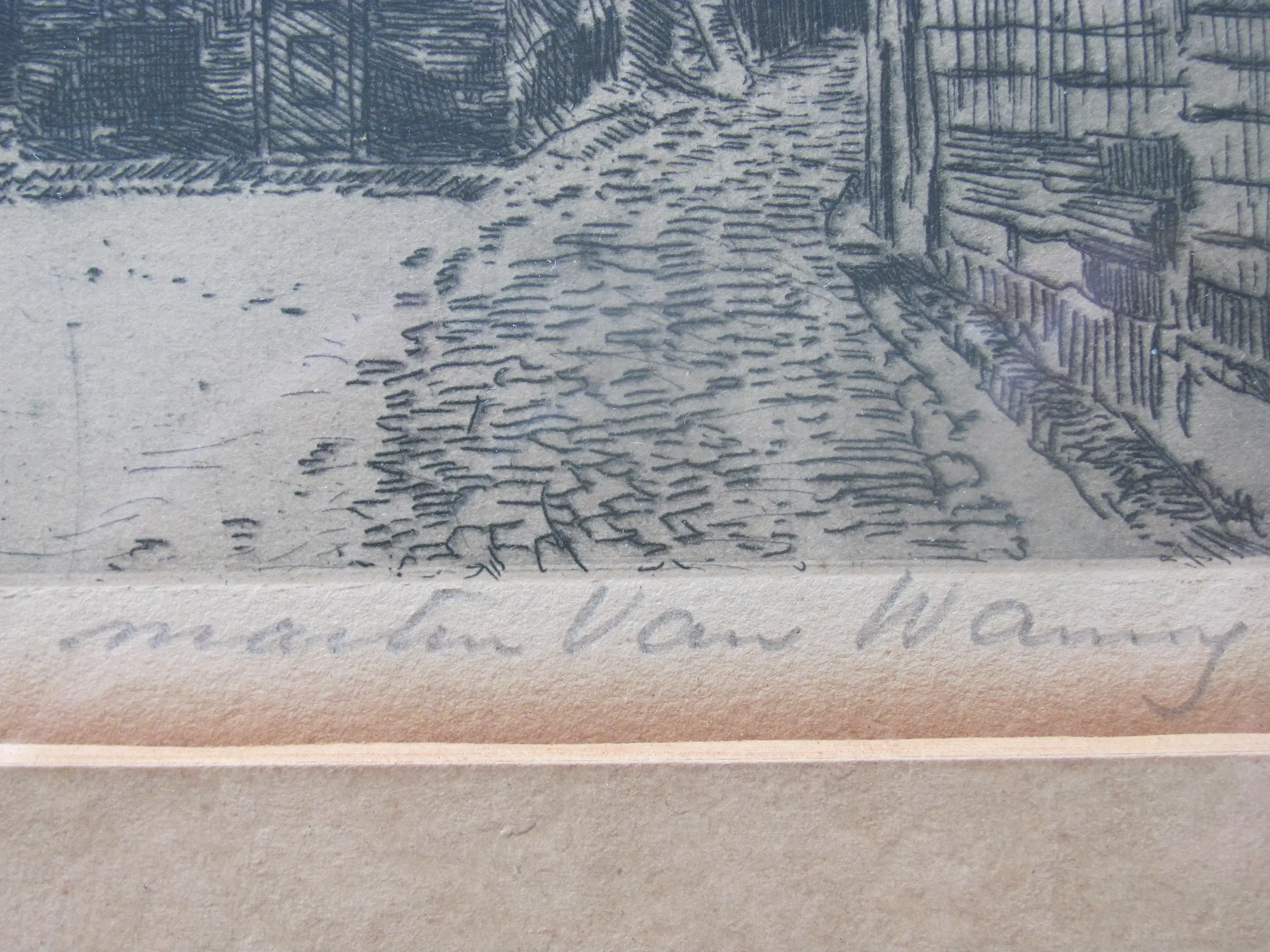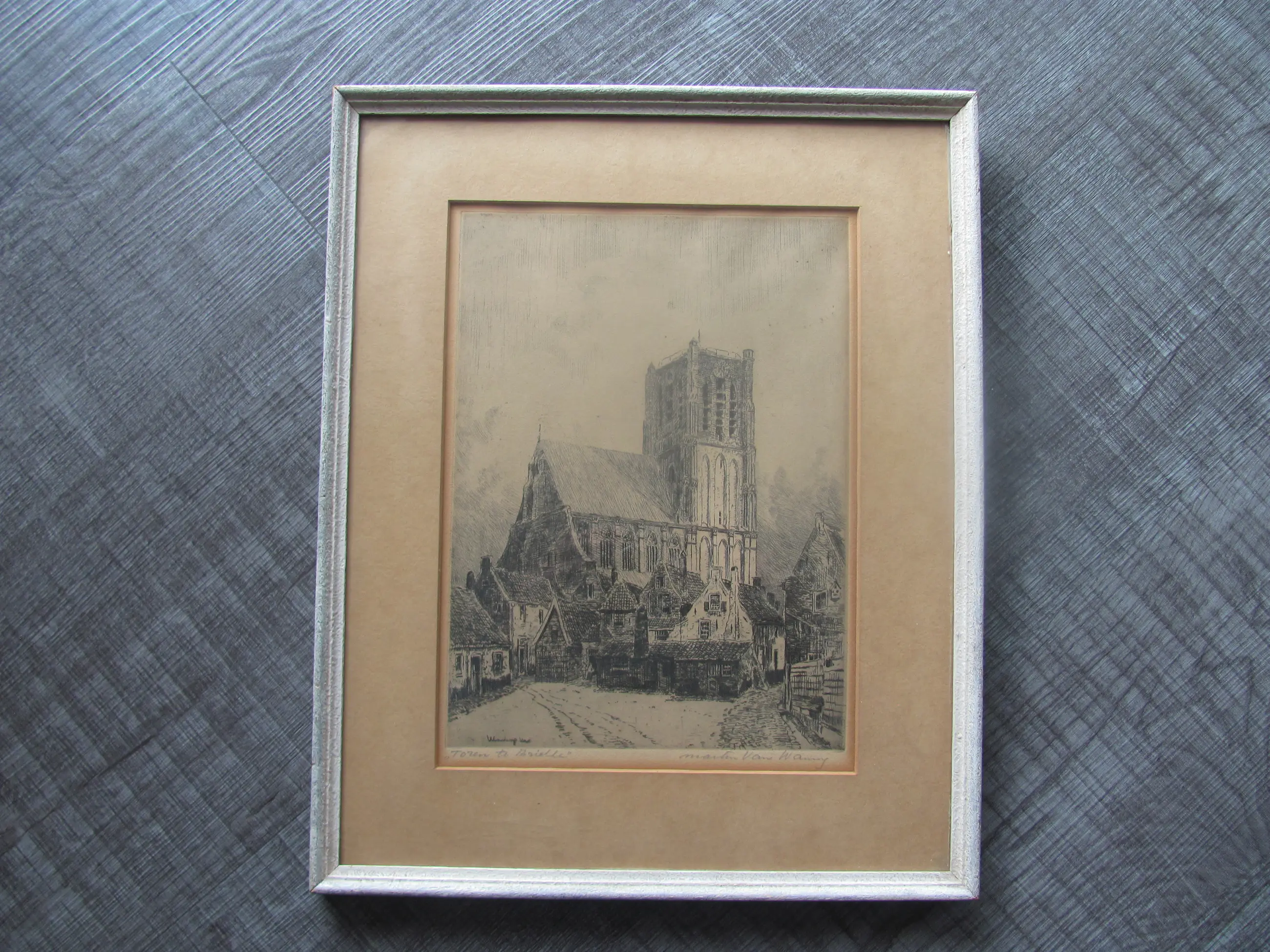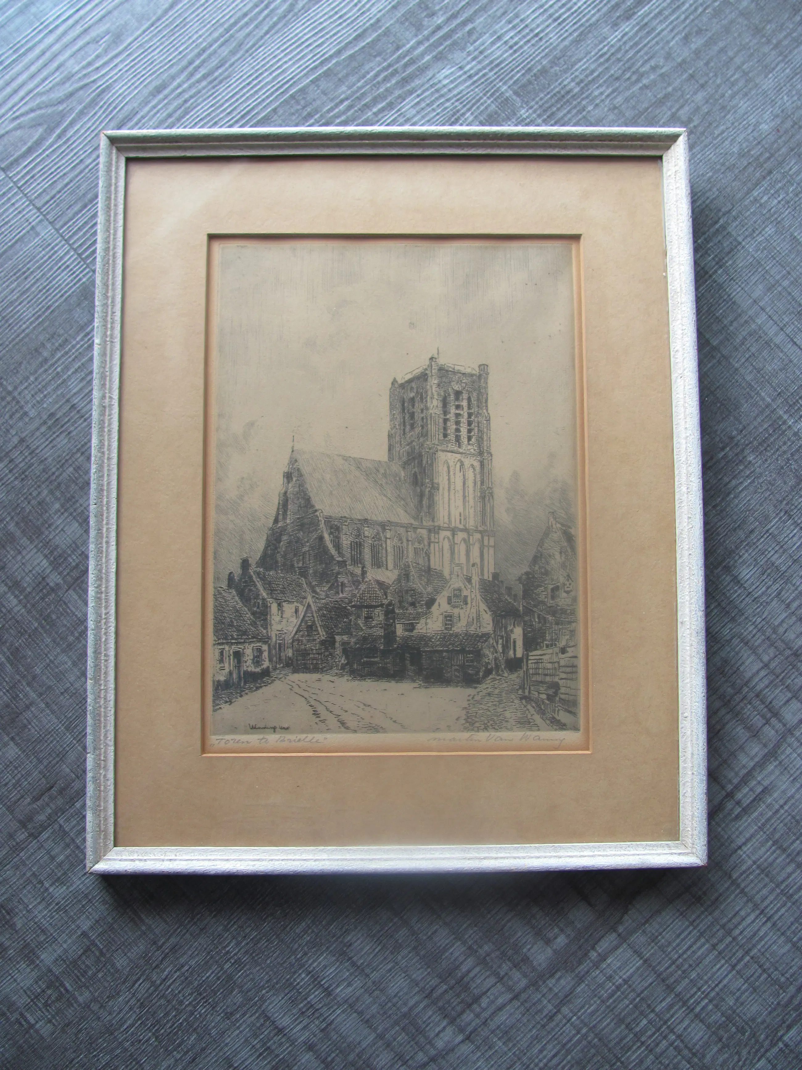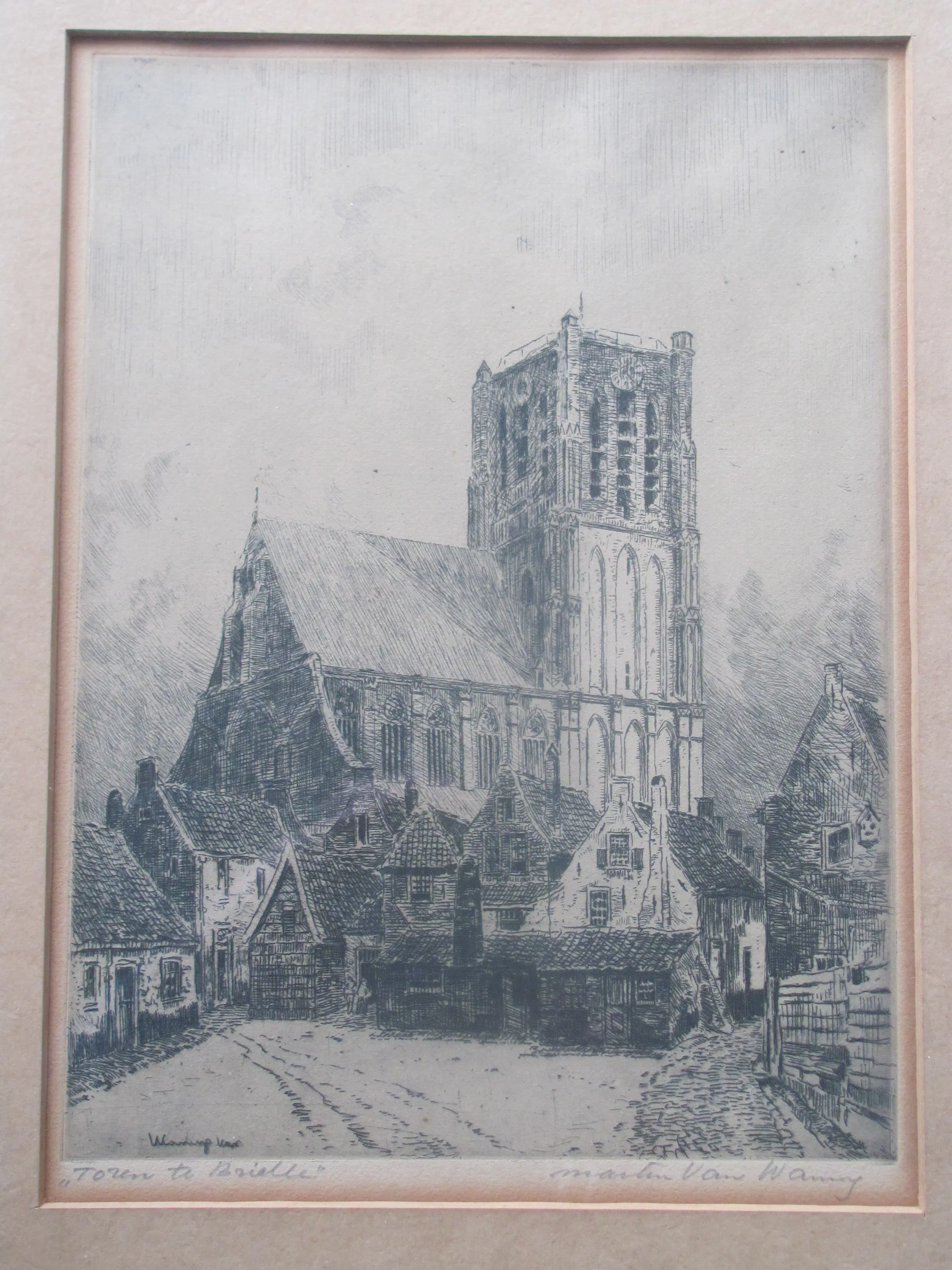 Ets van Martin van Waning in de originele lijst en passe-partout. Linksonder met potlood "Toren te Brielle". Rechtsonder met potlood Martin van Waning.