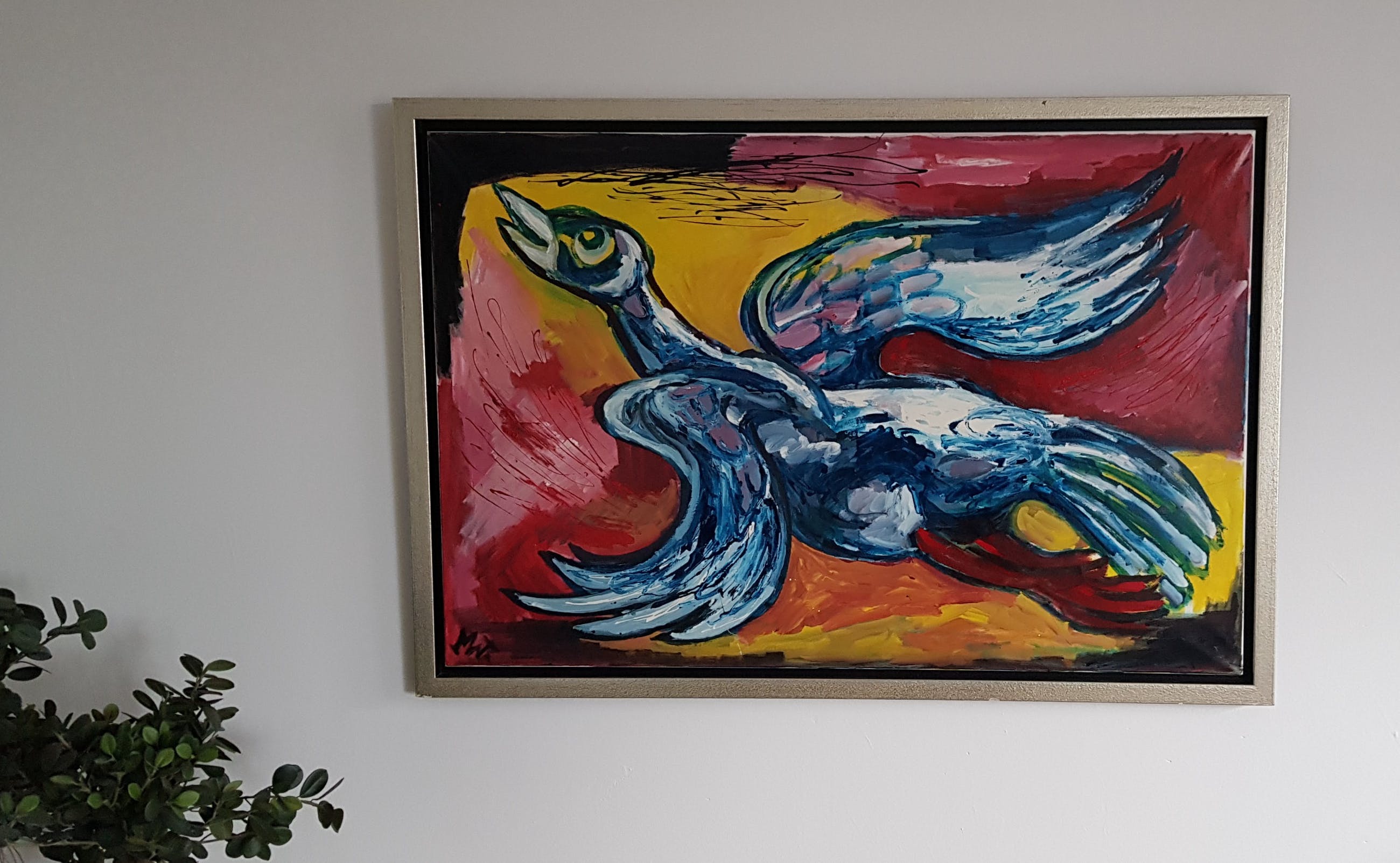 Martin van Wordragen, Opvliegende vogel. Origineel werk op doek (gemengde techniek), ingelijst 130 x 90 cm, doekformaat 120 x 80 cm. Met oevreboek.
