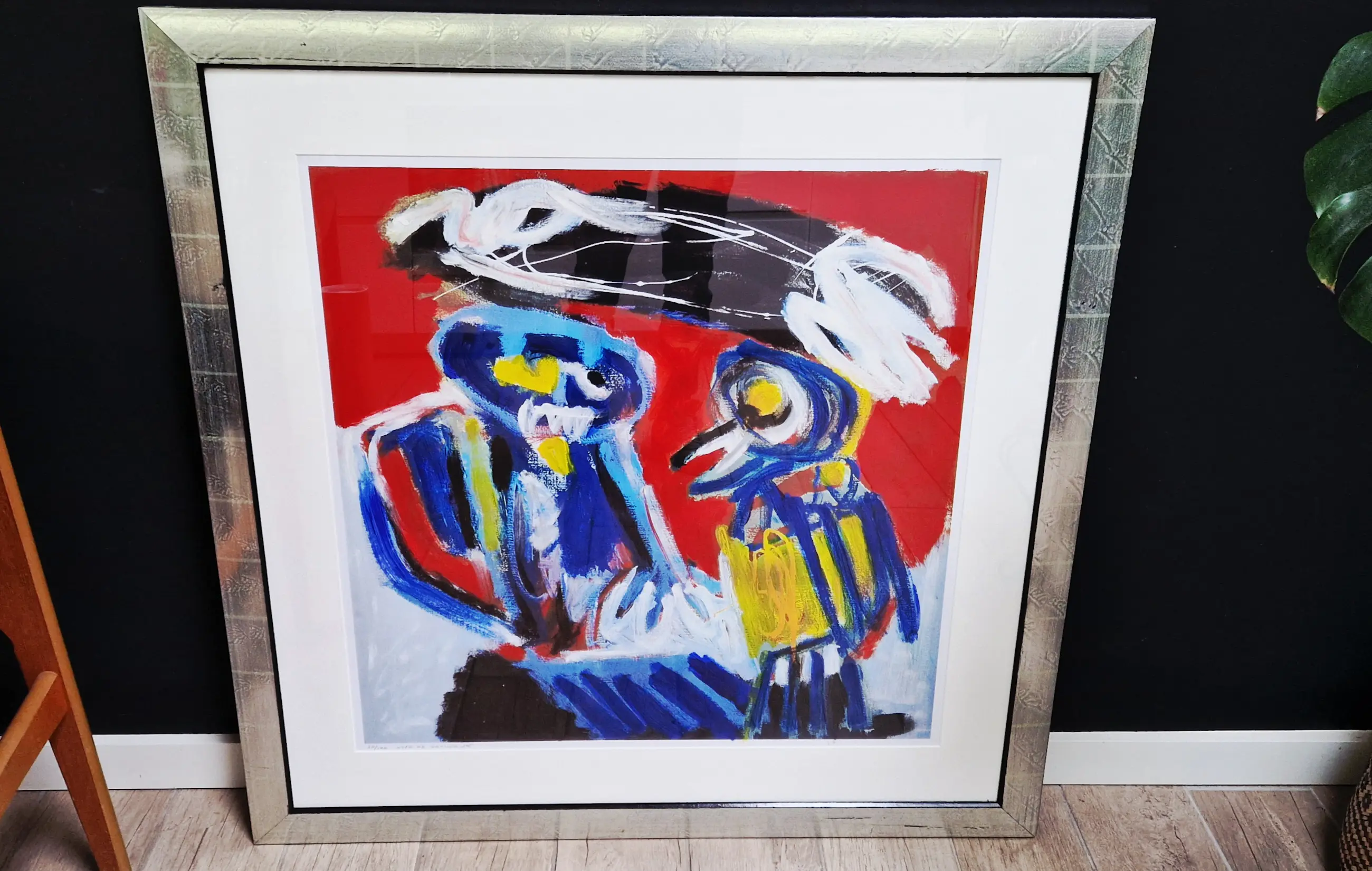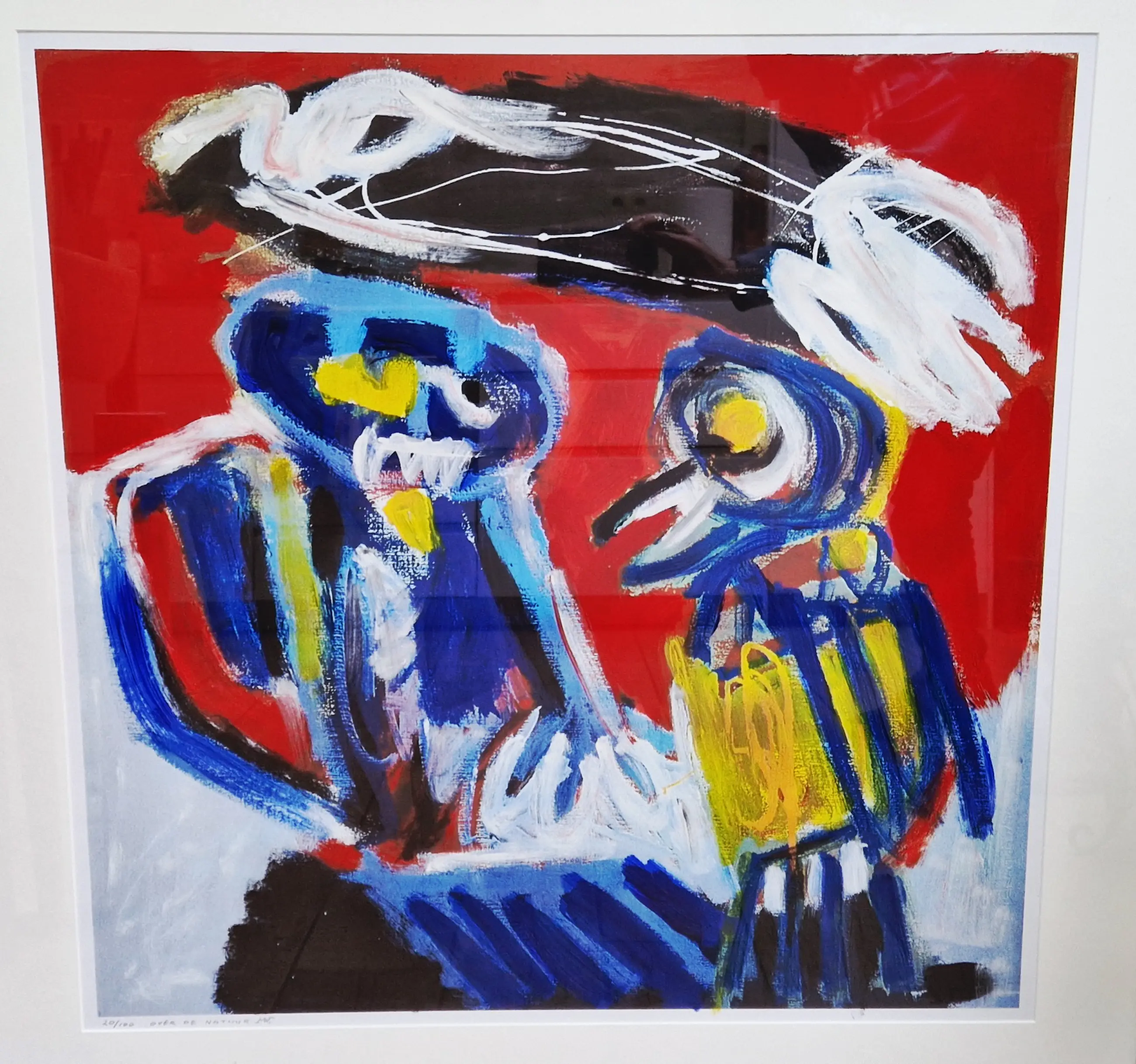 Fraaie en bijzonder grote zeefdruk (1 van de 5 bestaande) van de Nederlandse Cobra-kunstenaar Martin van Wordragen. Afmetingen 100x100, 73x73. Op gesatineerd papier.