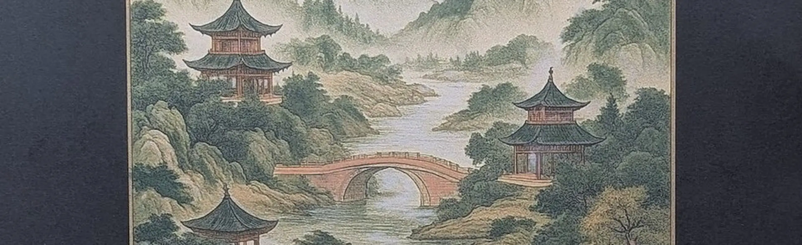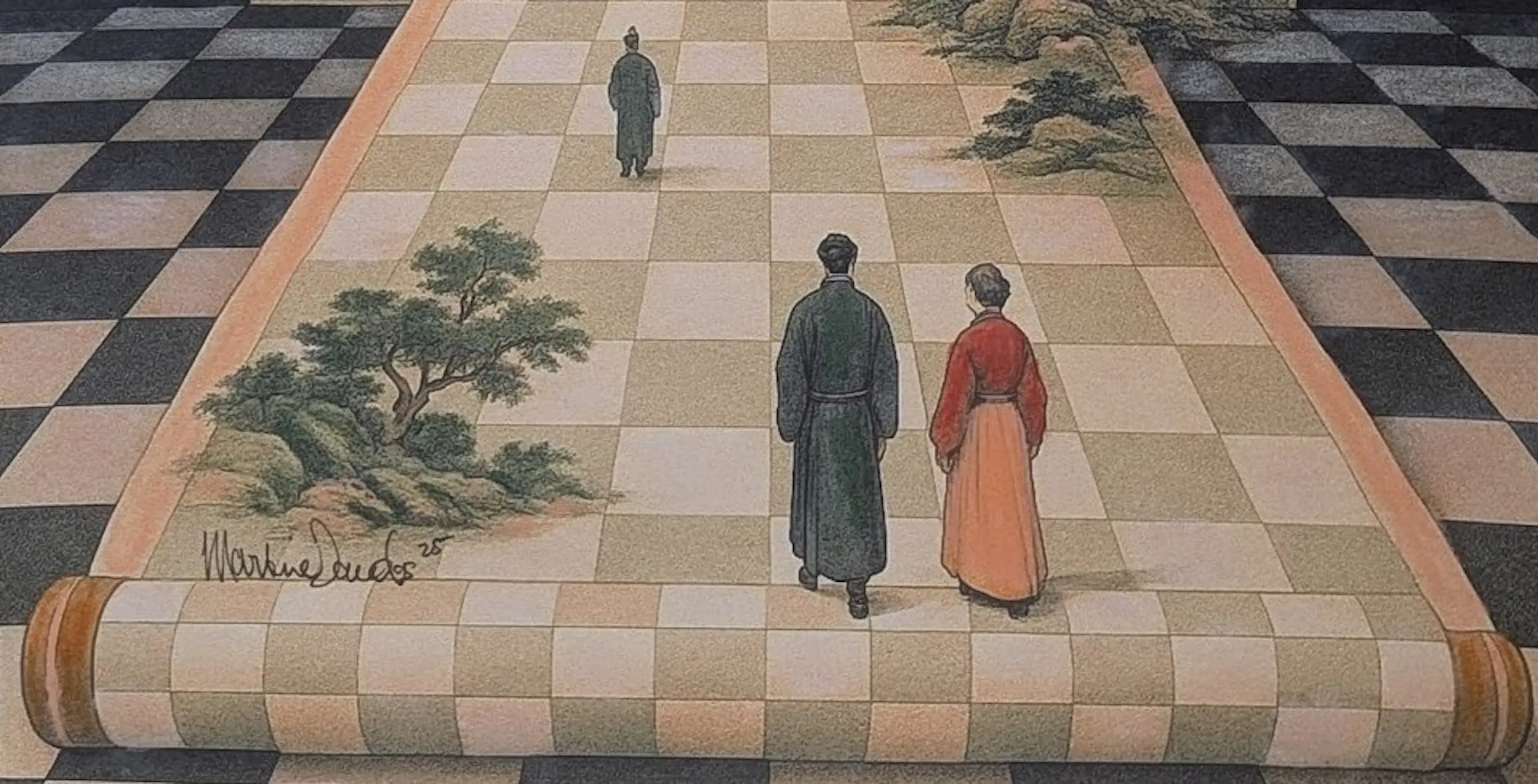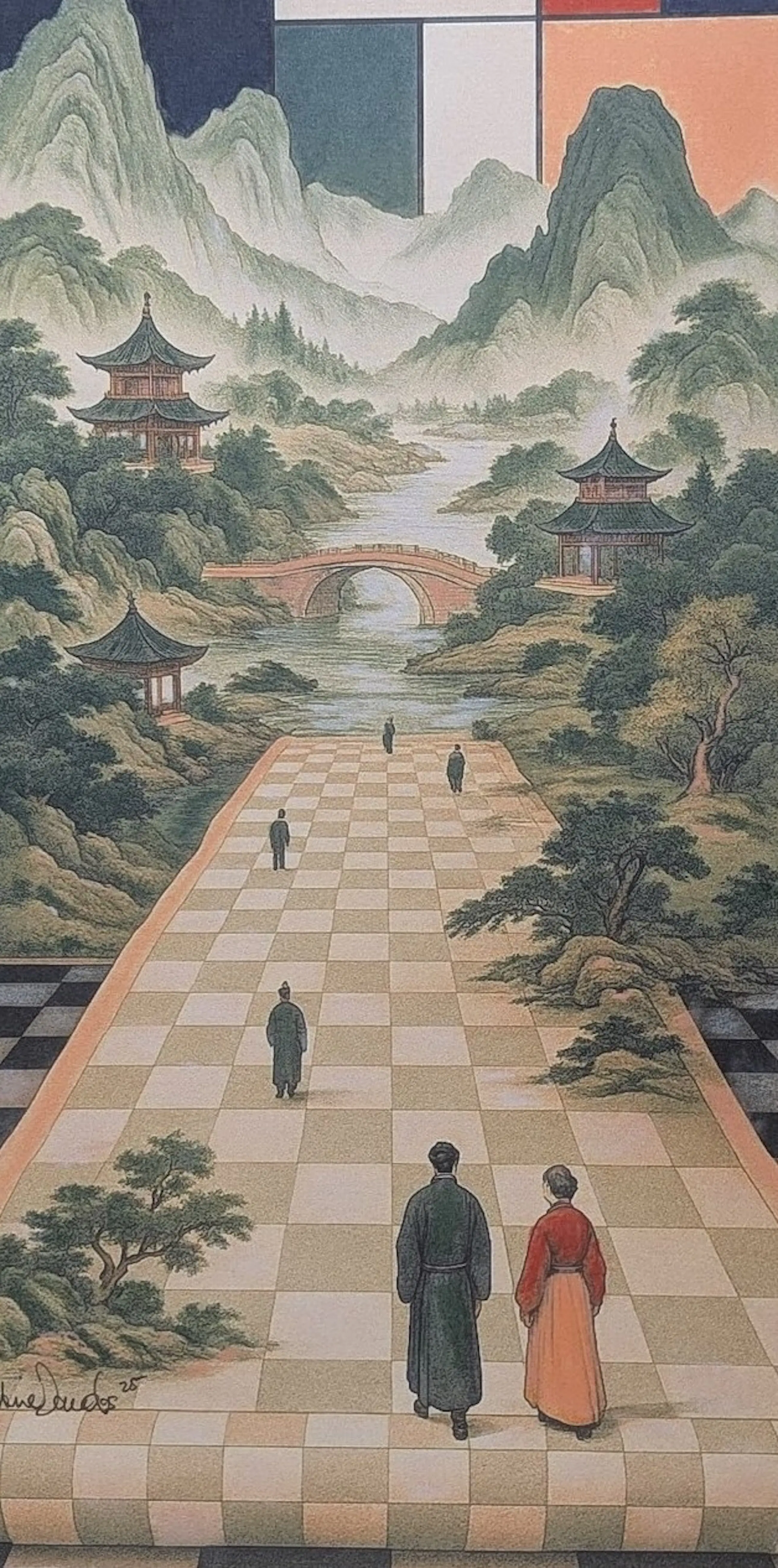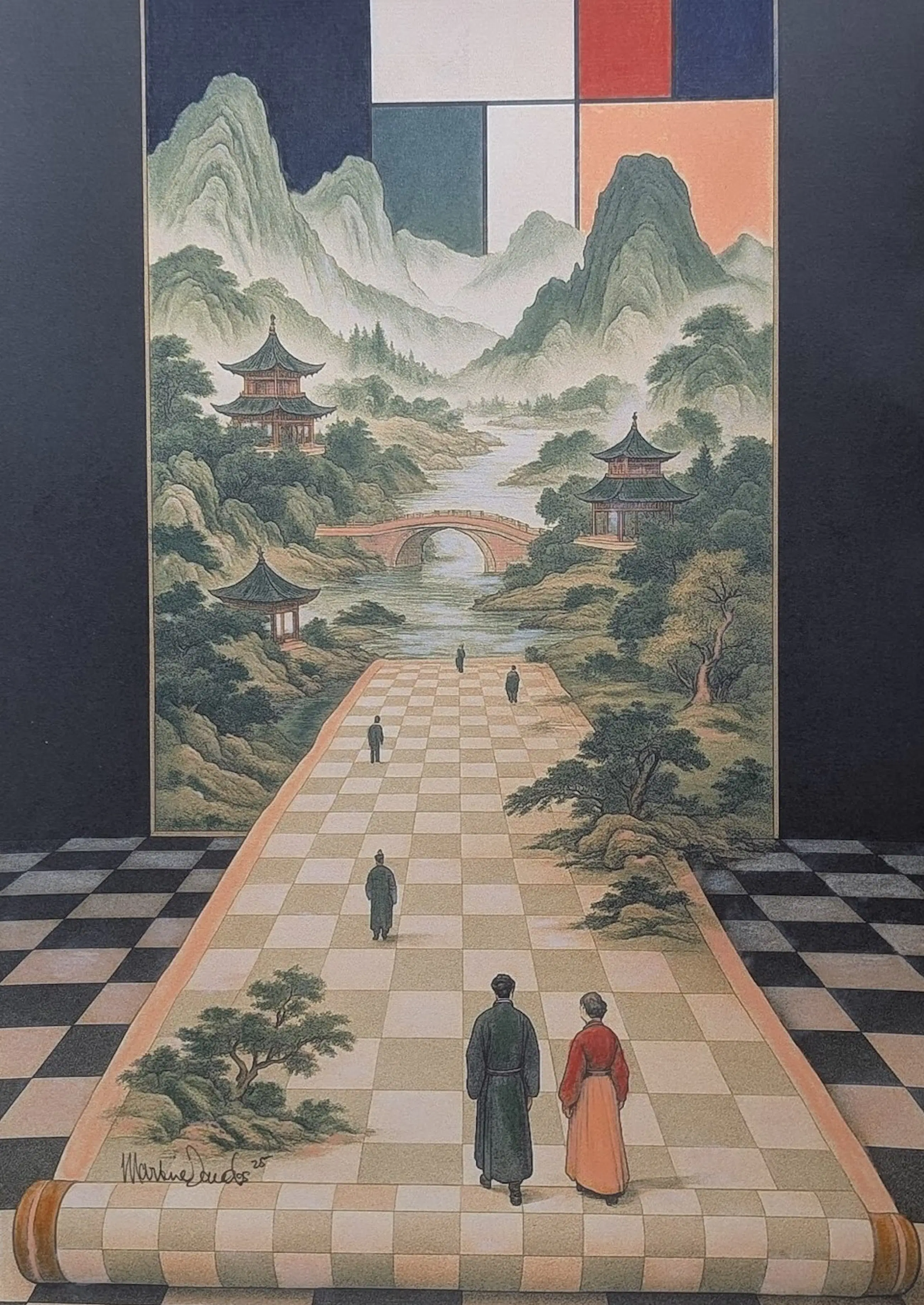 “Dit werk is een visuele pelgrimage. De scroll die zich ontvouwt is niet slechts papier, maar een pad van herinnering en bewustzijn. Ik heb traditionele Oost-Aziatische landschappen verweven met moderne symboliek om de reis van de ziel te verbeelden—van het aardse naar het etherische. De figuren in klassieke kledij zijn niet alleen wandelaars, maar dragers van wijsheid, reizigers tussen werelden. De vier kleurvlakken boven het landschap symboliseren de elementen van transformatie: wit voor zuiverheid, blauw voor inzicht, rood voor levenskracht, zwart voor het onbekende.