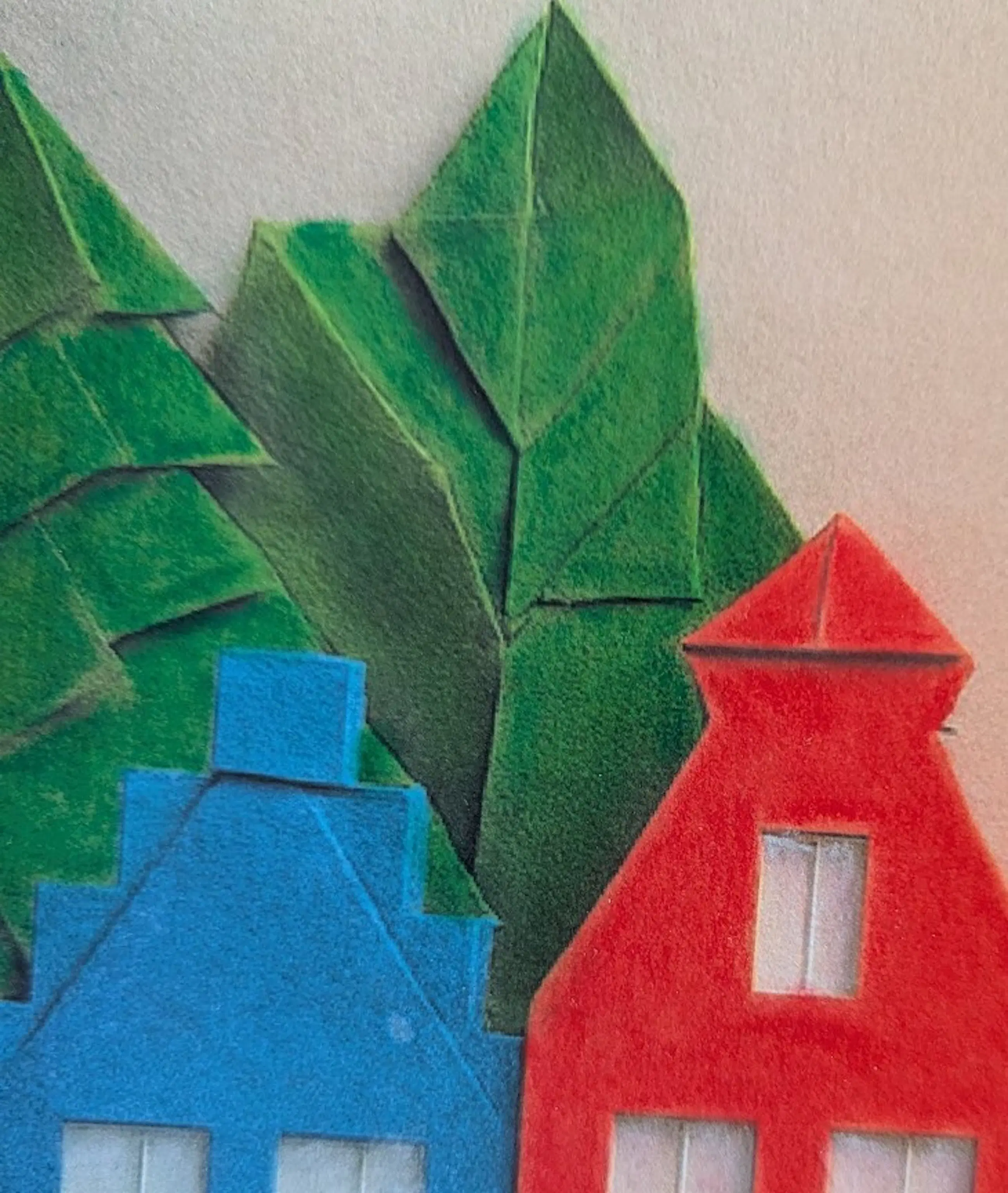 De grachtenpanden zijn hierin de hoofdrolspelers. Ik heb bewust gekozen voor een fel, bijna regenboogkleurenpalet om de anders zo monotone bakstenen gevels van de stad te vrolijken en te laten 'dansen'. Elk huisje is een apart gevouwen element; het snijwerk van de ramen en deuren versterkt het contrast met de gekleurde gevel en geeft de illusie van licht.