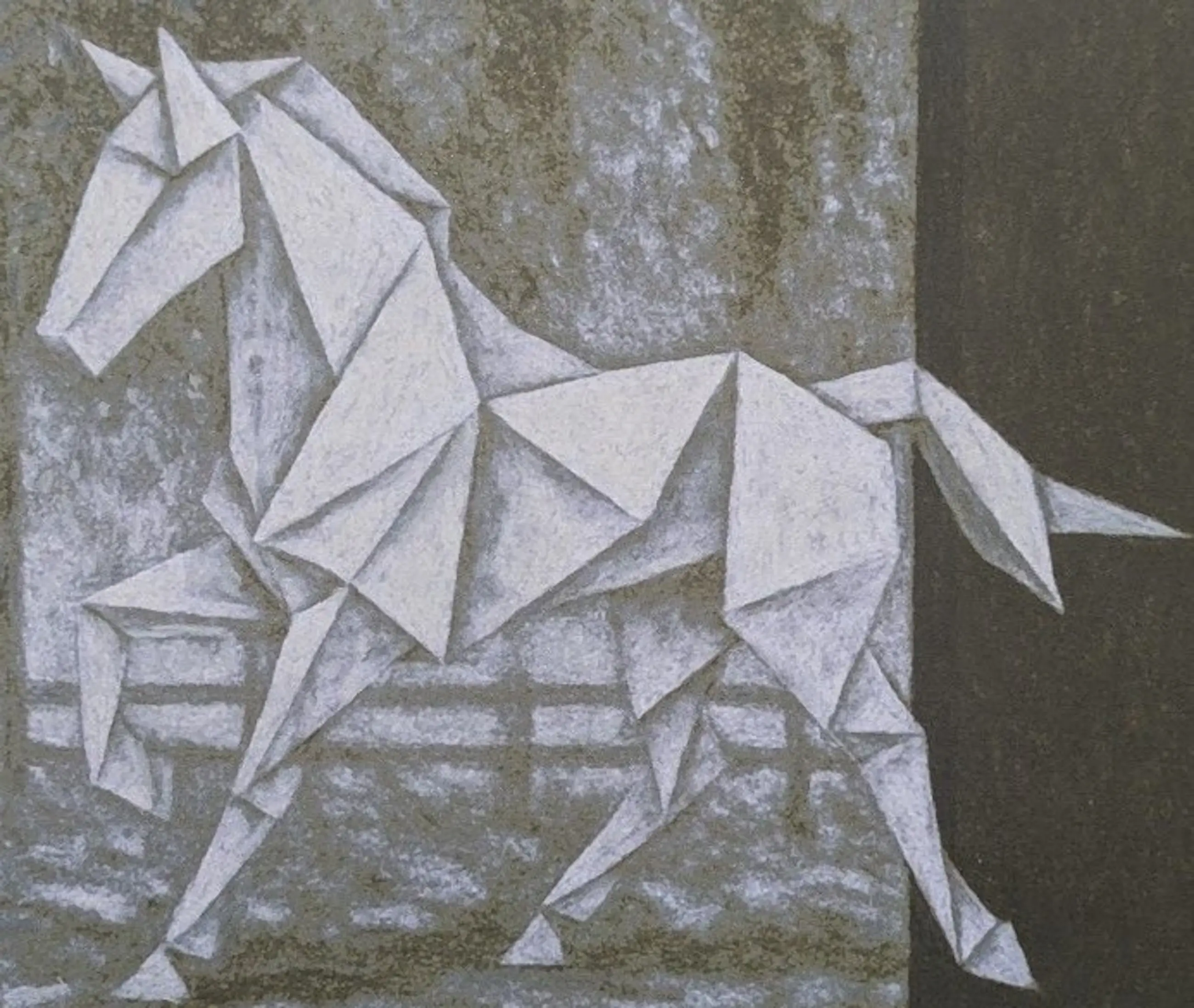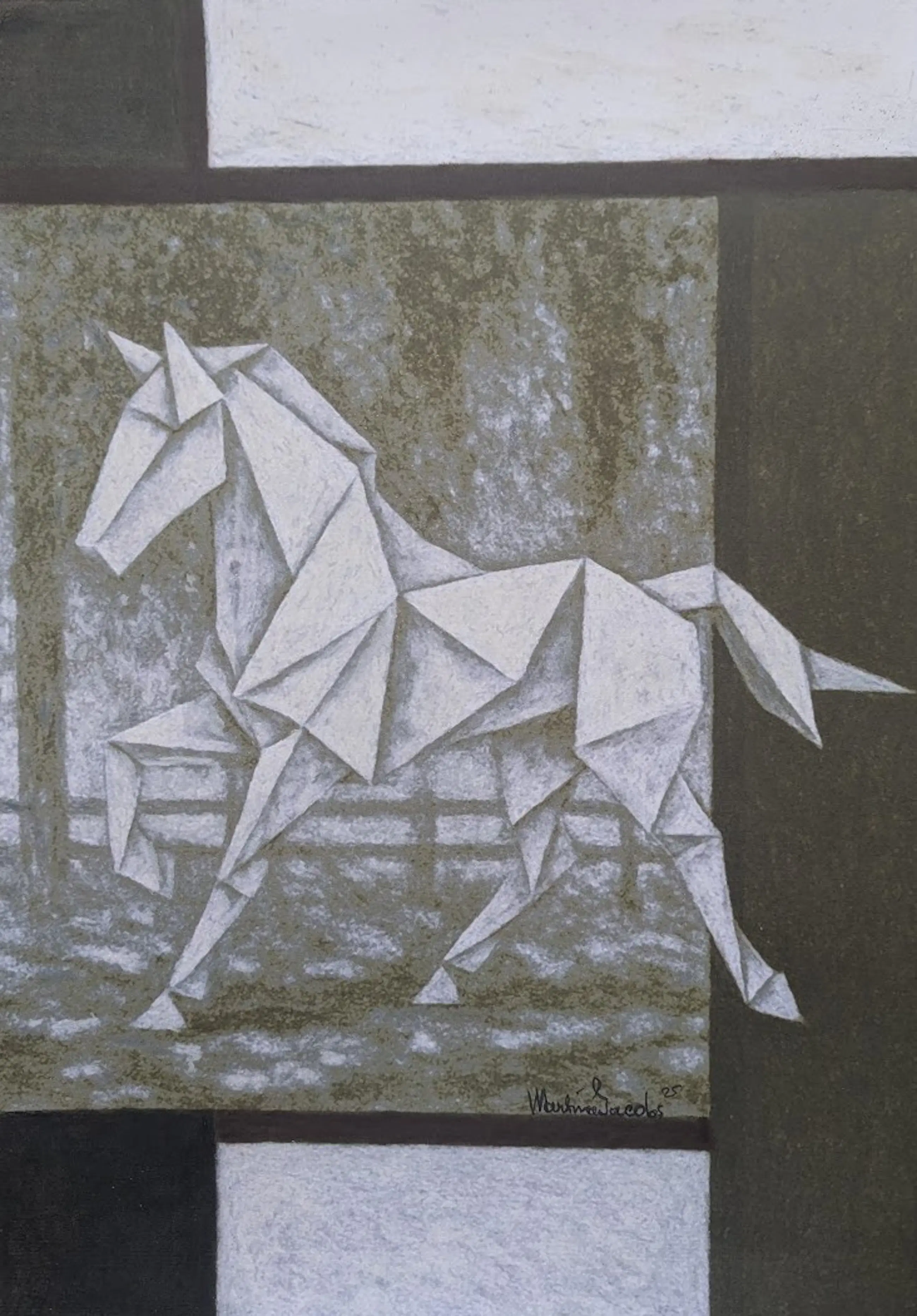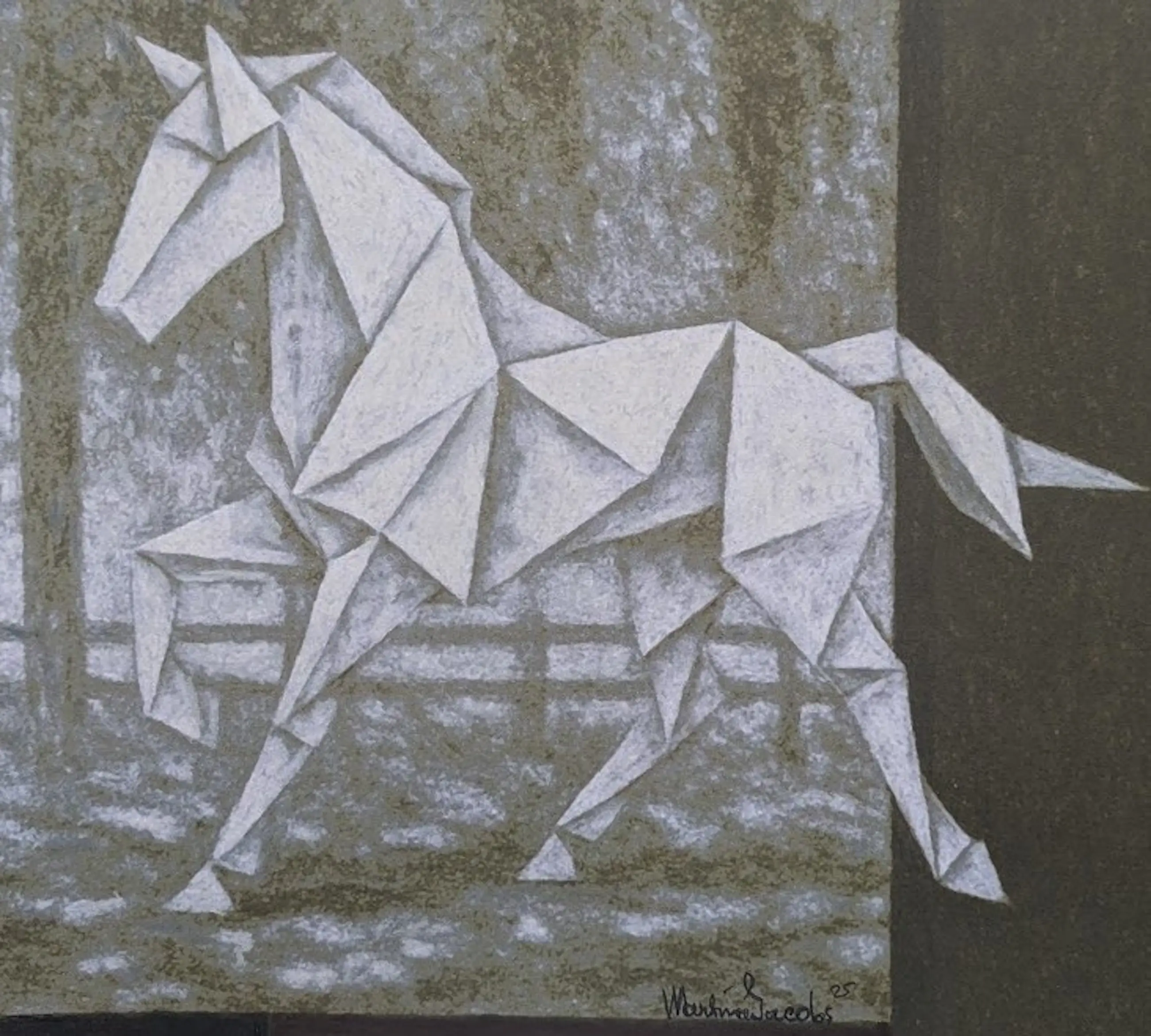 'Gevouwen Beweging' gaat over de balans tussen precieze vormen en levendige energie. Het laat zien hoe zelfs in strakke kunst, vrijheid en kracht te vinden zijn. Ik hoop dat dit werk je zowel de mooie vormen als de levendige beweging van het paard laat voelen."