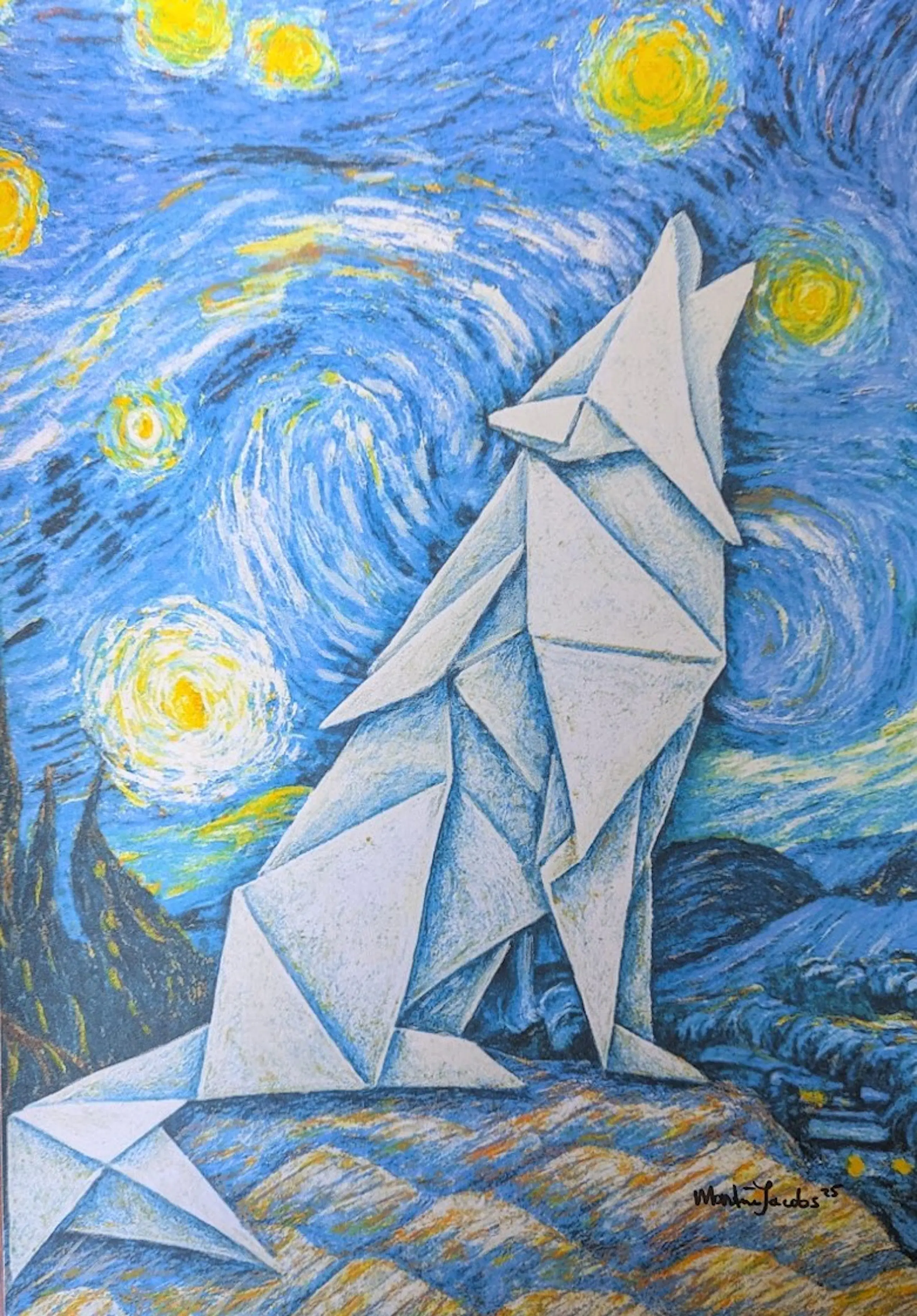 *In dit werk heb ik een wolf gevouwen uit digitale stilte — een geometrisch wezen dat zich beweegt door de melancholische draaikolk van Van Goghs sterrennacht. De wolf is geen dier, maar een getuige: een symbool van innerlijke kracht, van eenzaamheid die niet breekt maar zingt.