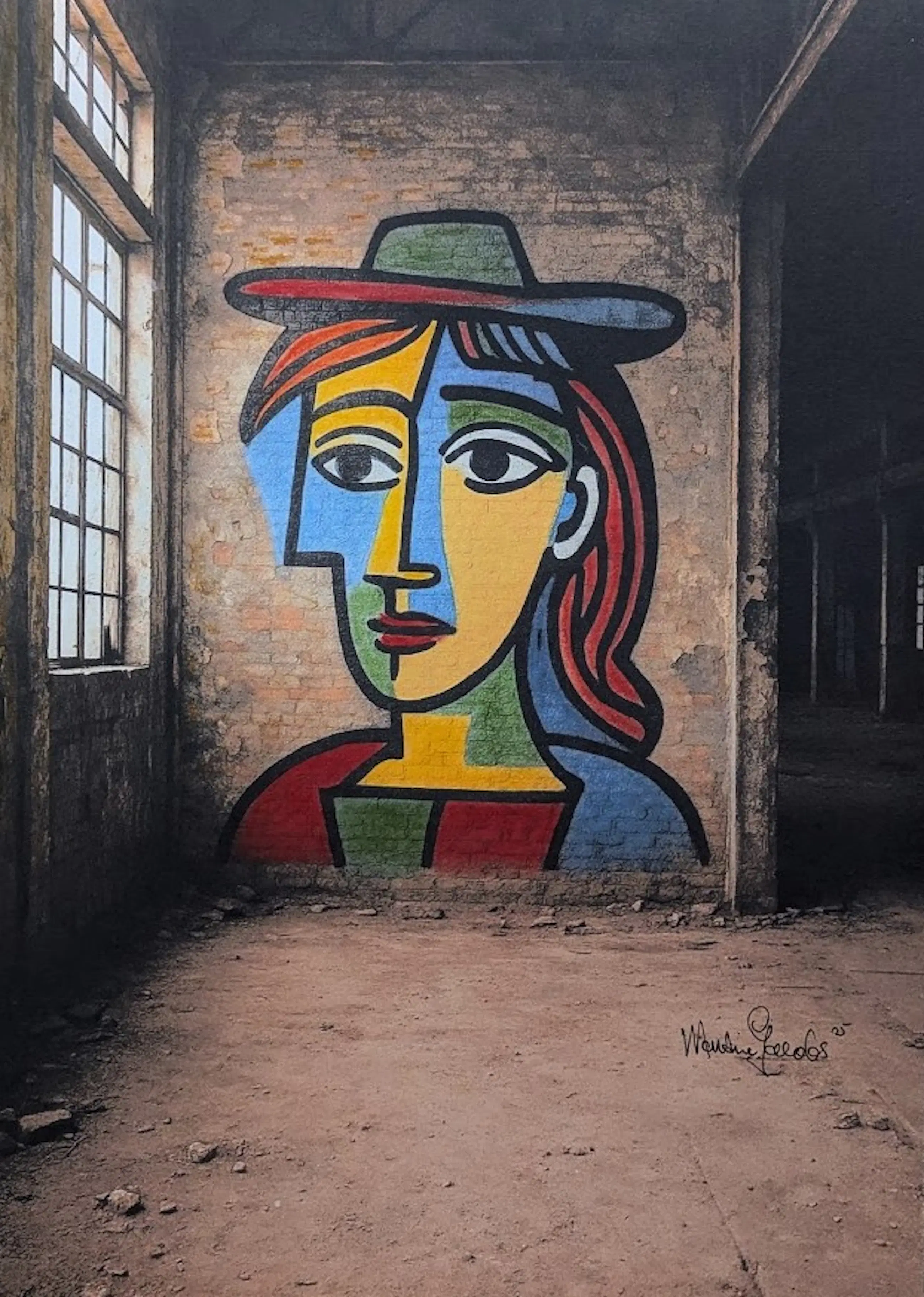Ik tekende dit gezicht niet om schoonheid te vangen, maar om fragmentatie te tonen. De gebroken vormen, de felle kleuren, de geometrie — ze zijn echo’s van een wereld die zichzelf niet meer herkent. Deze muur, ooit deel van een levendige fabriek, is nu een ruïne. Maar juist hier, tussen stof en stilte, wilde ik leven injecteren. Niet nostalgie, maar confrontatie."