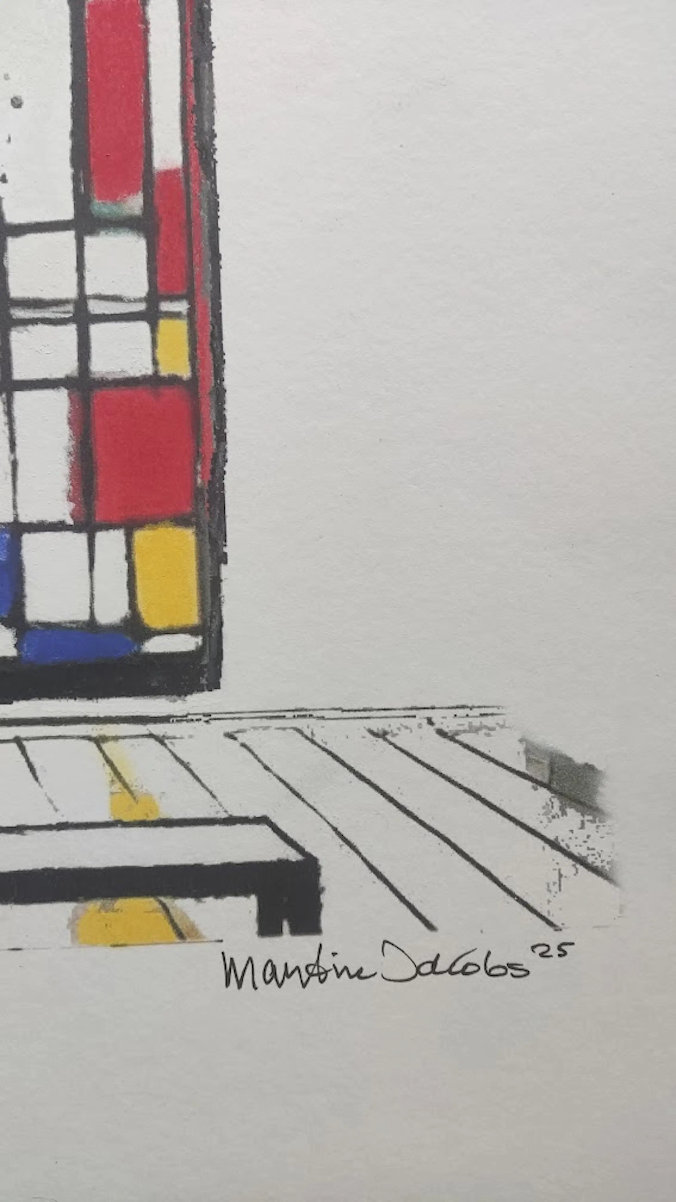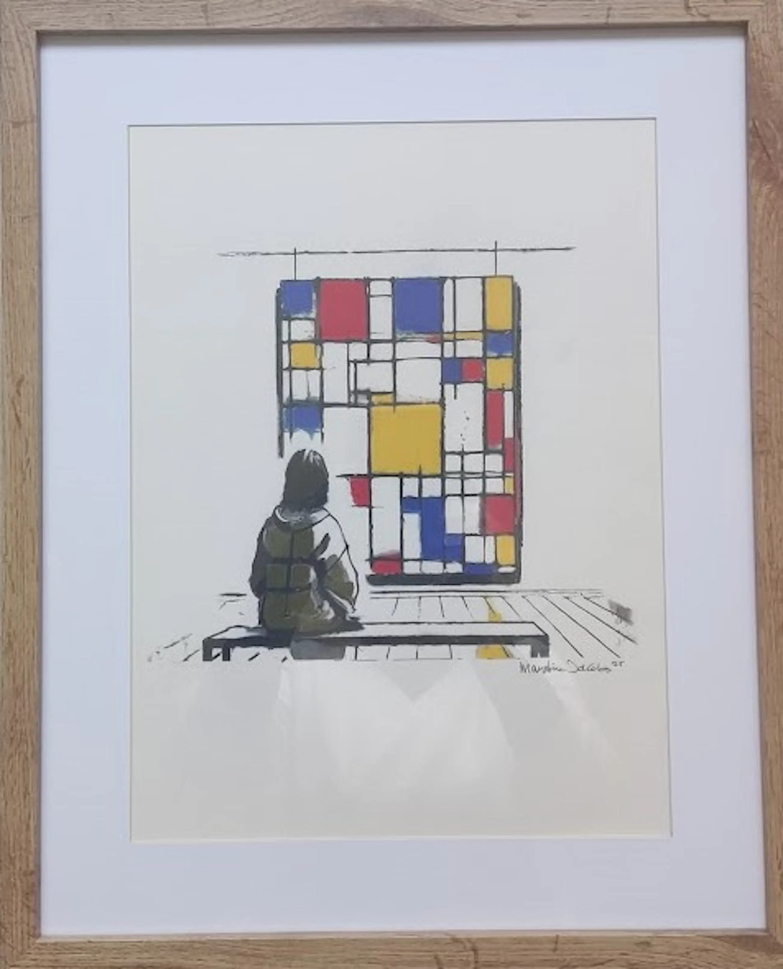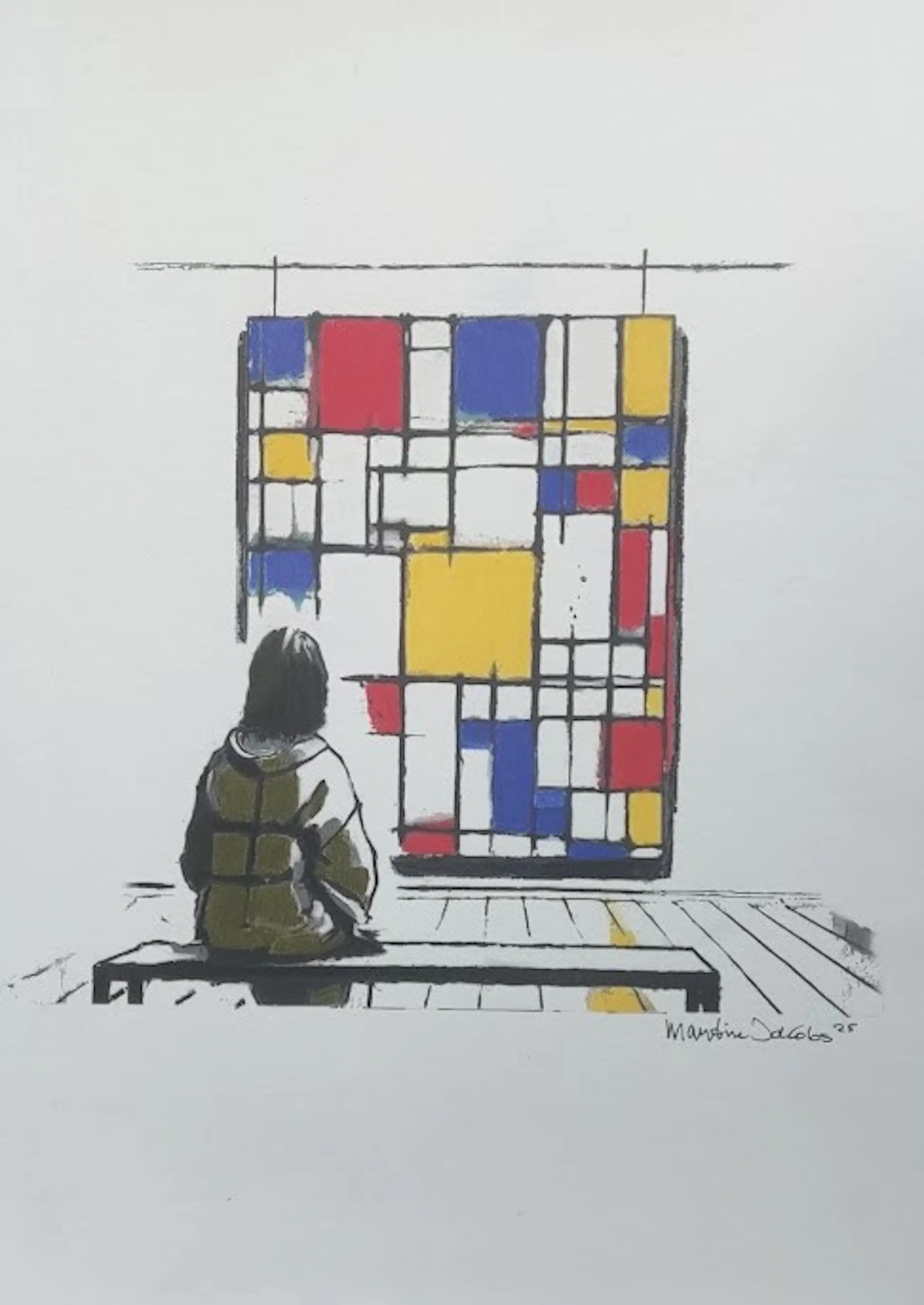 "In dit pastel wilde ik de magie van kunstbeleving vastleggen. Ik zie een toeschouwer in stilte een werk van Mondriaan bewonderen. De strakke lijnen en primaire kleuren springen eruit, terwijl zachte pasteltinten een dromerige sfeer creëren. Voor mij gaat dit werk over die verwondering – dat moment waarop kunst je even meeneemt naar een andere wereld."