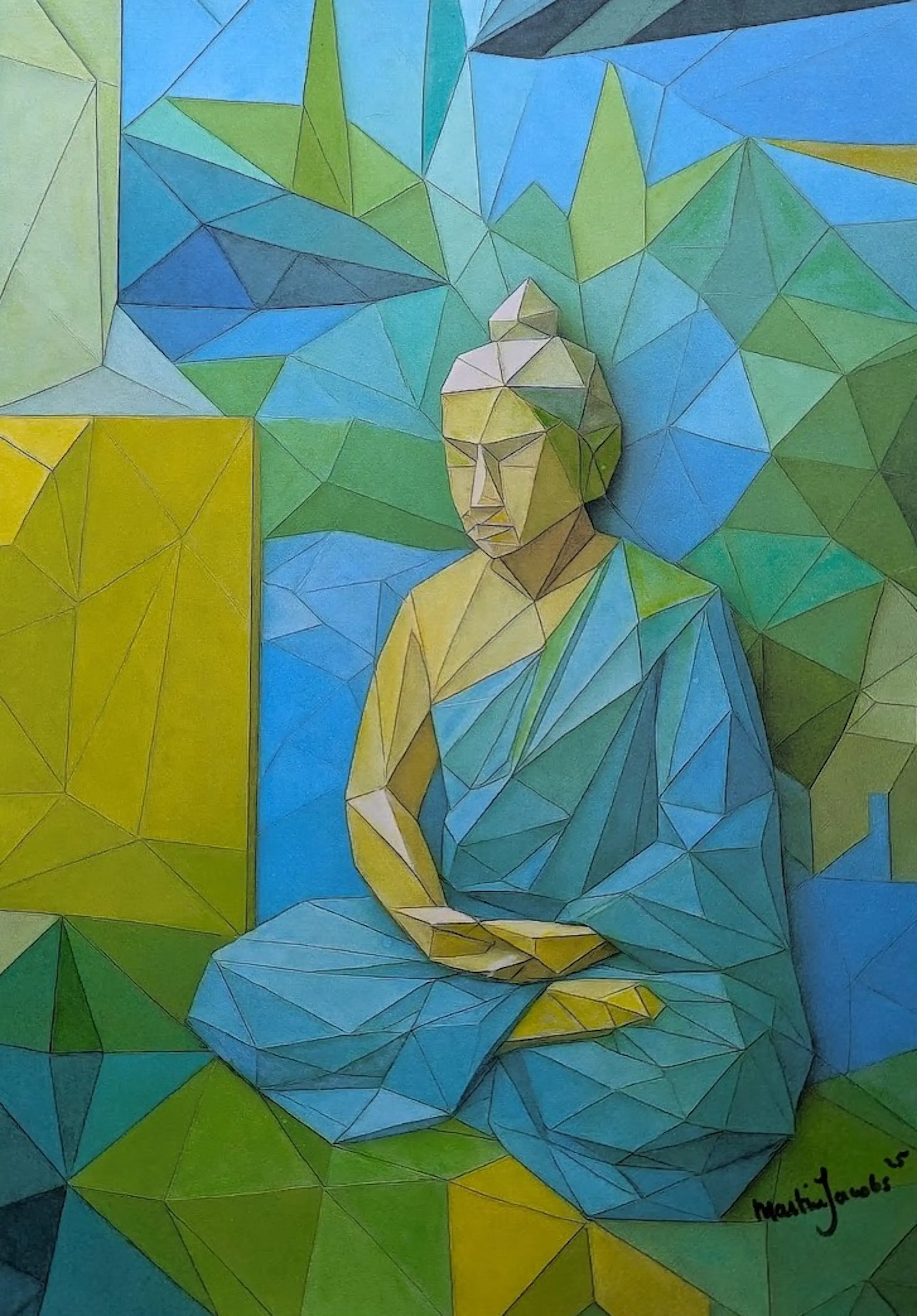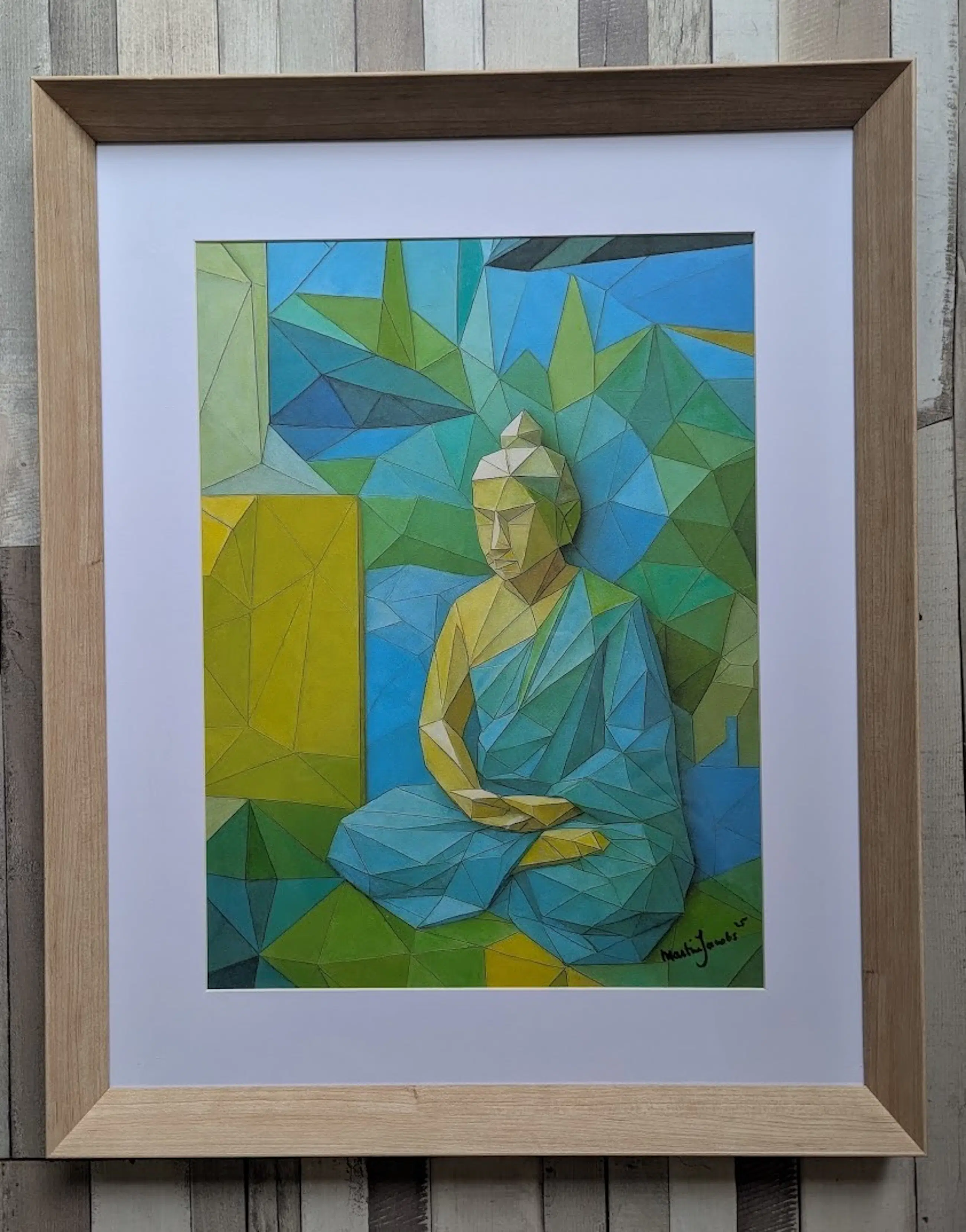 "In dit werk heb ik gezocht naar een balans tussen geometrie en innerlijke rust. De Boeddhafiguur, opgebouwd uit facetten en vlakken, weerspiegelt voor mij de gelaagdheid van stilte: hoe ze zich vouwt, hoe ze zich toont in kleur en vorm. Door het gebruik van origami-achtige structuren ontstaat een ritme dat zowel digitaal als meditatief aanvoelt. Het is een beeld van verstilling, maar ook van transformatie — alsof elk vlak een gedachte is die tot rust komt. ‘Vouw van Stilte’ is voor mij een visuele ademhaling."