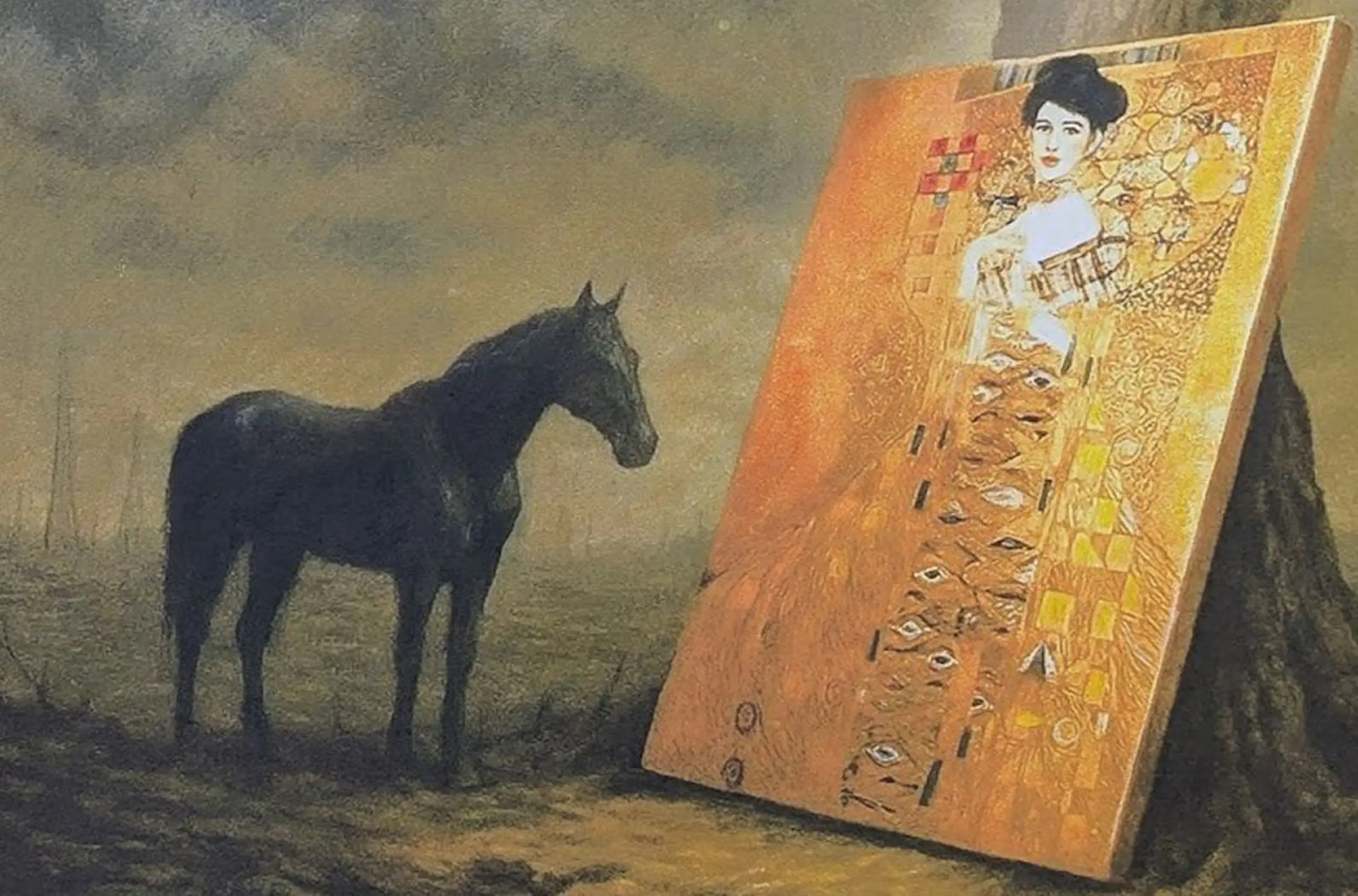 "Toen ik deze print gemaakt had, raakte me vooral de spanning tussen het klassieke en het desolate. Klimt’s gouden portret, zo rijk en iconisch, staat hier als een relikwie in een verlaten landschap — alsof het zijn glans probeert te behouden in een wereld die hem vergeten is. Het zwarte paard, stil en alert, fungeert voor mij als een bewaker van de herinnering, een echo van het verleden die weigert te verdwijnen.