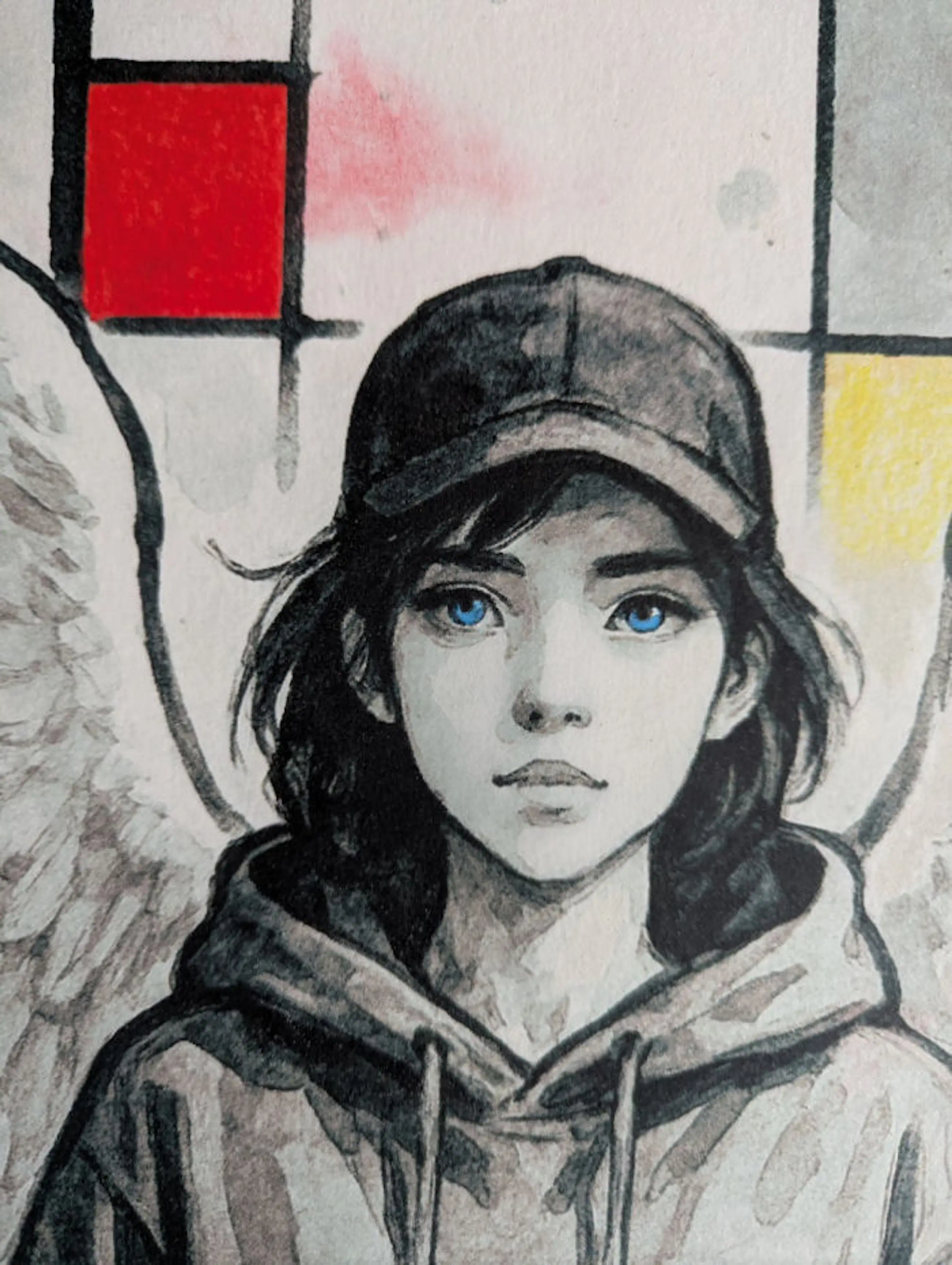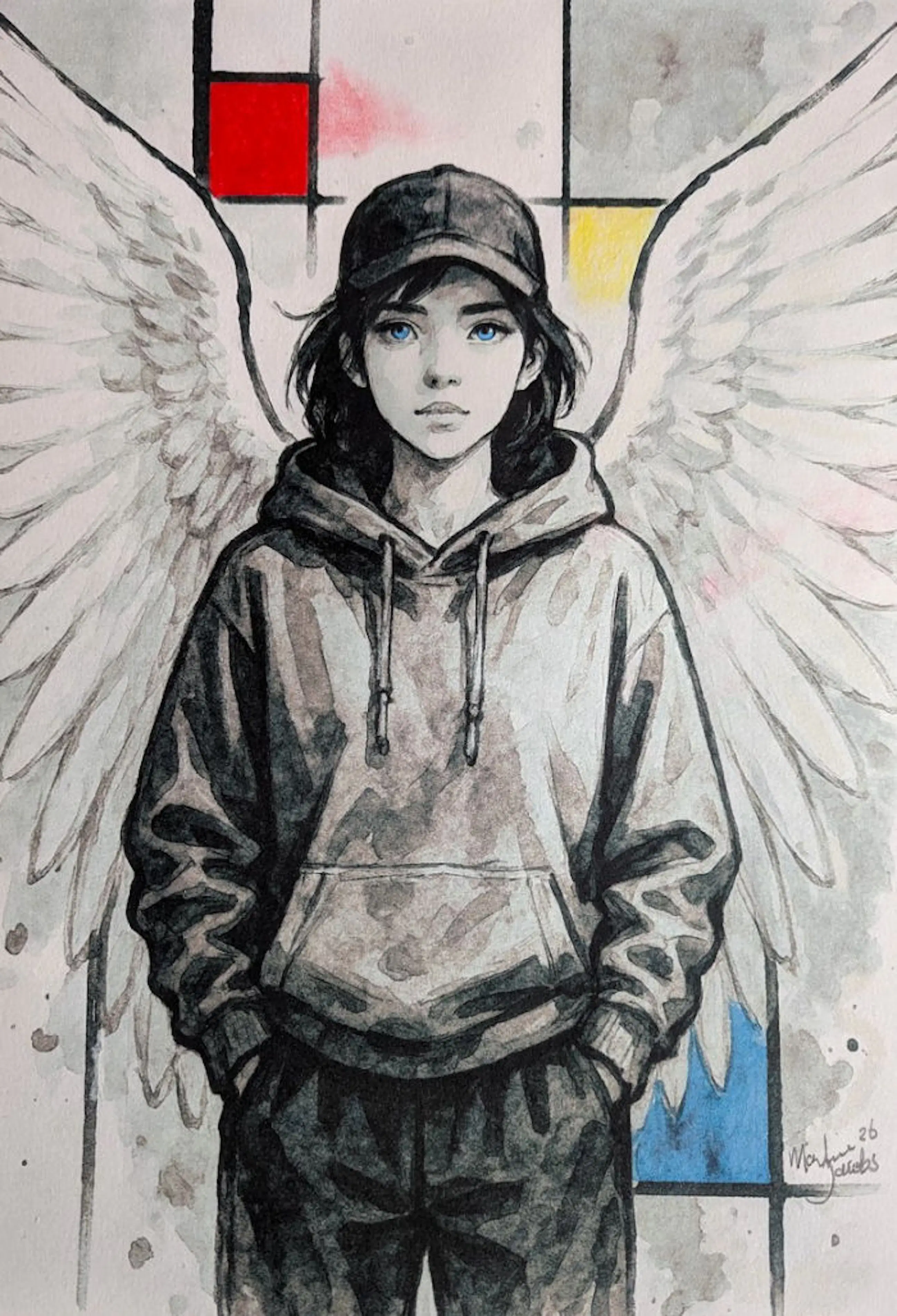 De figuur verbeeldt een stadsengel — een eigentijdse beschermengel die waakt over het stedelijke leven en haar bewoners. Haar aanwezigheid is stil maar krachtig. De indringende blauwe ogen vormen het emotionele middelpunt van het werk en creëren een directe, bijna persoonlijke verbinding met de kijker.