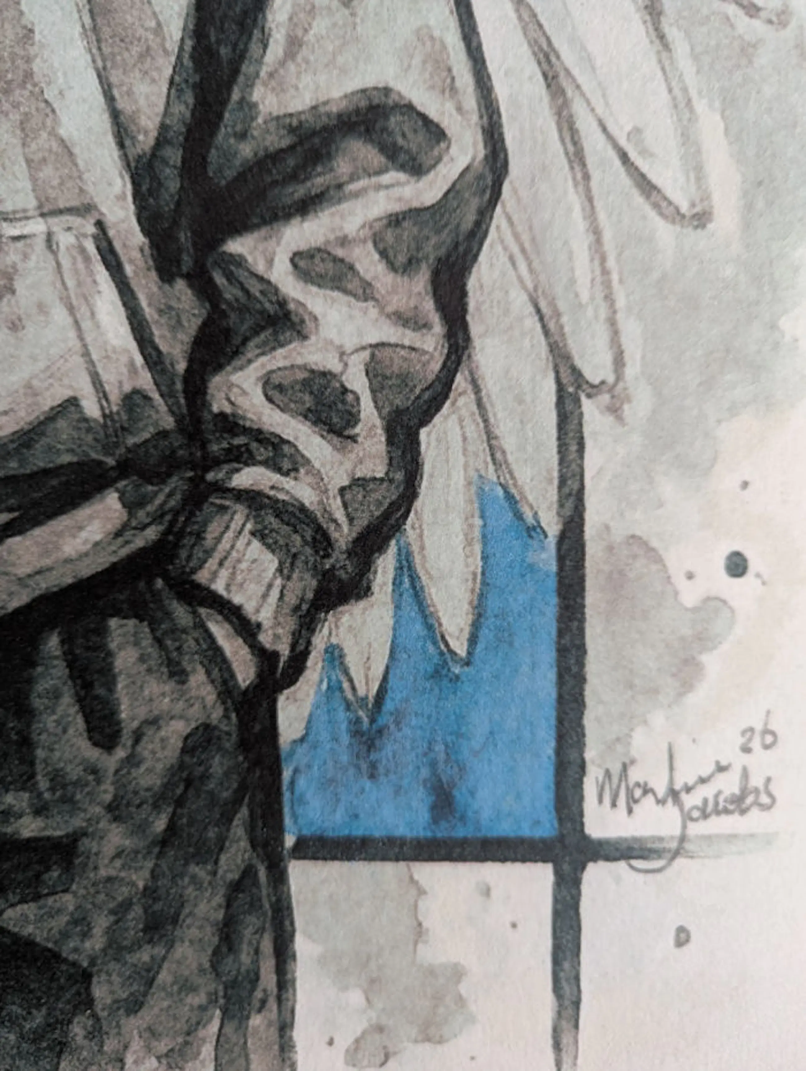 De geometrische vlakken en kleuraccenten op de achtergrond verwijzen naar structuur, orde en de systemen van de stad. Daartegenover staat de menselijke zachtheid van de figuur, die bescherming, hoop en verbondenheid symboliseert. De combinatie van figuratie en abstractie benadrukt het spanningsveld tussen menselijkheid en urbaniteit.