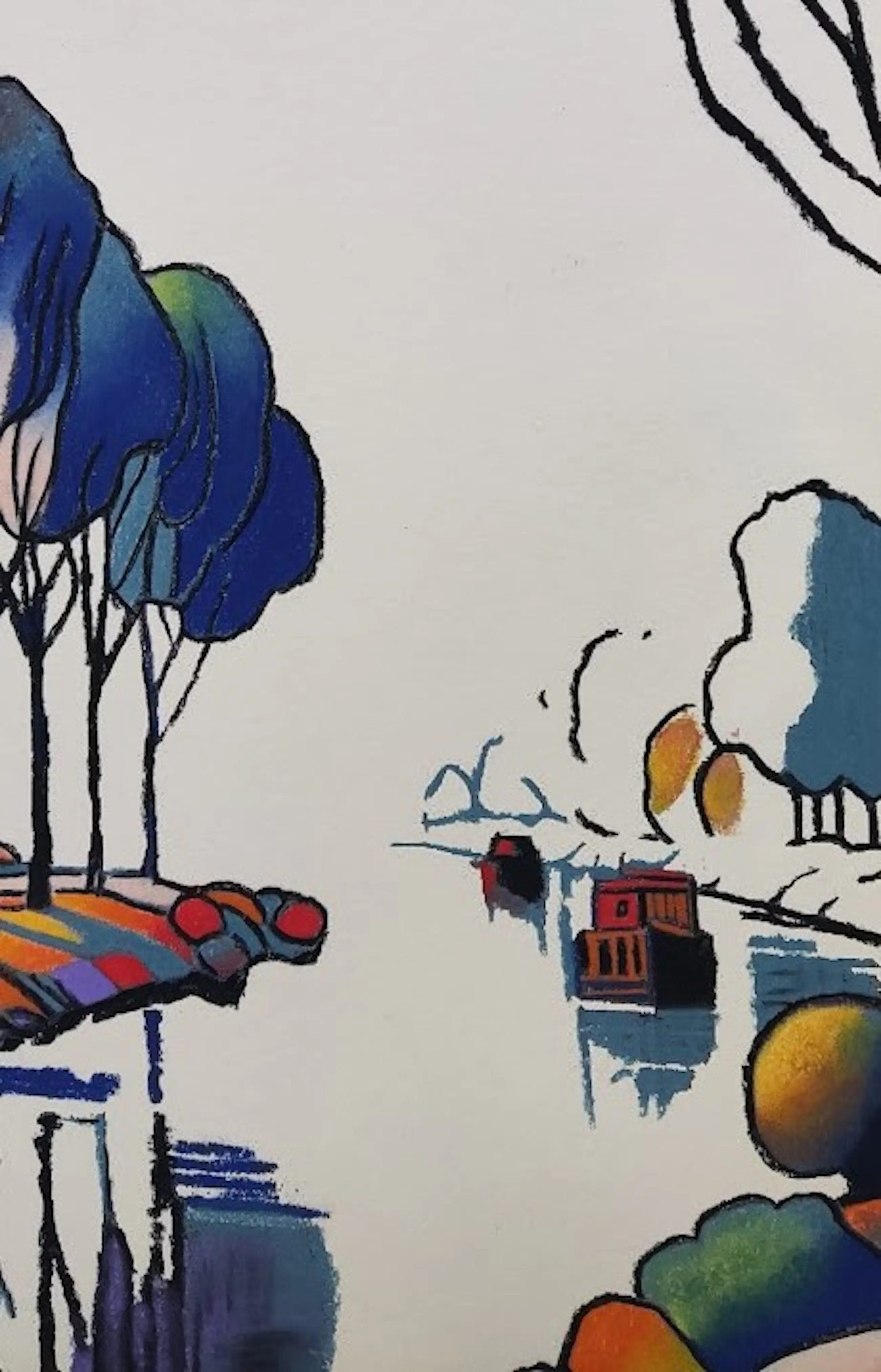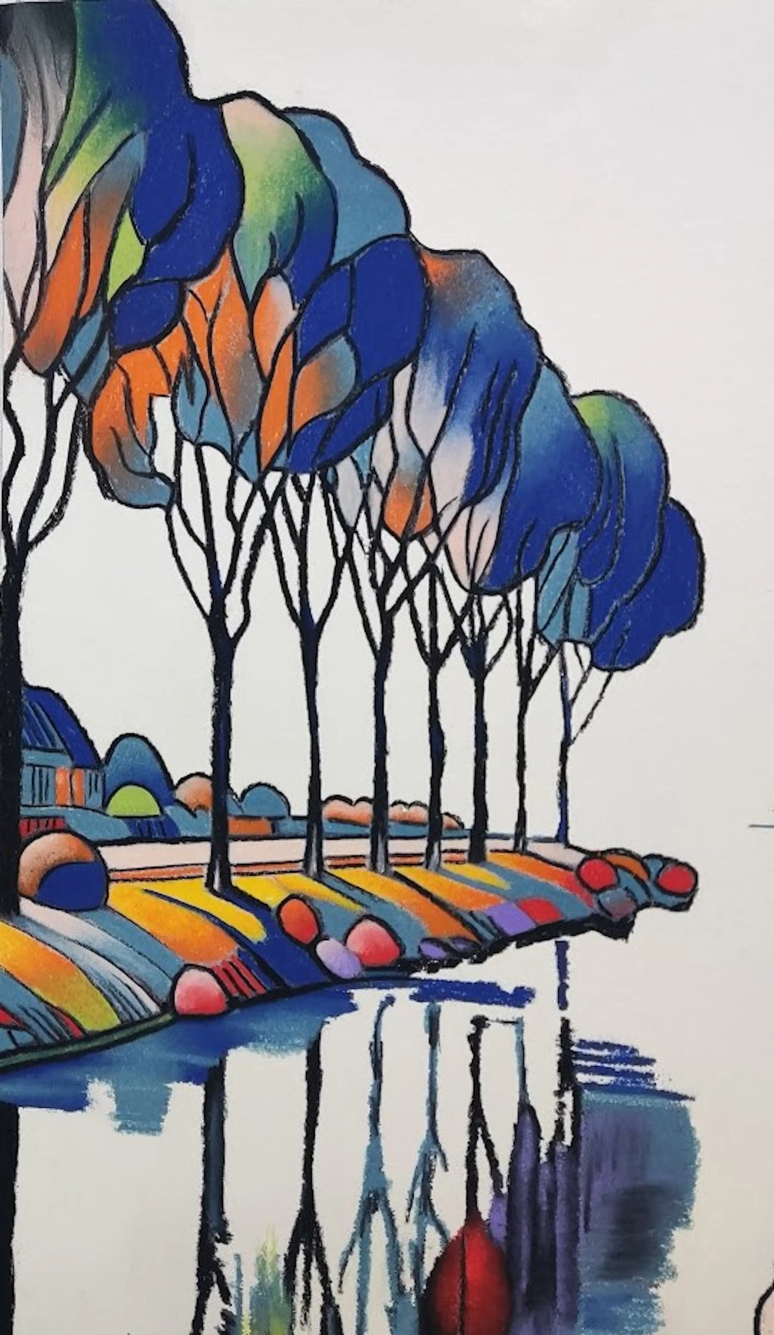 In "Terug naar het Gein" combineer ik mijn eigen stijl met inspiratie uit de vroege landschappen van Mondriaan. Het bekende riviertje heb ik verbeeld met felle kleuren en speelse vormen.