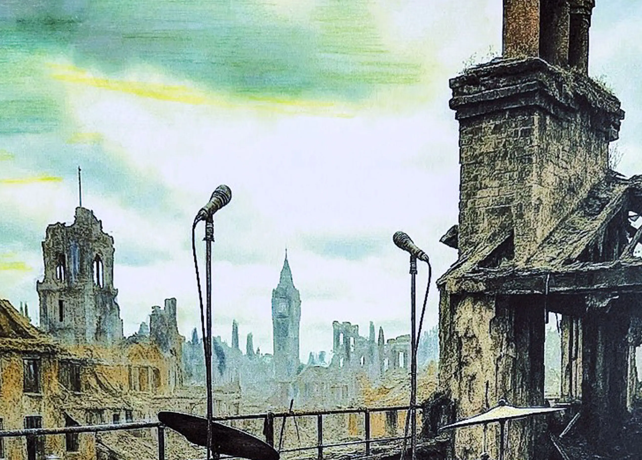 De stad om hen heen ligt in puin. Big Ben torent in de verte, gewond maar trots, als een wachter die toeziet op wat eens was. De lucht, getint met een ziekelijk groen, drukt neer als een herinnering die we niet kunnen loslaten. En toch… er is licht. Geen letterlijk licht, maar een soort emotionele gloed die de pastelkleuren oproepen — lavendel, stoffige roos, bleek oker — tinten die fluisteren van veerkracht.