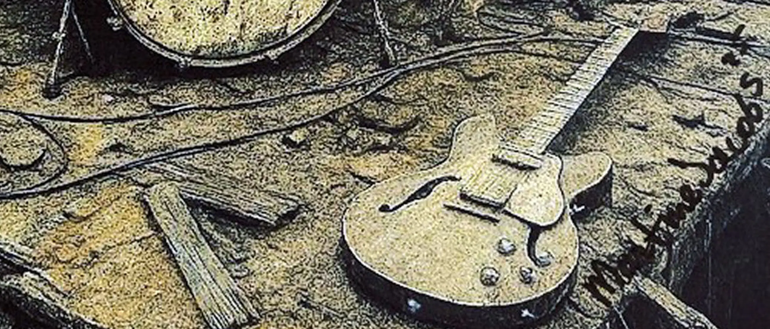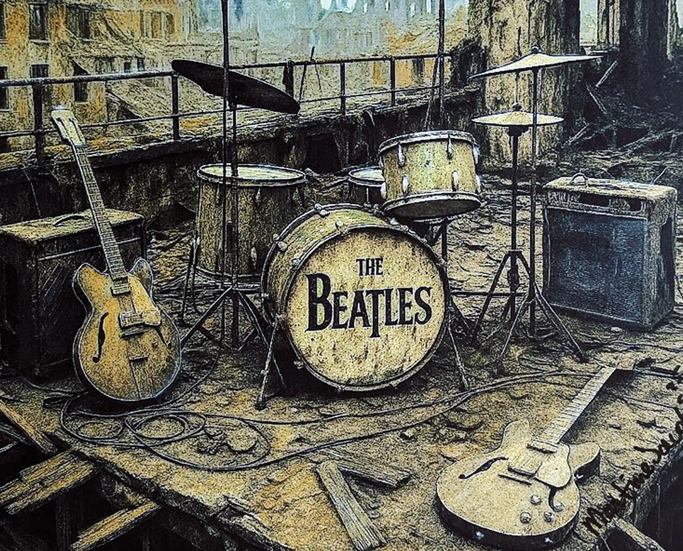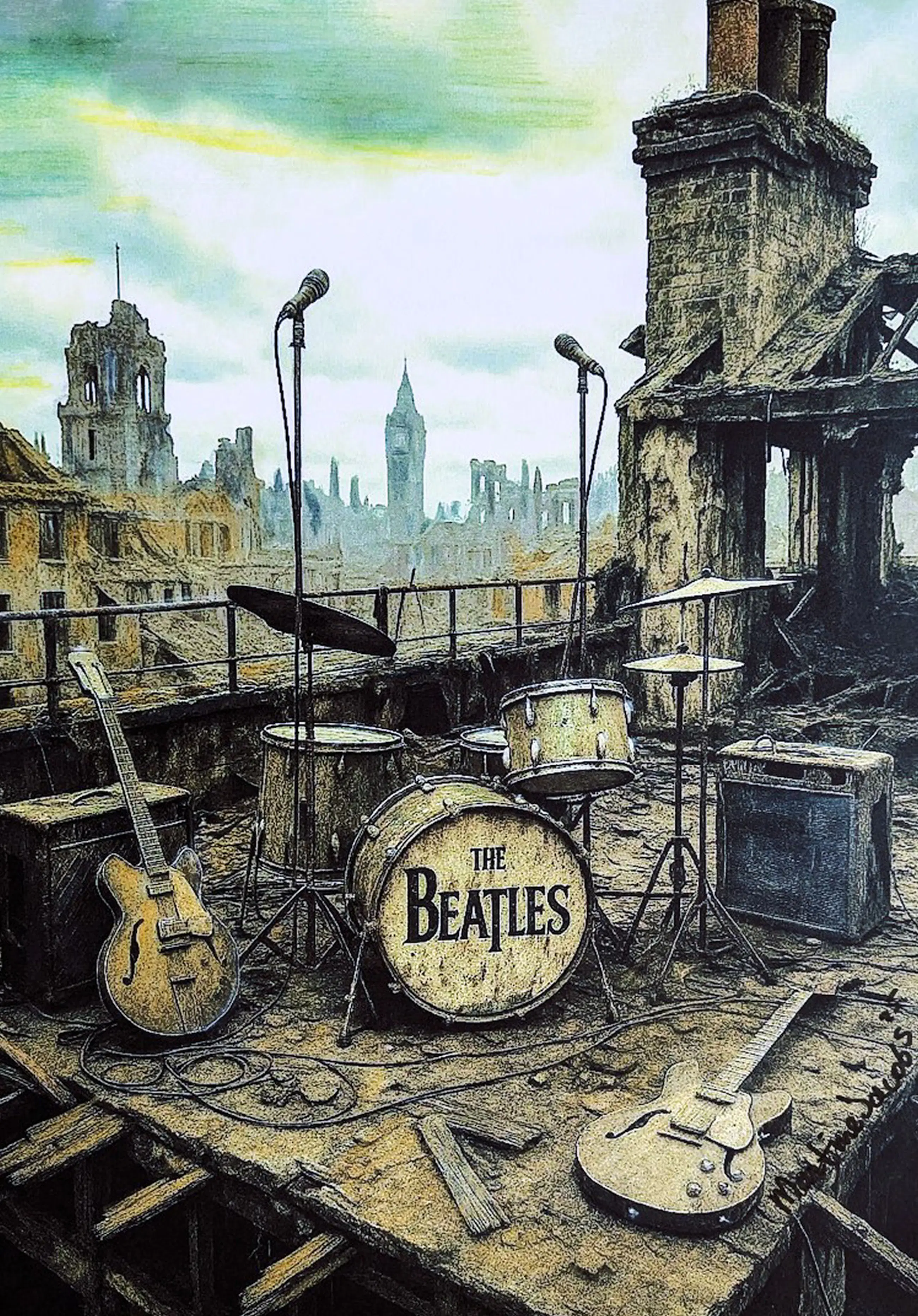 Er is iets huiveringwekkend moois aan dit tafereel. Terwijl ik mijn blik laat rusten op de pastelstreken die de verwoesting verzachten, voel ik me opgeschort tussen herinnering en mythe. Het dak — gebroken, versplinterd, nauwelijks nog bijeenhoudend — wordt een fragiel podium voor iets eeuwigs. De instrumenten van The Beatles staan klaar, onaangeraakt door tijd of verval, alsof de muziek zelf weigert zich over te geven.