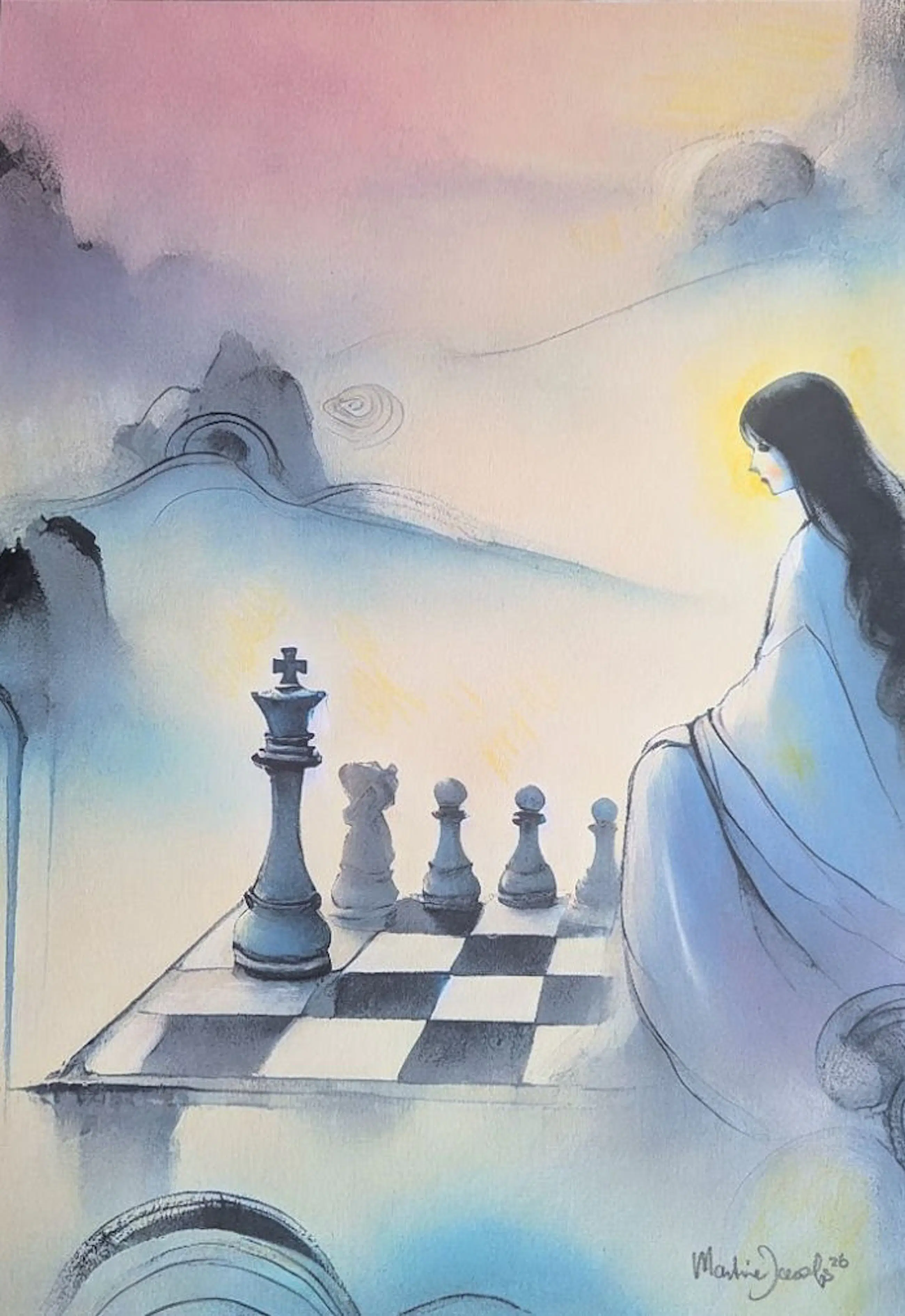 The Silent Game is een origineel kunstwerk, ontstaan uit een handmatig ingekleurde print die zorgvuldig is afgewerkt met pastelpotlood. Door dit ambachtelijke kleurproces is elk werk uniek. Het kunstwerk wordt geleverd met een ondertekend certificaat van echtheid, dat de originaliteit en artistieke waarde bevestigt.