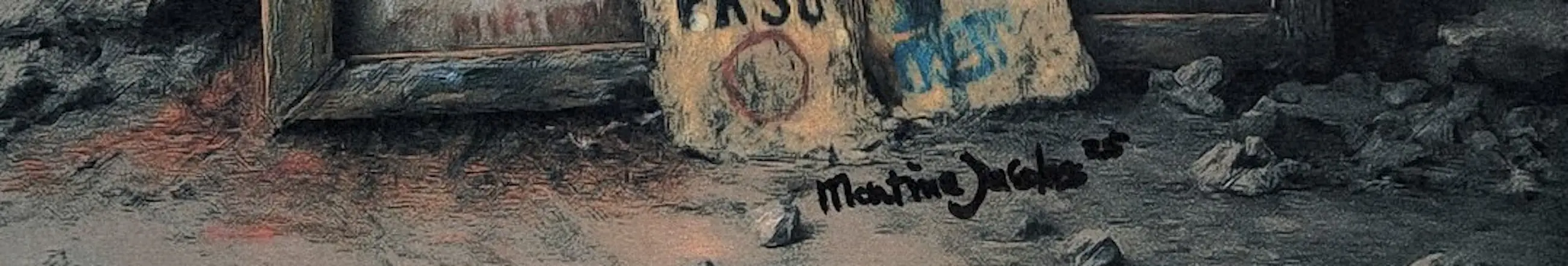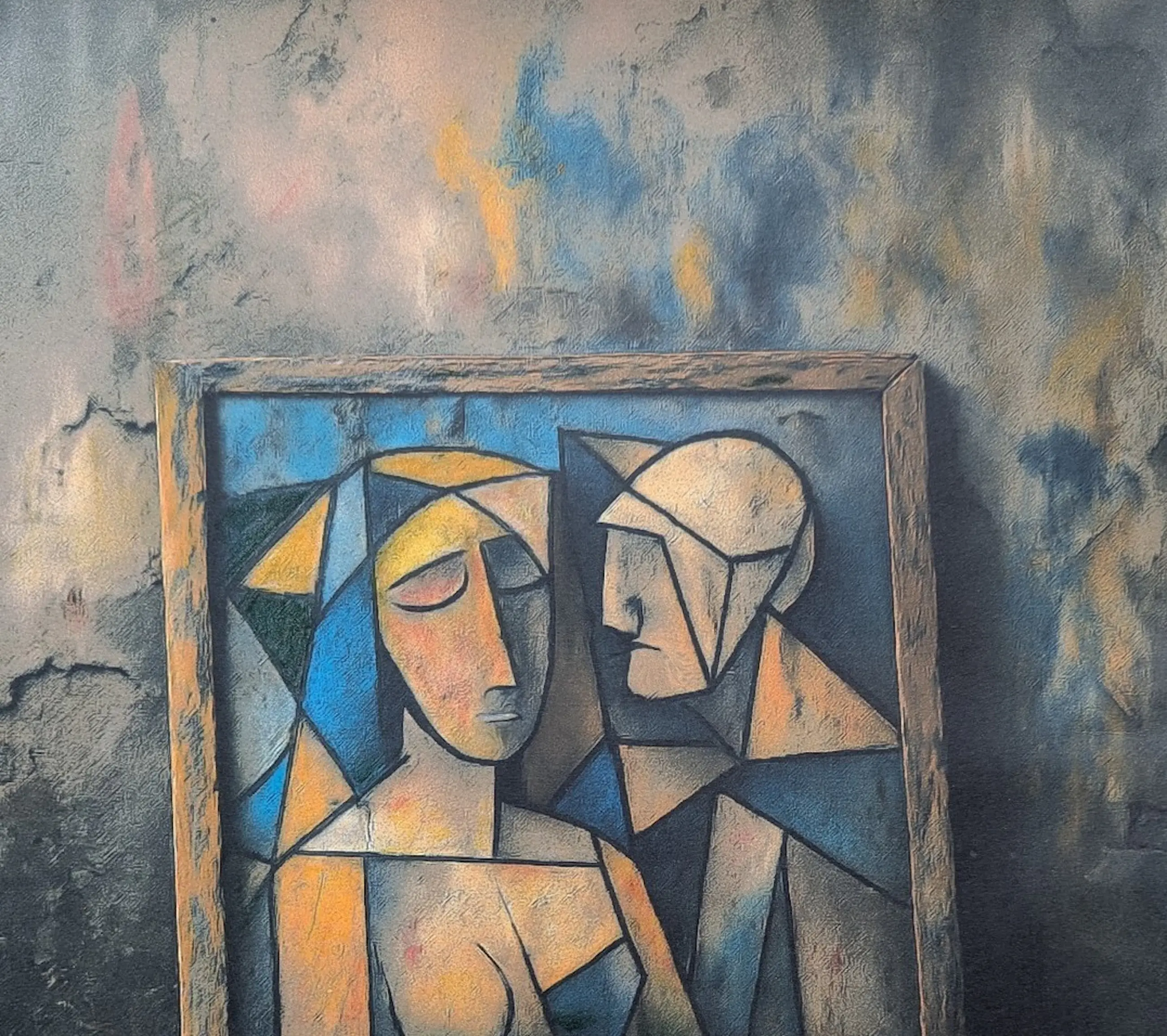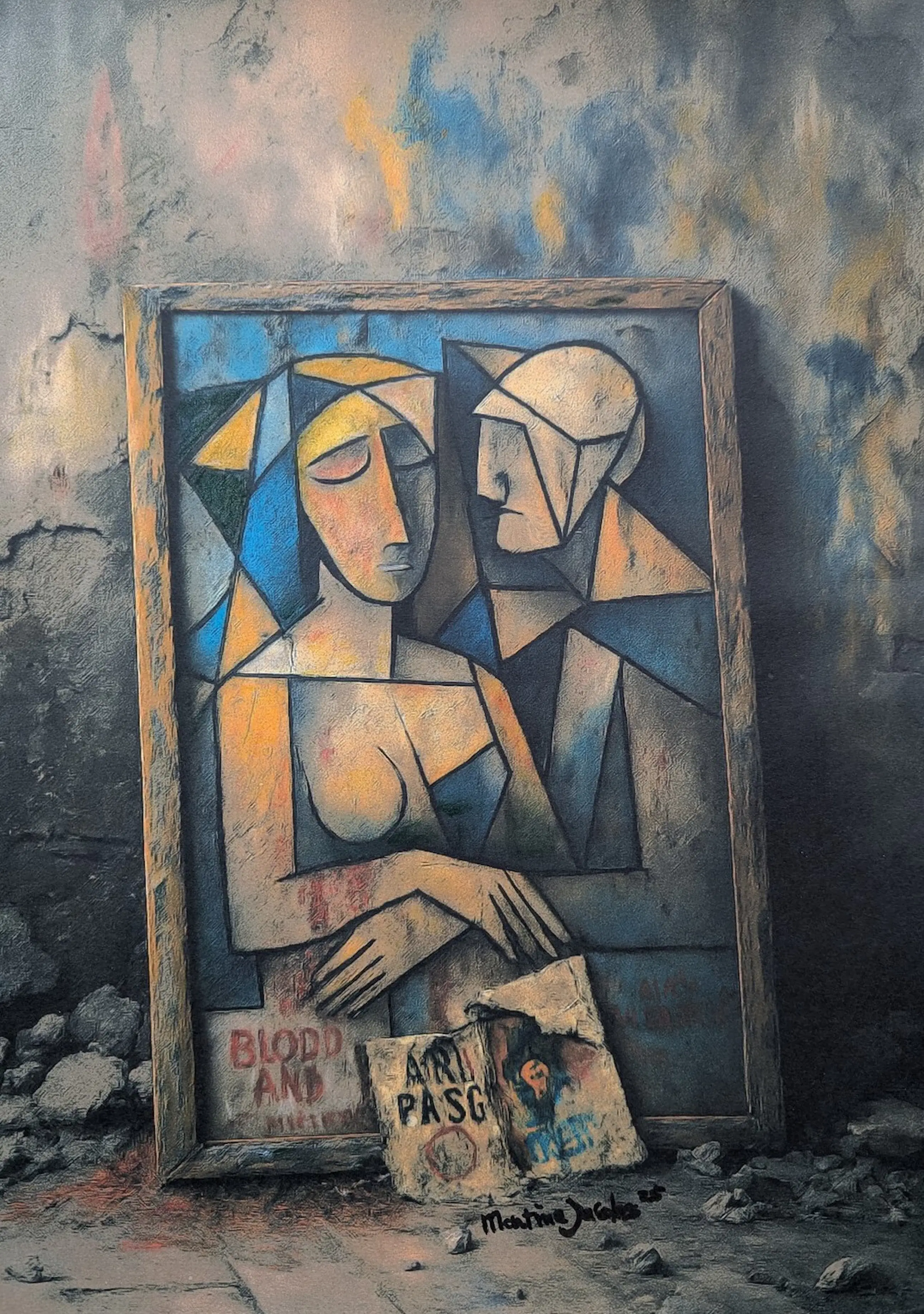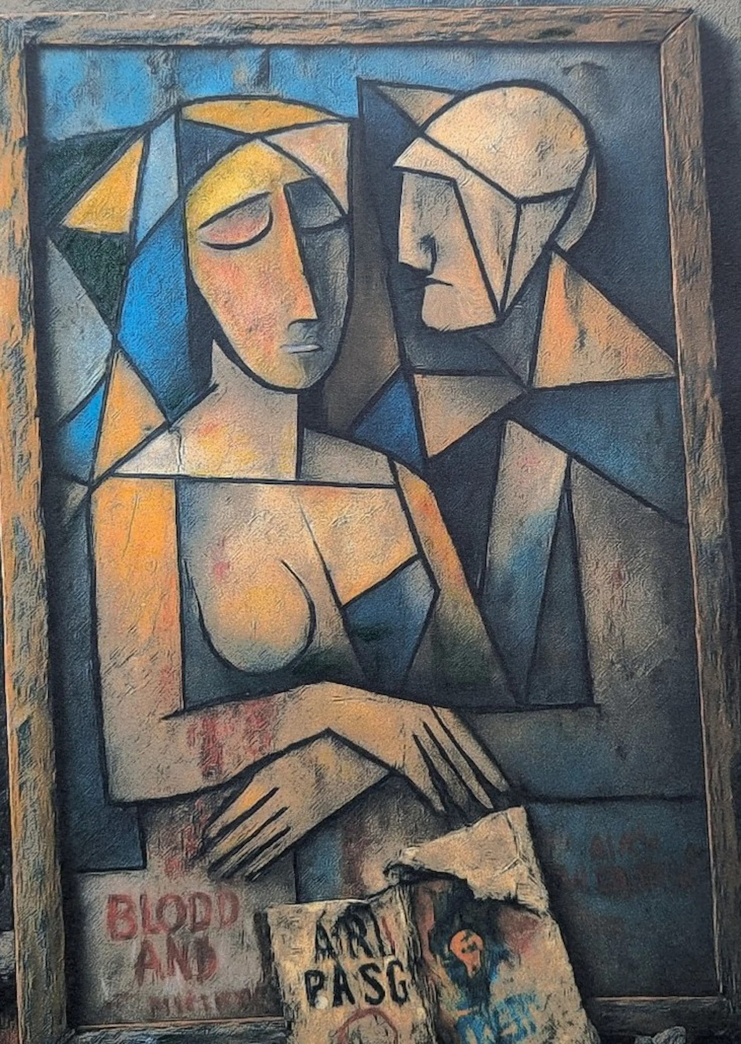 Dit werk van Martine Jacobs toont twee abstracte figuren in een kubistische stijl, opgebouwd uit geometrische vormen in zachte tinten blauw, geel en oranje. Ze zitten dicht bij elkaar, alsof ze in stilte verbonden zijn. De achtergrond – een verweerde muur met resten van posters en woorden – geeft het geheel een gevoel van verval en vergankelijkheid. Het contrast tussen de intieme figuren en de ruwe omgeving maakt het werk eenvoudig maar krachtig.
