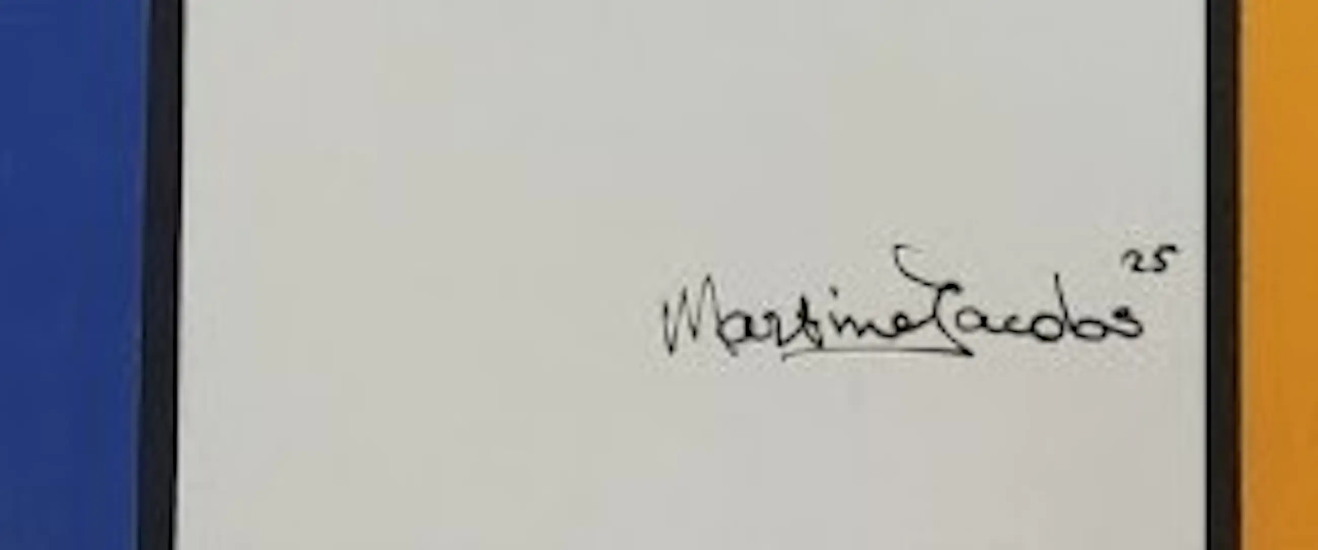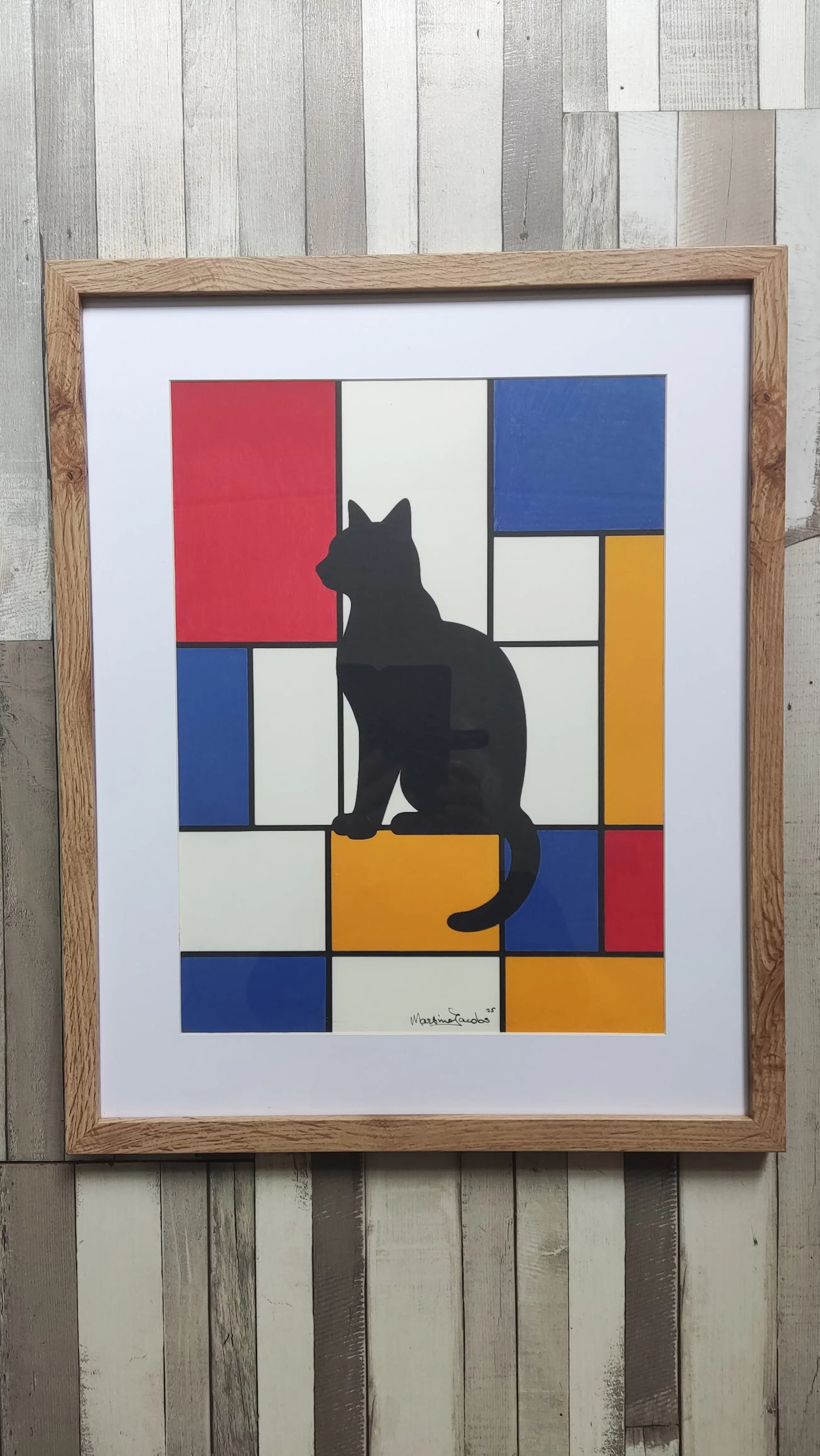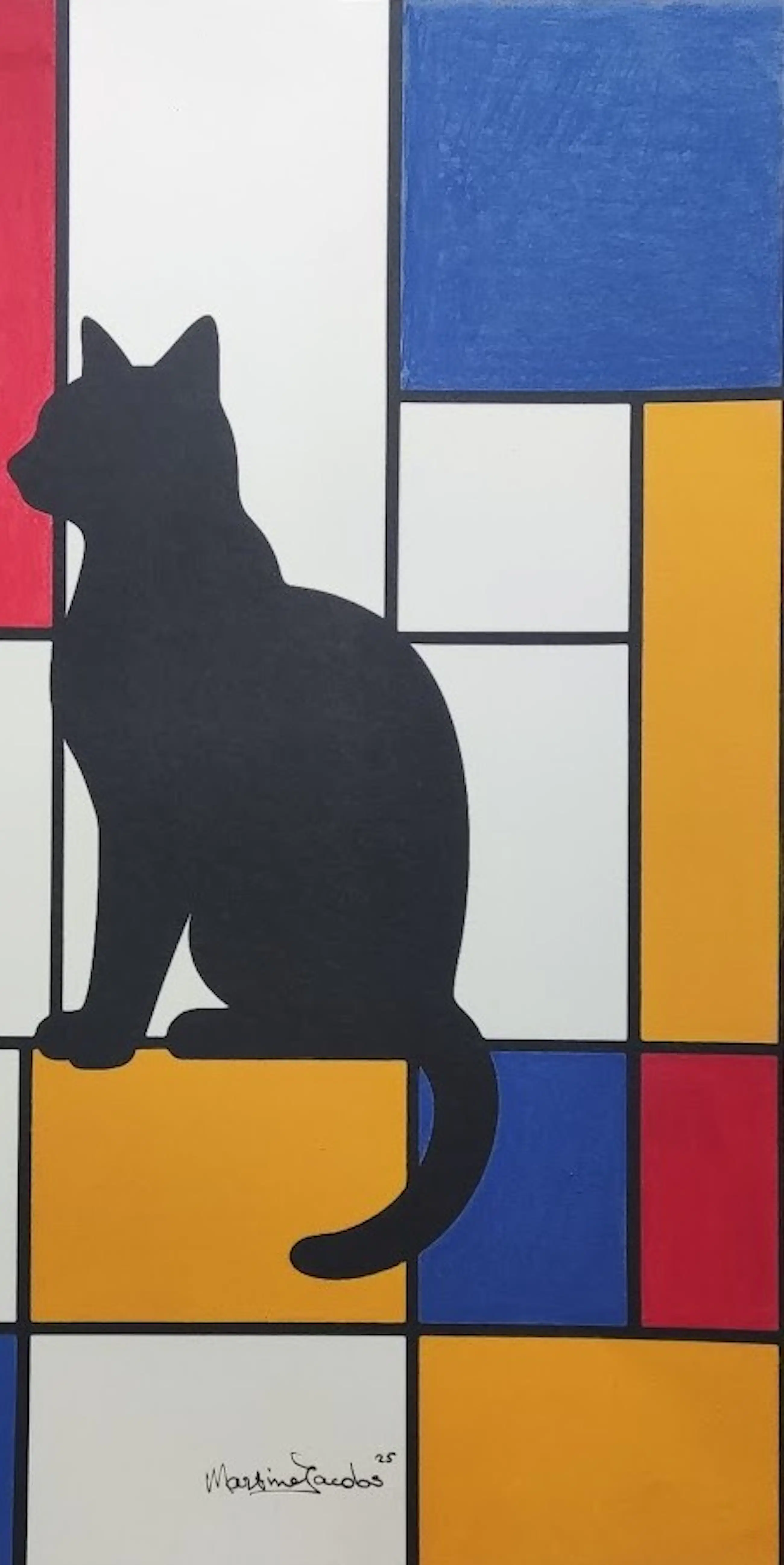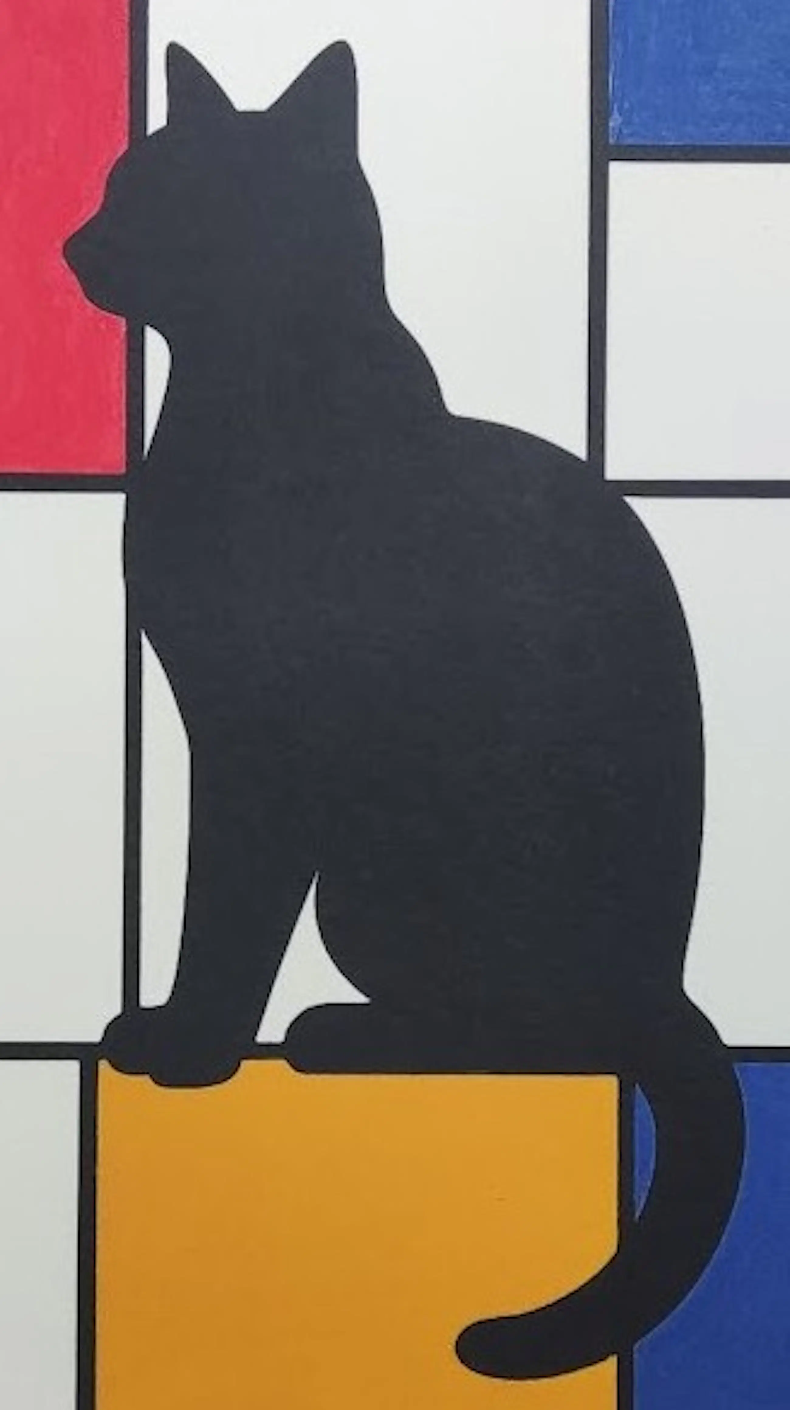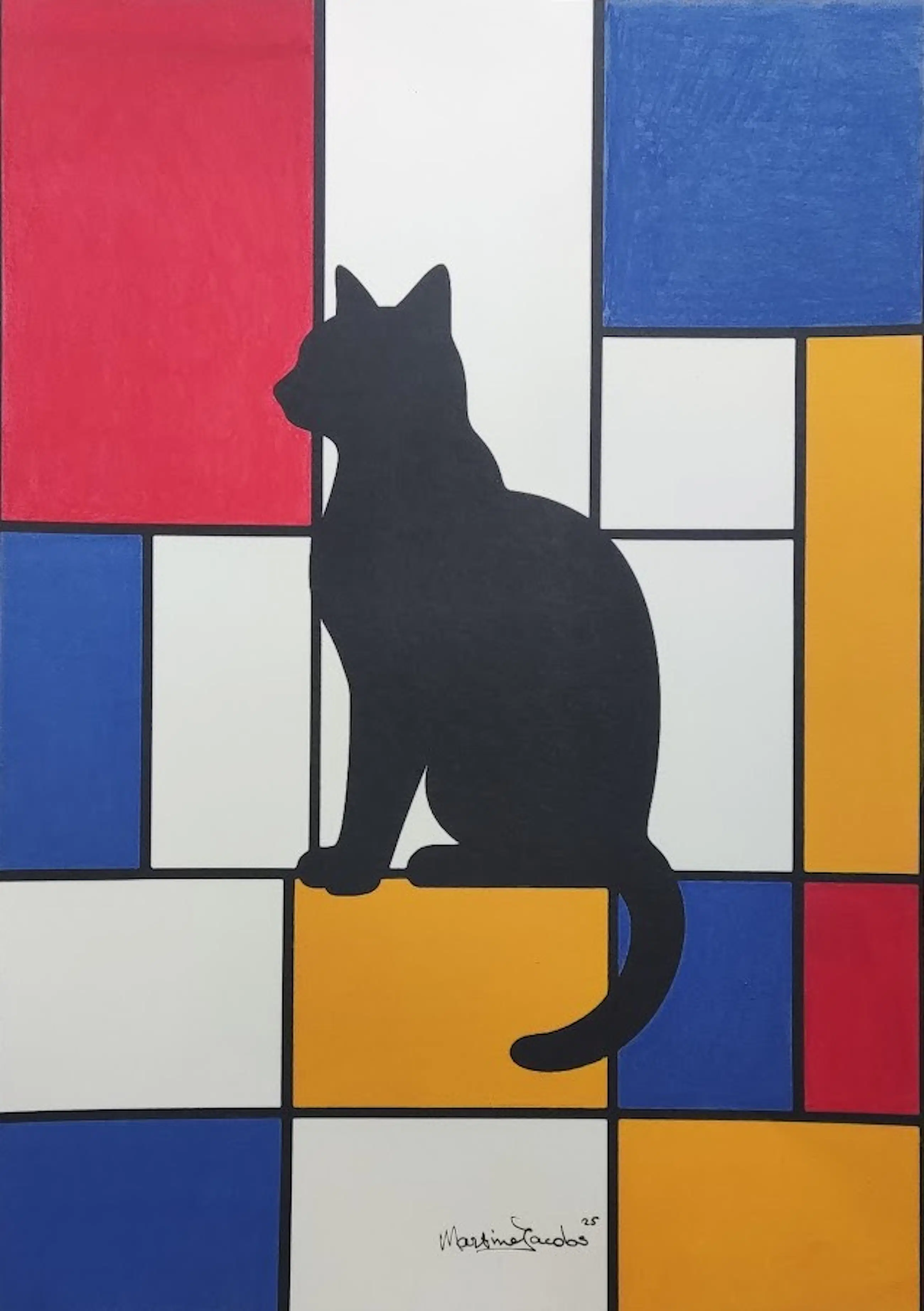 "In dit werk wilde ik rust vangen binnen structuur. De zwarte kat zit stil, bijna meditatief, midden in een wereld van lijnen en kleurvlakken. Het dier is een silhouet — zonder detail, zonder afleiding — en juist daardoor krijgt het een eigen kracht.