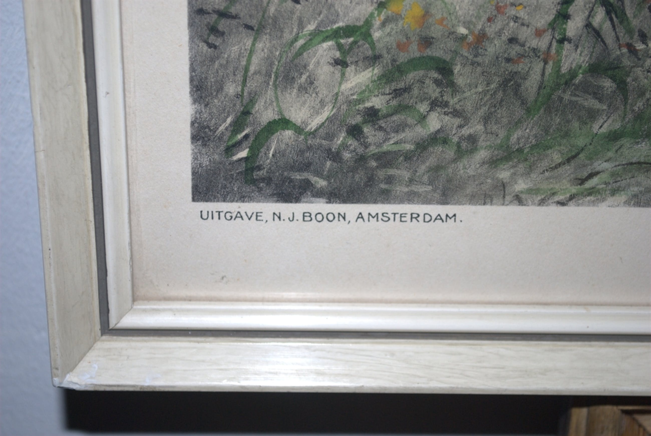 Achter glas ingelijst. De lijst heeft lichte schade, 42x60 cm.