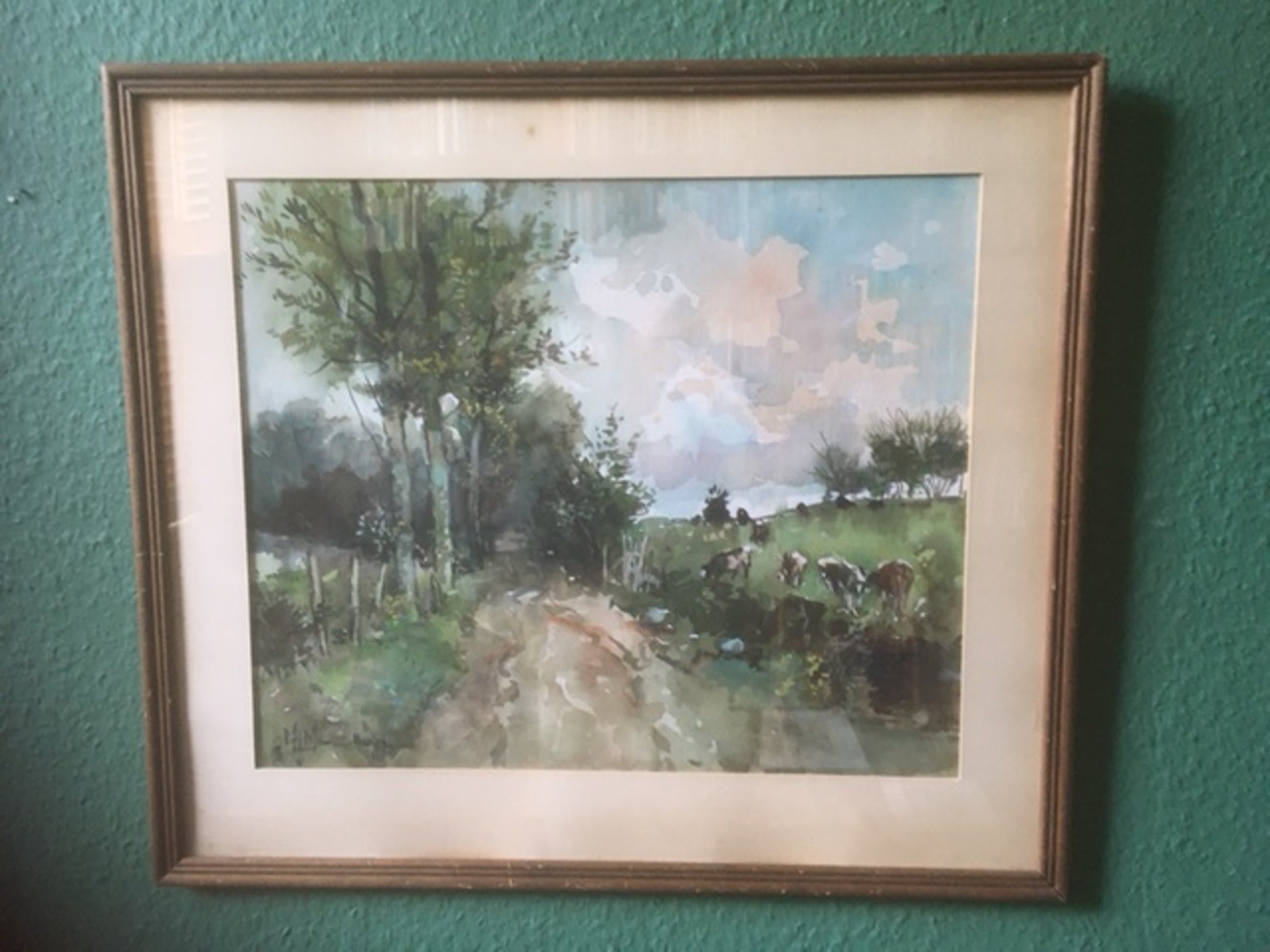 Lijst is nogal gedateerd, passe-partout is verkleurd en vertoont vlekjes. Glas is echter nog intact en de aquarel is in prima staat