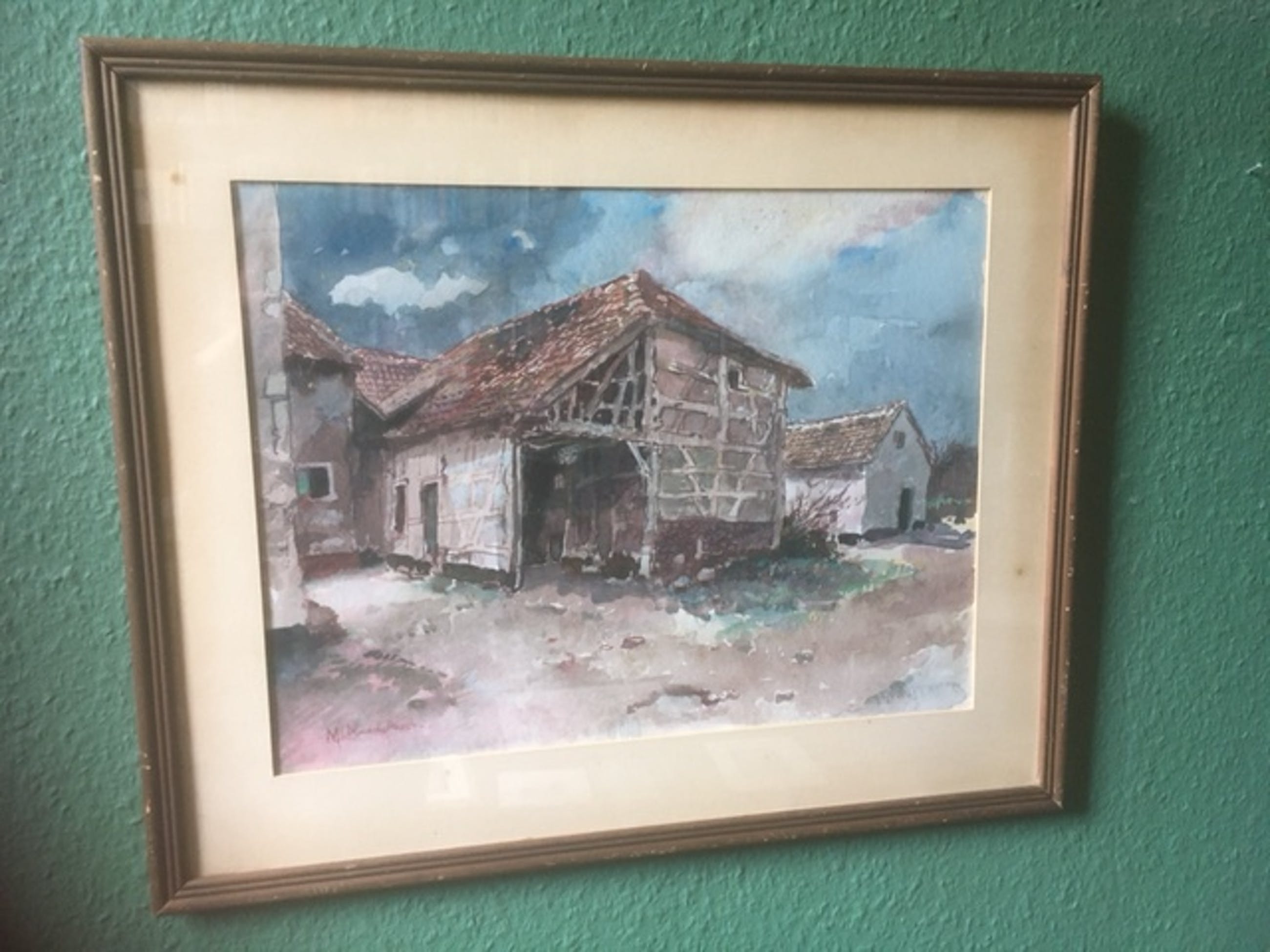 Lijst is nogal gedateerd, passe-partout is verkleurd en vertoont vlekjes. Glas is echter nog intact en de aquarel is in prima staat