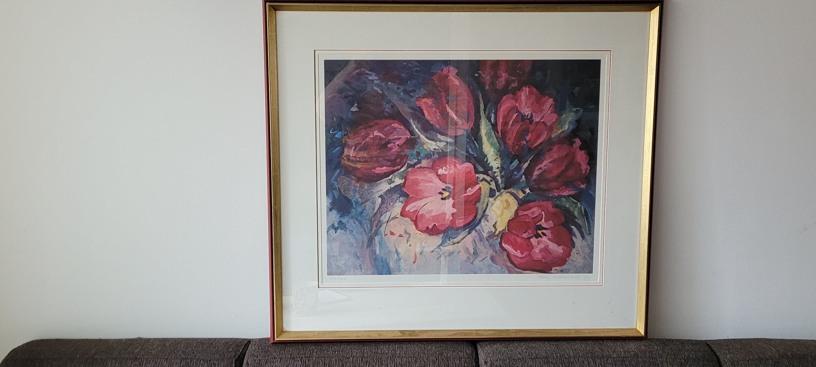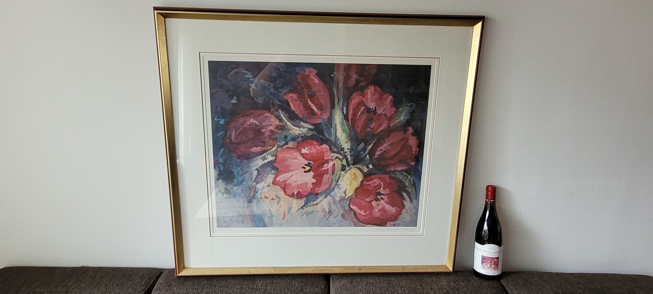 Mooie zeefdruk van bosje tulpen. Gemaakt ter ere van de nieuwe wijnoogst van Beaujolais Villages Nouveau! 1994. Bijpassend een fles rode wijn met etiket van de zeefdruk. ongeopend! Collectors item!