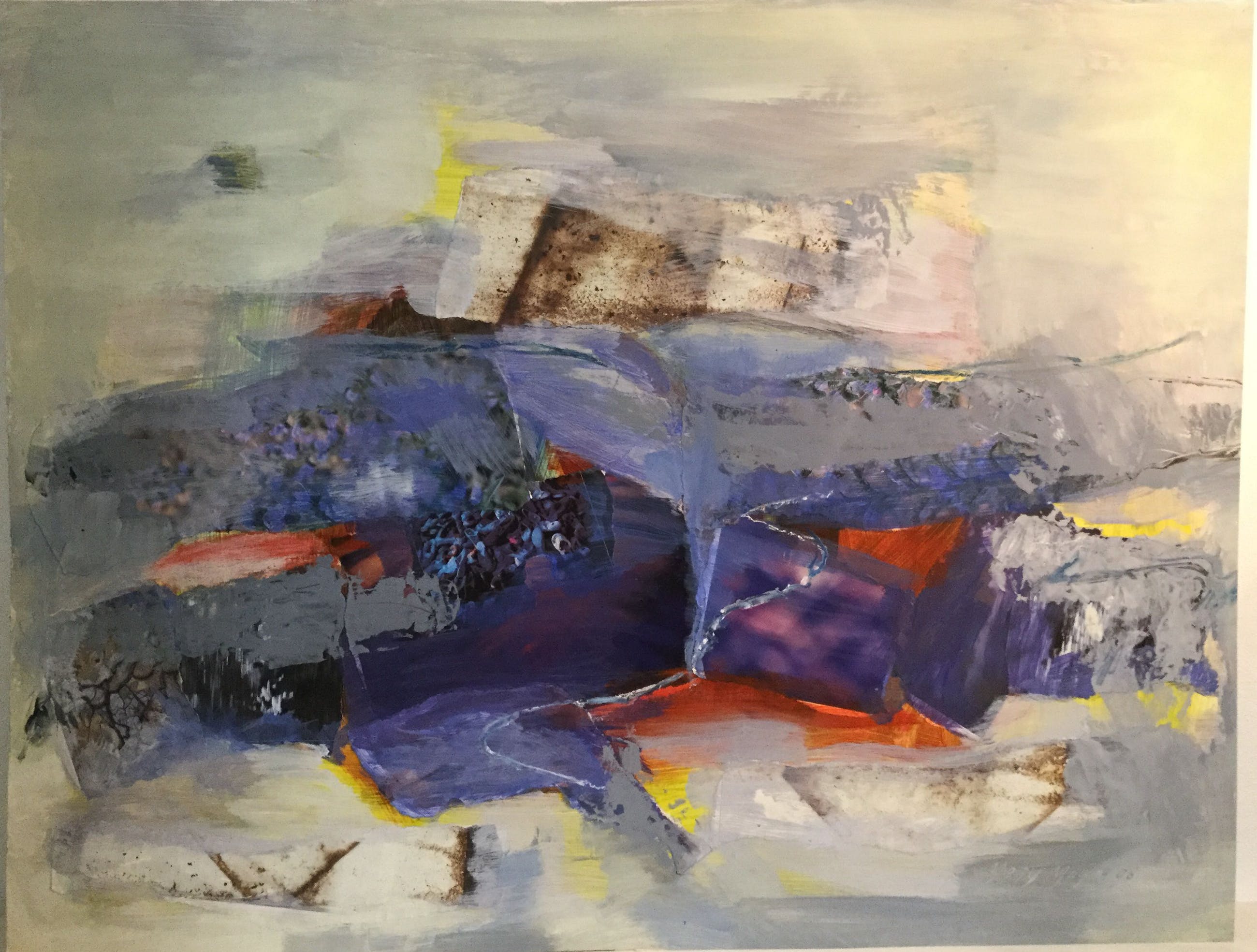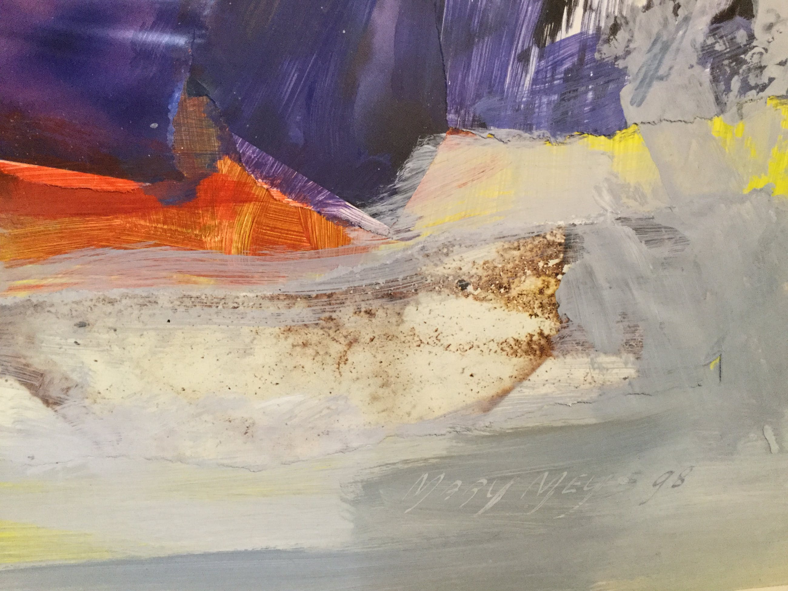 Het schilderij is met een gemengde techniek van acryl en papier in 1998 door Mary Meijs gemaakt.