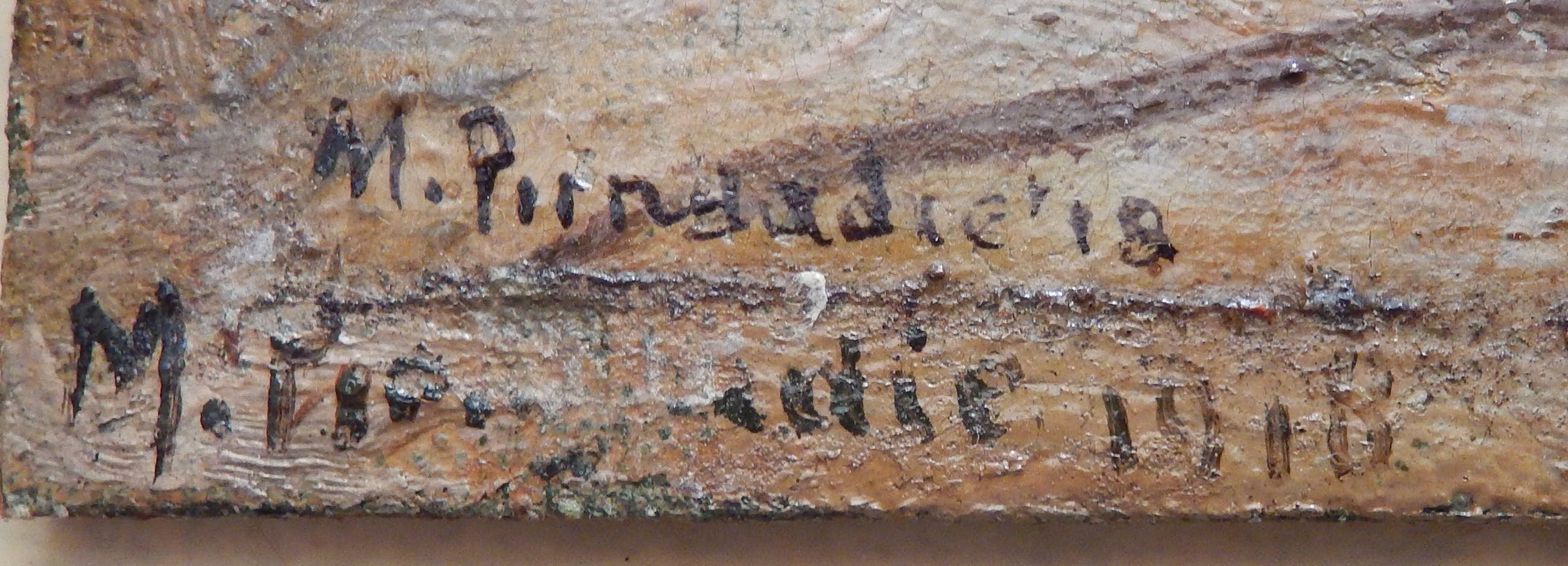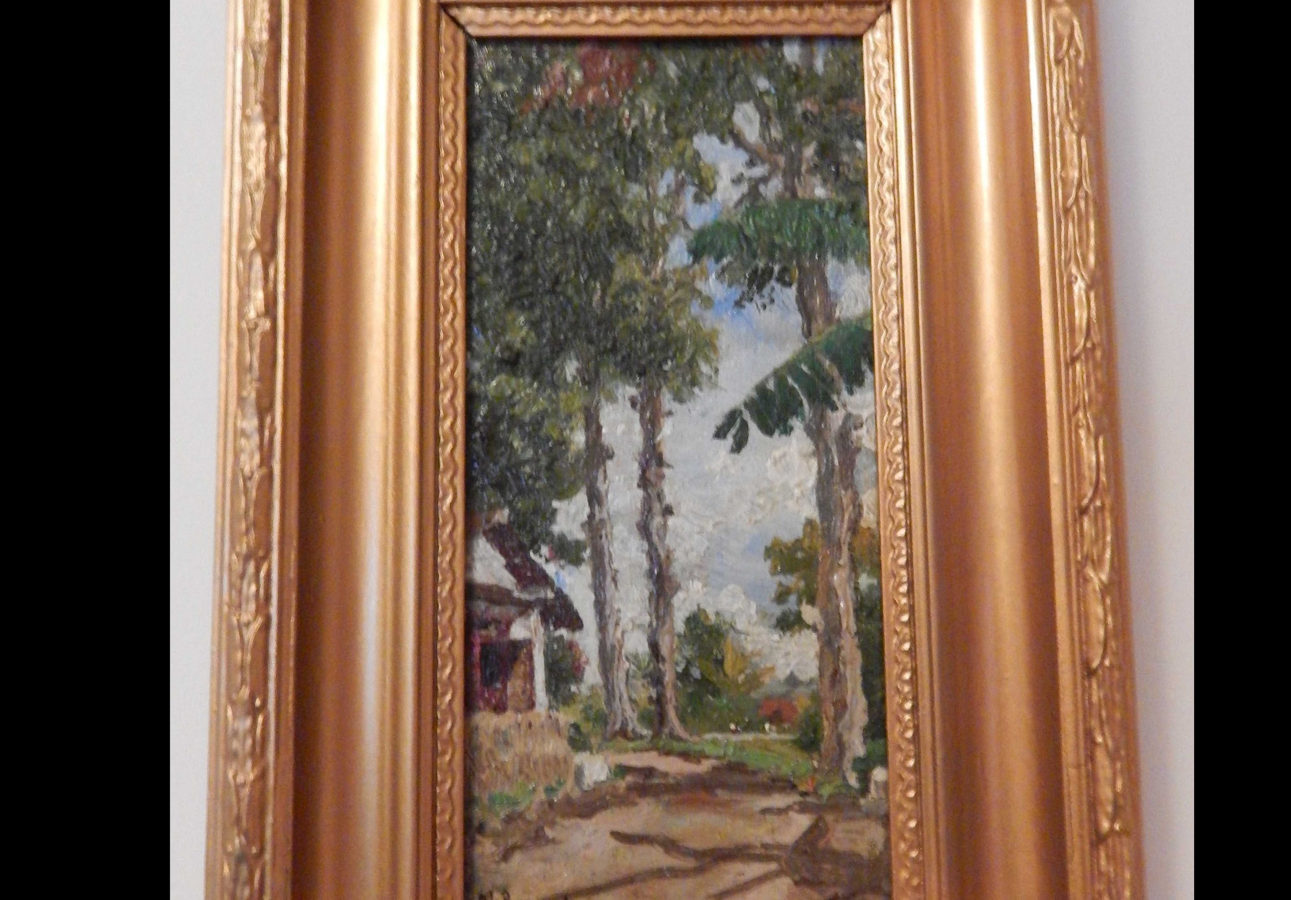 Mas Pirngadie (1875 – 1936) De kunstenaar die het meest bekend staat als de illustrator van de vijfdelige serie over de ‘Inlandsche Kunstnijverheid in Nederlandsch Indië’, ( J.E. Jaspers & Mas Pirngadie ). Naast deze activiteit was Mas Pirngadie vooral actief als vrije kunstenaar. Door de kunstenaars die vanuit Europa Indië aandeden werden de kunstenaars van Bali geïnspireerd. Niet meer de romantisch geschilderde sawa’s of landschappen met rokende vulkanen maar impressionistisch. De schilders van Mooi Indië zoals zij zich noemden. Mas Pirngadie was ook de stimulerende kracht voor de schildersvereniging Persagi in 1938. Die oprichting heeft hij niet mogen meemaken. Kunstwerken die de kunstenaars van Mooi Indië maakten en naar Europa verhuisden worden nu voor veel geld teruggekocht door mensen uit Azië. Dit werk is een Balinees landschapje. Enigszins pasteus geschilderd.