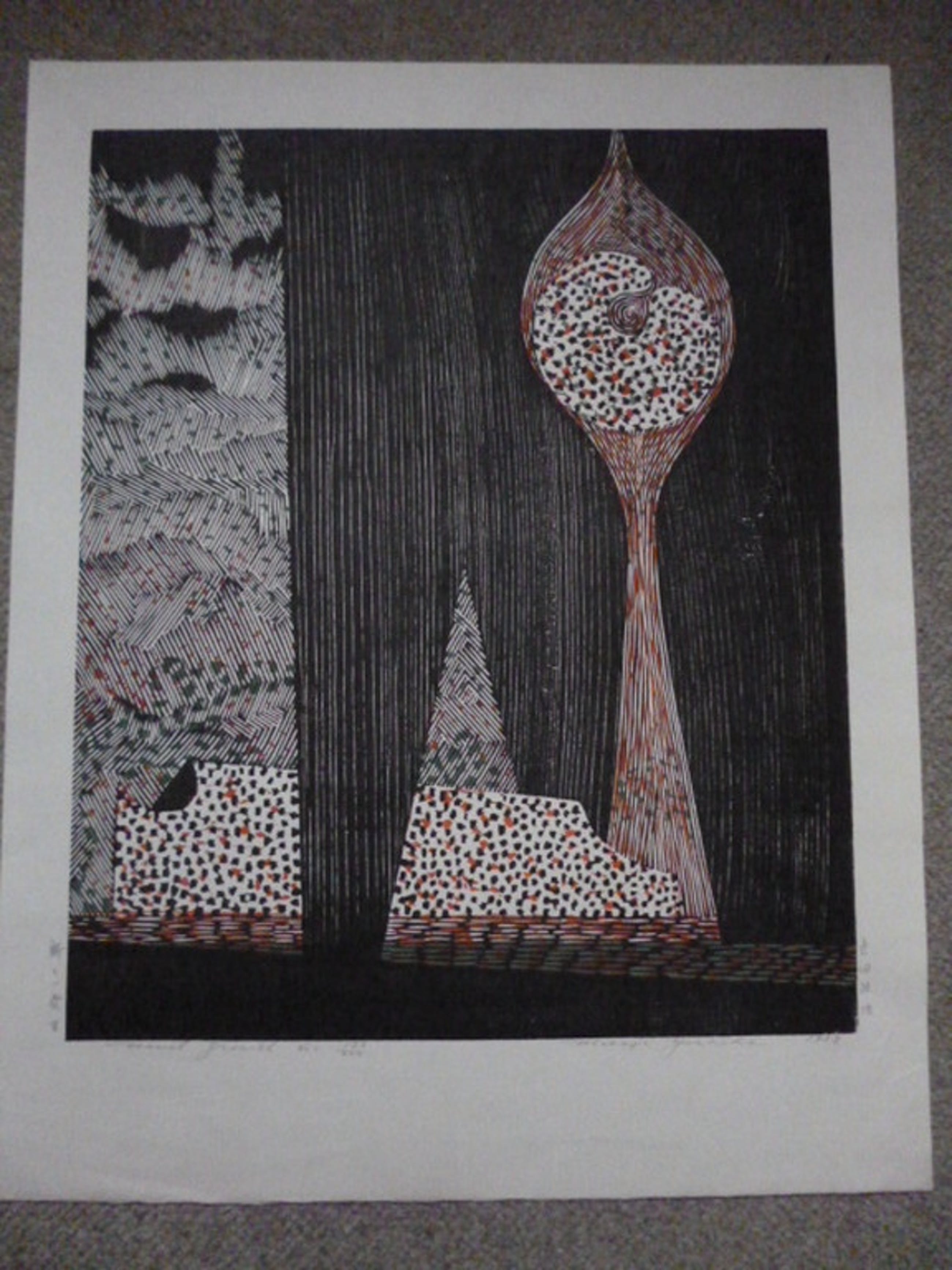 Kleurenhoutsnede, potlood gesigneerd en gedateerd 1958 rechtsonder.