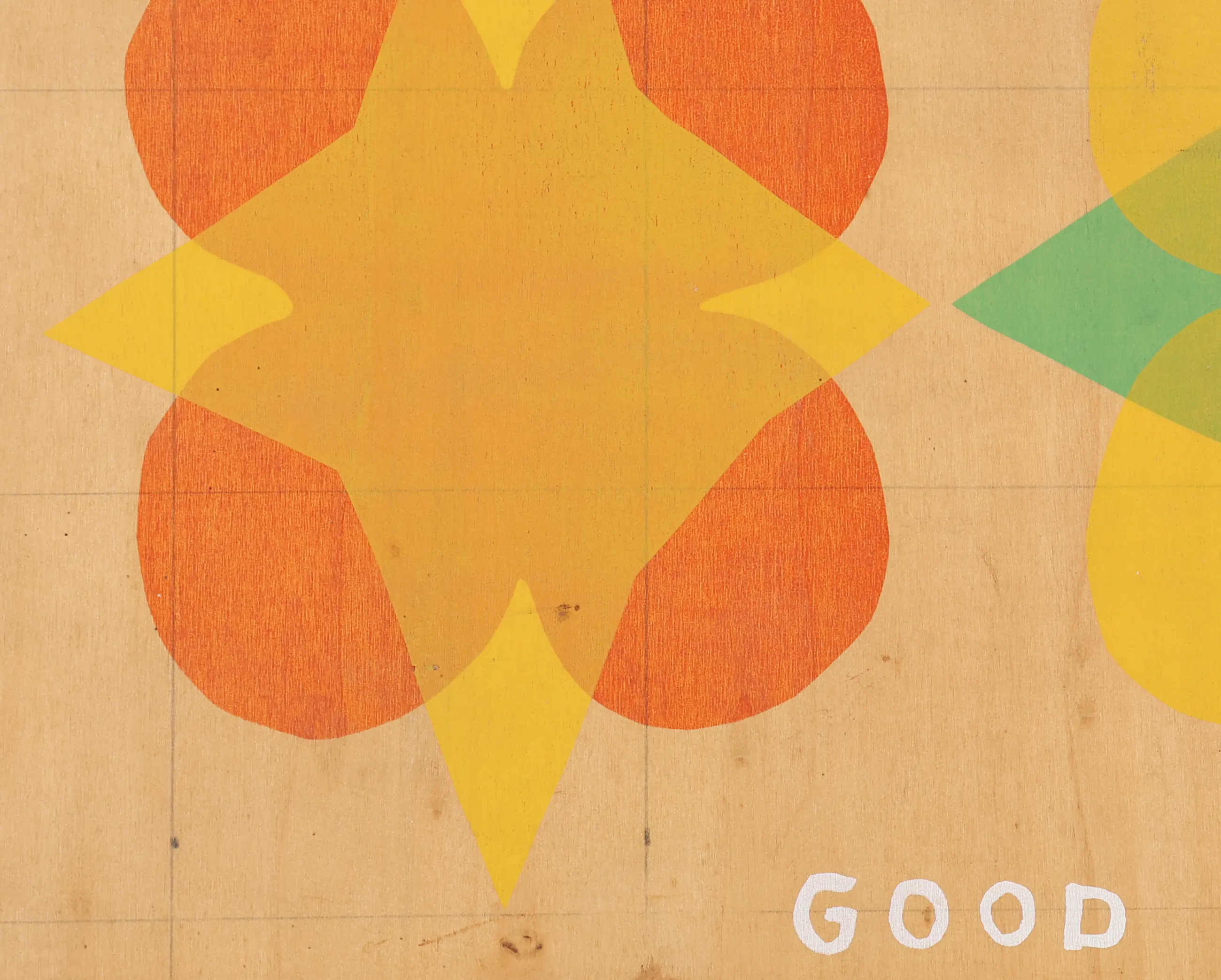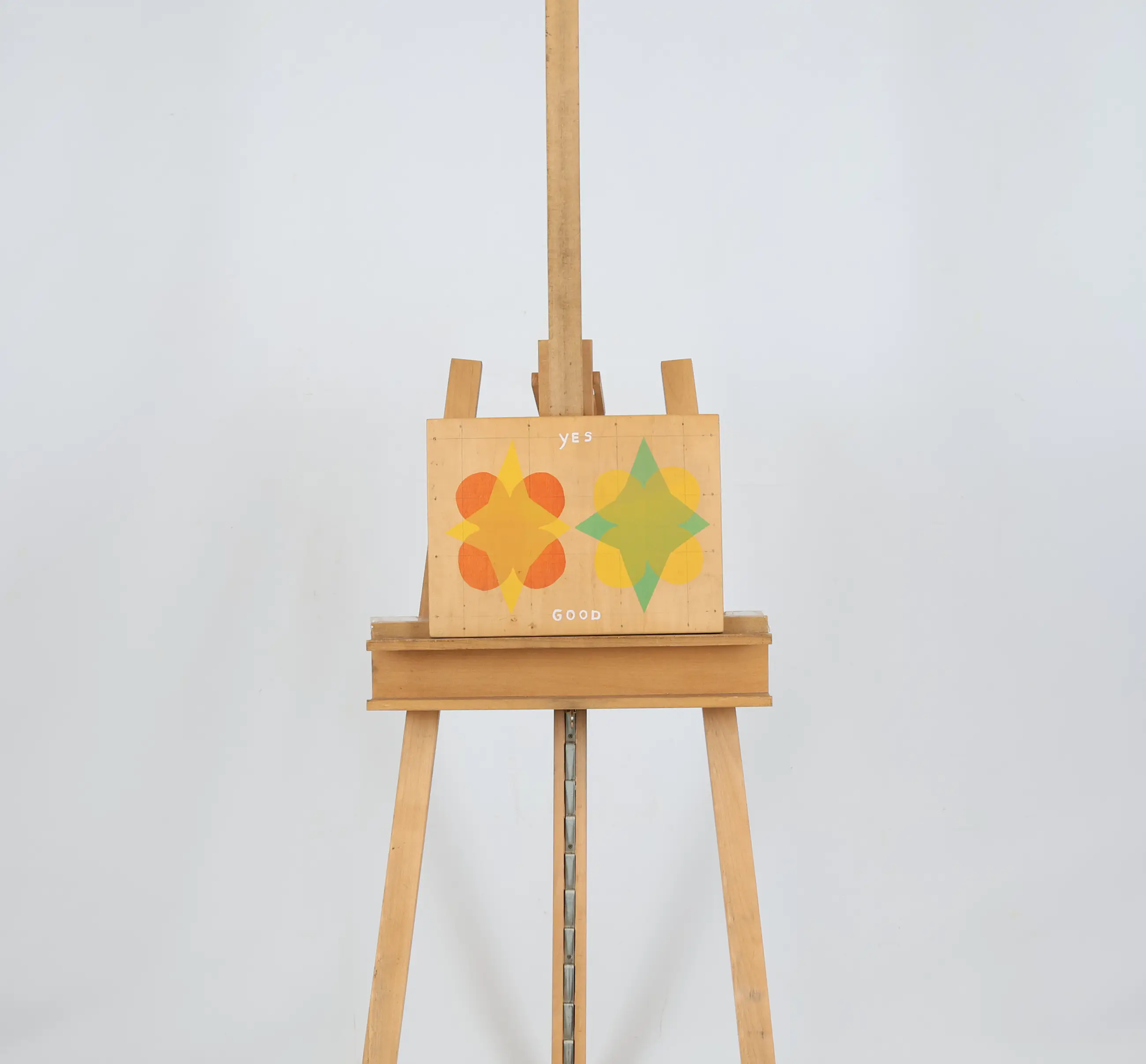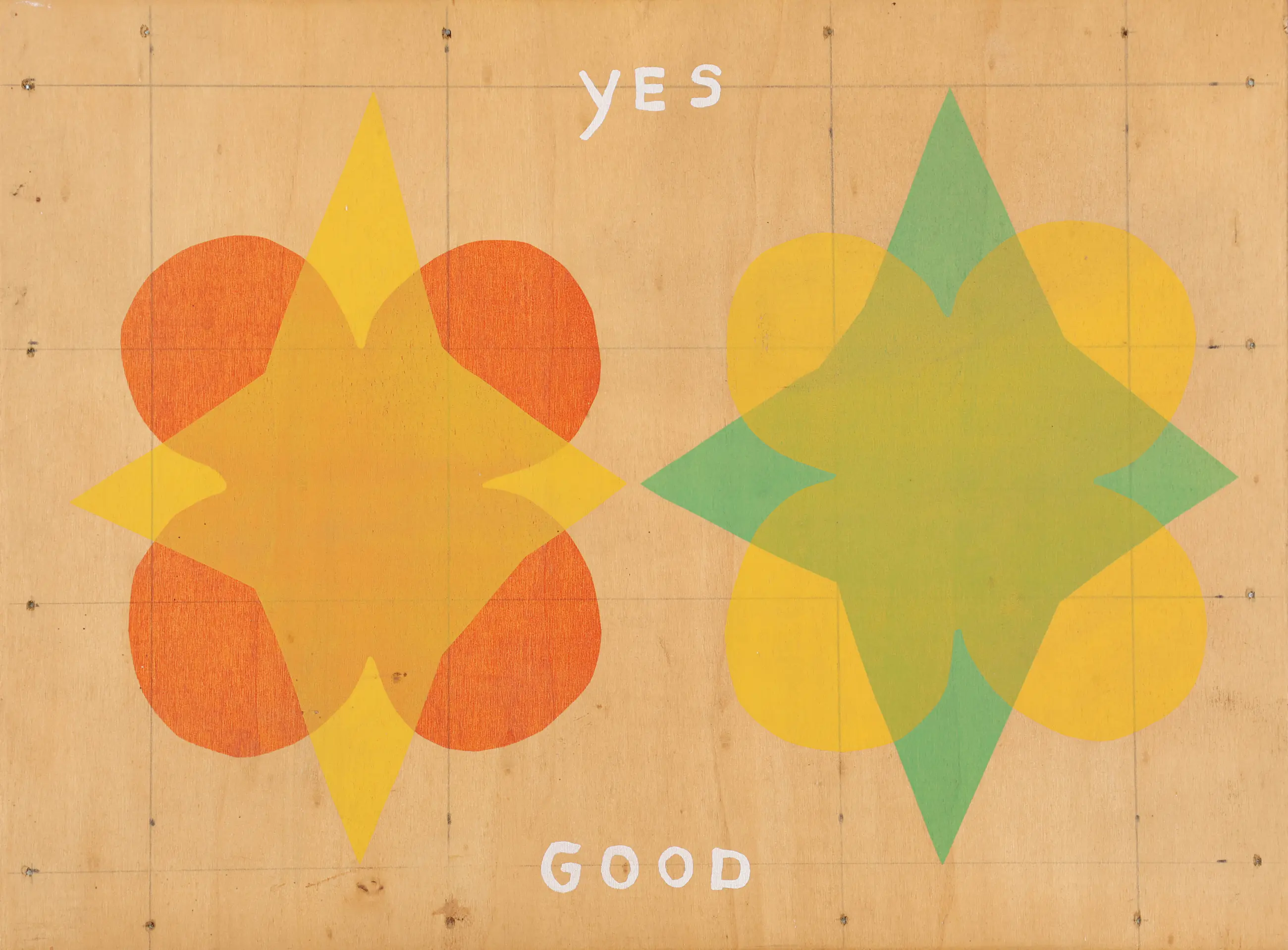 Deze zeefdruk is gemaakt door Mat van der Heijden (1964). Het werk is uitgevoerd op een paneel en toont een compositie van geometrische vormen en letters waarin de woorden yes good centraal staan.