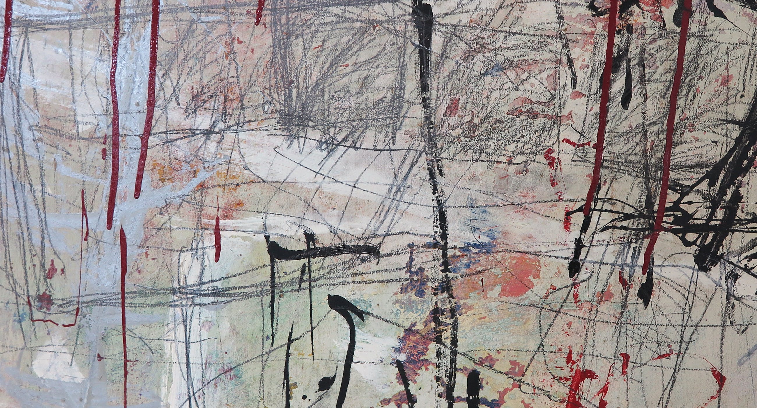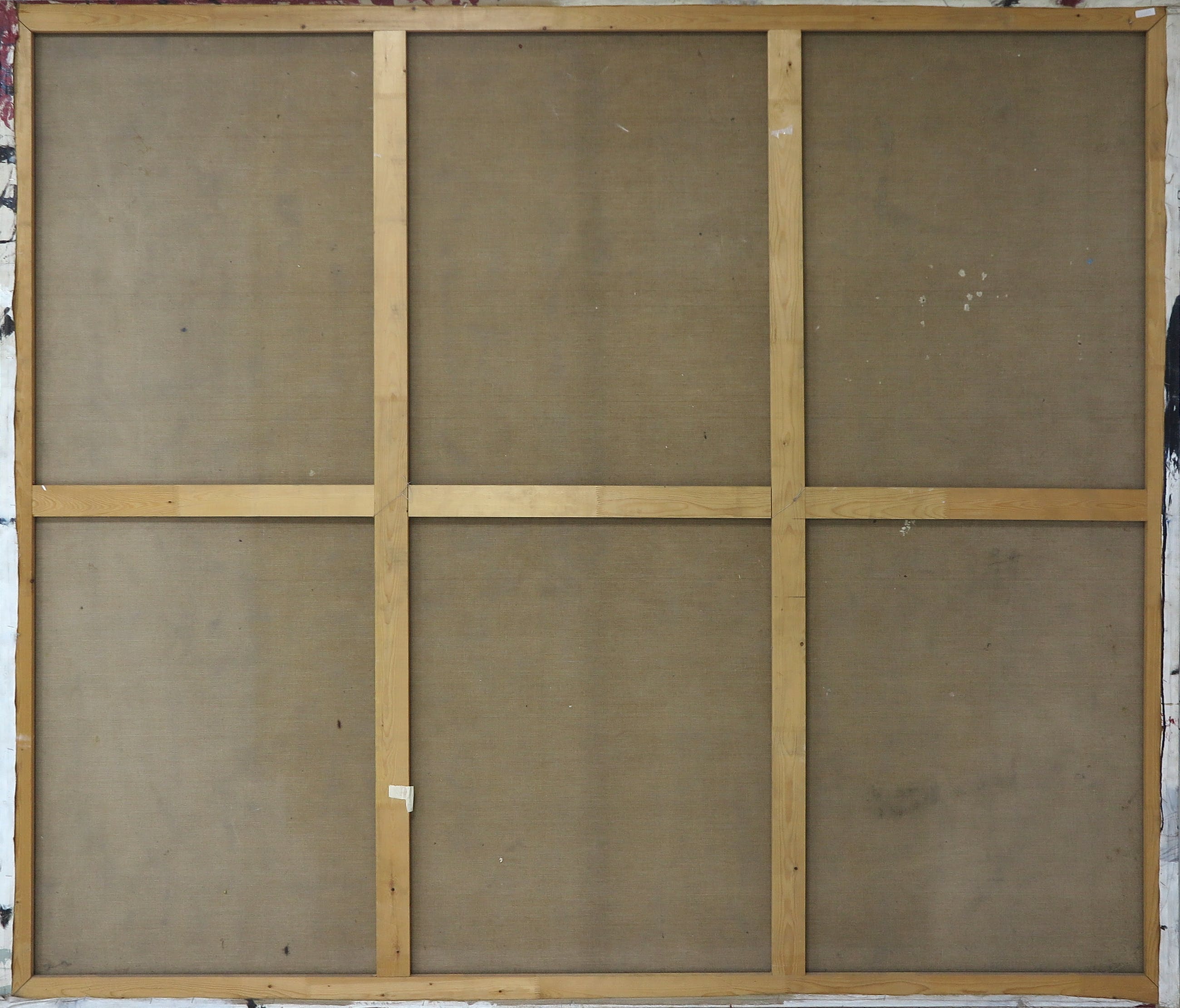 | Wat lichte slijtage/smoezeligheid langs de randen en hoeken. Linksboven in het doek twee kleine gaatjes bij elkaar. Valt op dit formaat doek met deze kleuren niet op. | |