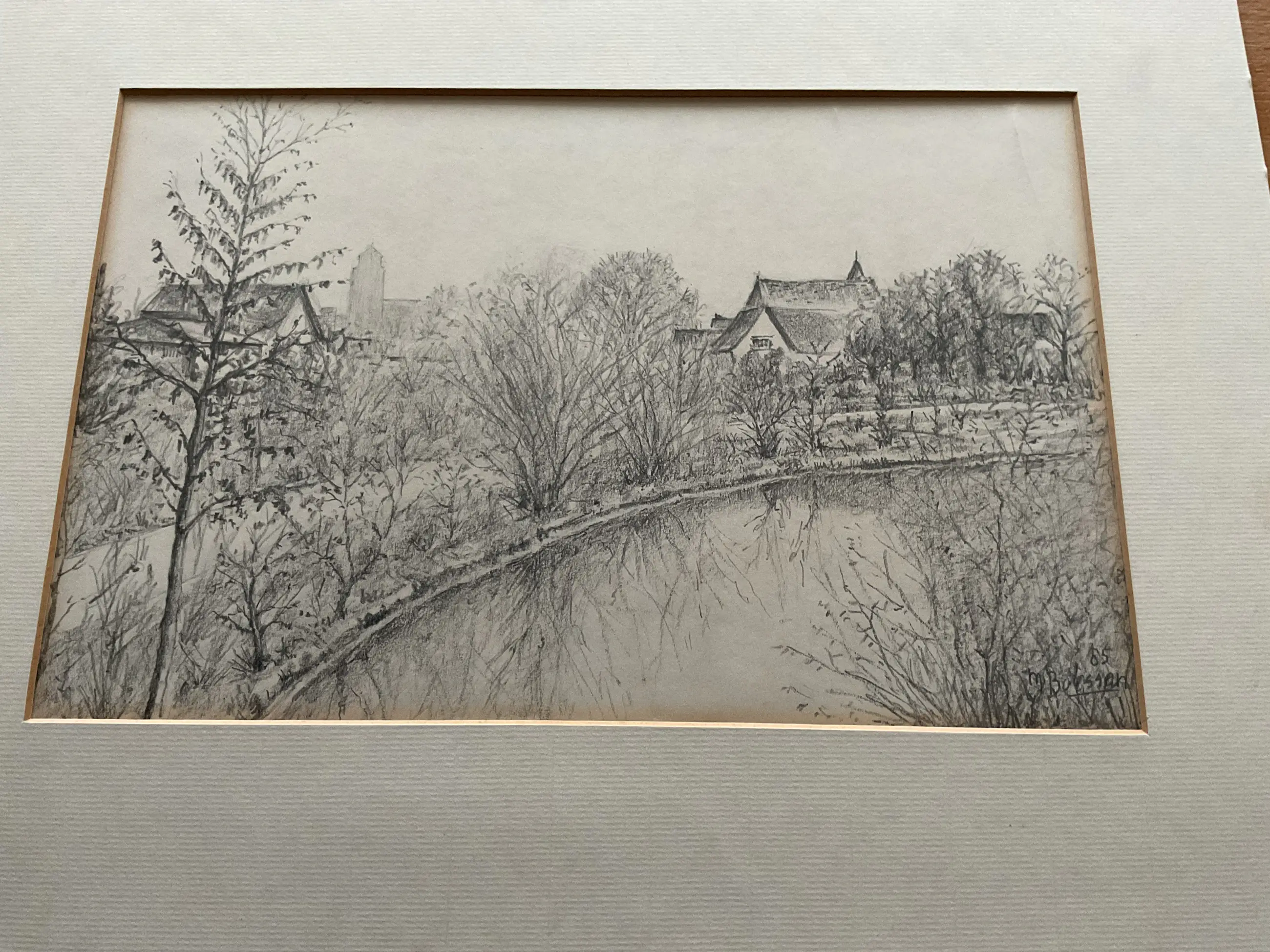 Het is mijn niet bekend waar dit precies getekend is door Mathieu Boessen, Lijkt mij in Roermond. Op de achtergrond meen ik de Heilige Laurentius Kerk in Maasniel te herkennen.