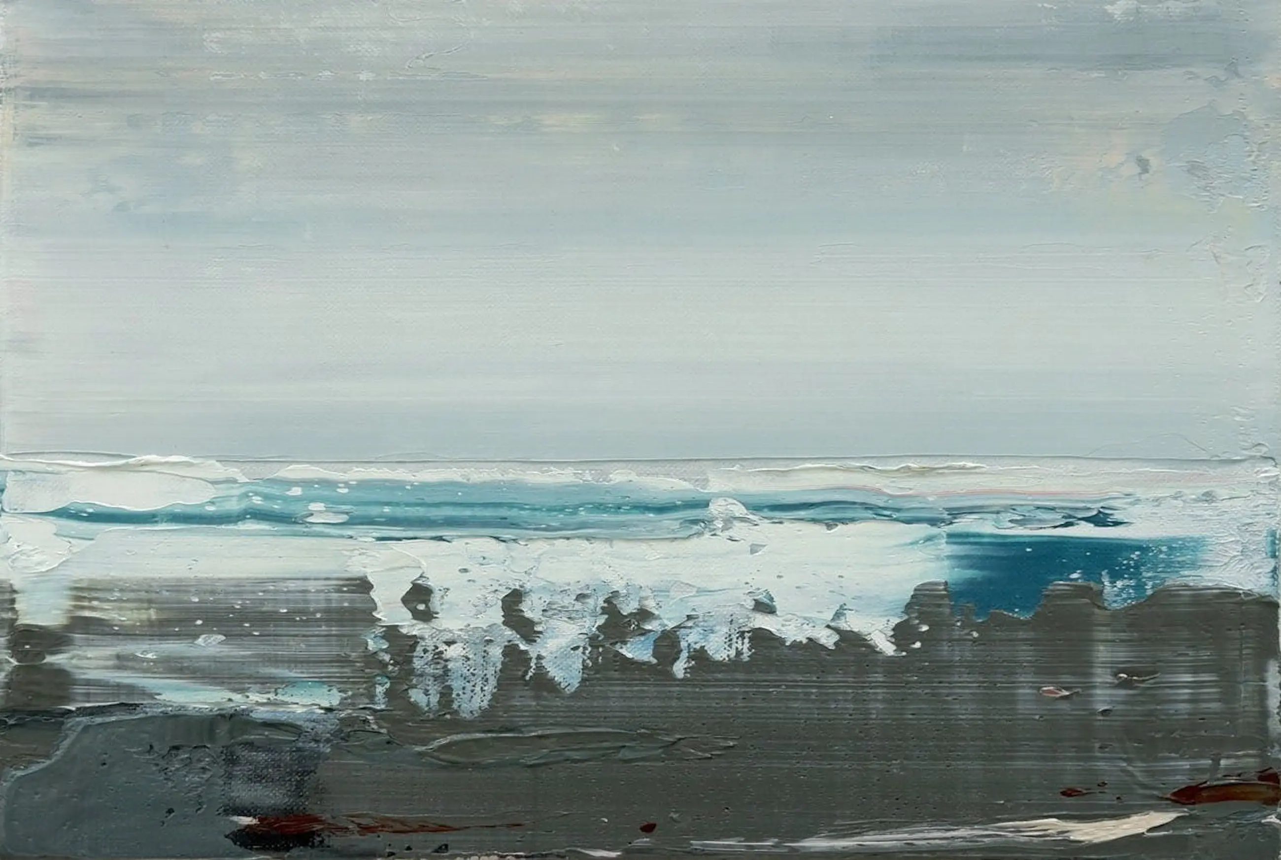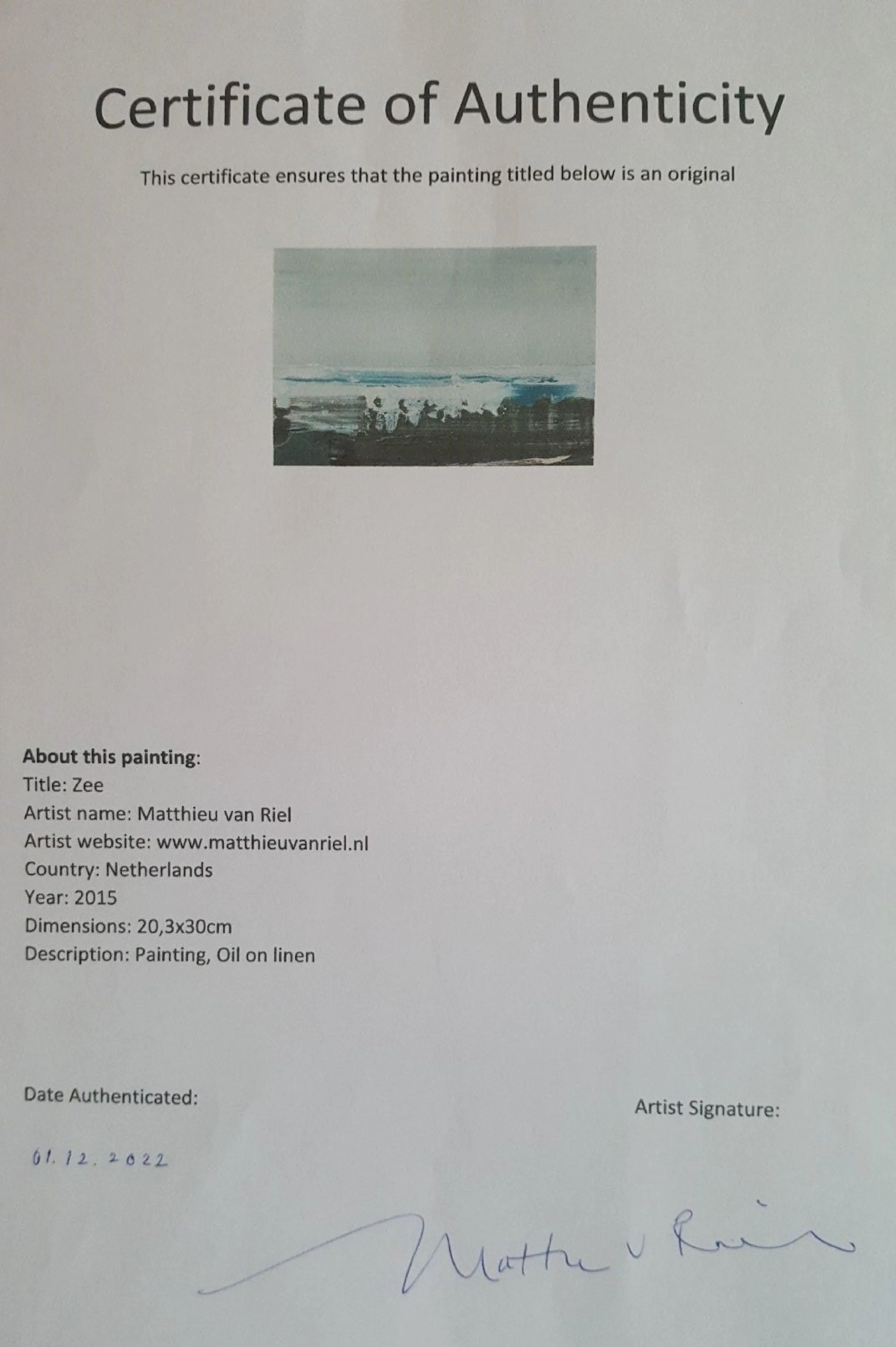 Het schilderij met de titel 'Zee' is geschilderd door Matthieu van Riel. Het schilderij is olieverf op linnen. Op de achterkant is het schilderij gesigneerd, getiteld en gedateerd. Het schilderij is ingelijst. De lijst is 32,5 x 3 x 22,5 cm. (lxbxh). Het schilderij is 30 x 20 cm. (lxh).