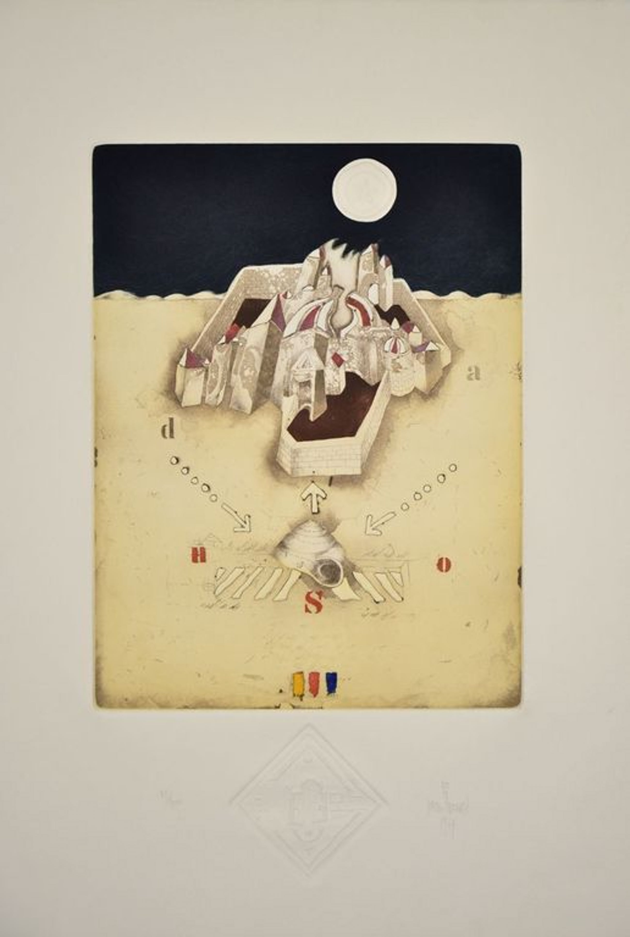 Mooie kleurenets/aquatint van de van oorsprong Kroatische kunstenaar Matko Trebotic. Mooi werk met diverse drukgangen. Tevens een kleinere blinddruk onder het werk van een plattegrond van een citadel (zie foto 3). Ons is niet bekend om welke vesting het hier gaat.