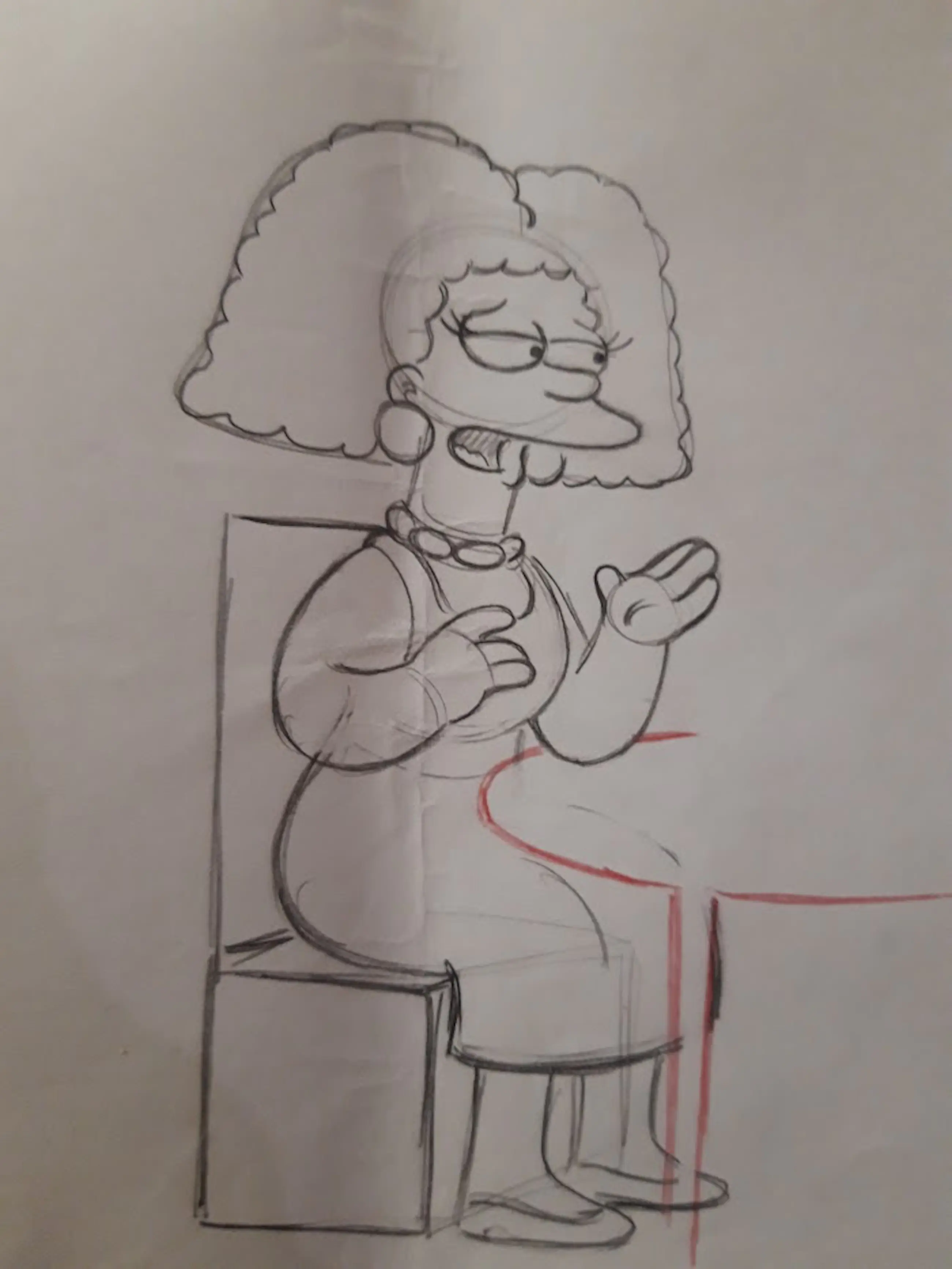 Dit is een originele tekening die werd gebruikt voor het maken van een aflevering van The Simpsons . Deze tekening is vervaardigd met potlood voor een aflevering begin jaren '90. Dit is een tekening van het personage Selma Bouvier, een zuster van Marge. Onderaan vind je nog referenties die linken naar de aflvering en het fragment waarvoor deze tekening werd gemaakt.