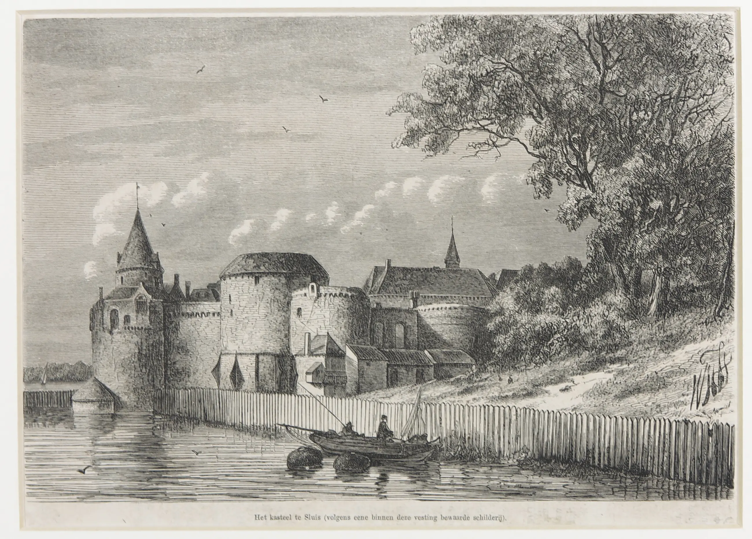 4) Onbekend, Het kasteel te Sluis (volgens eene binnen deze vesting bewaarde schilderij) (afmeting zonder passe-partout: 15,5 x 21,5 cm)