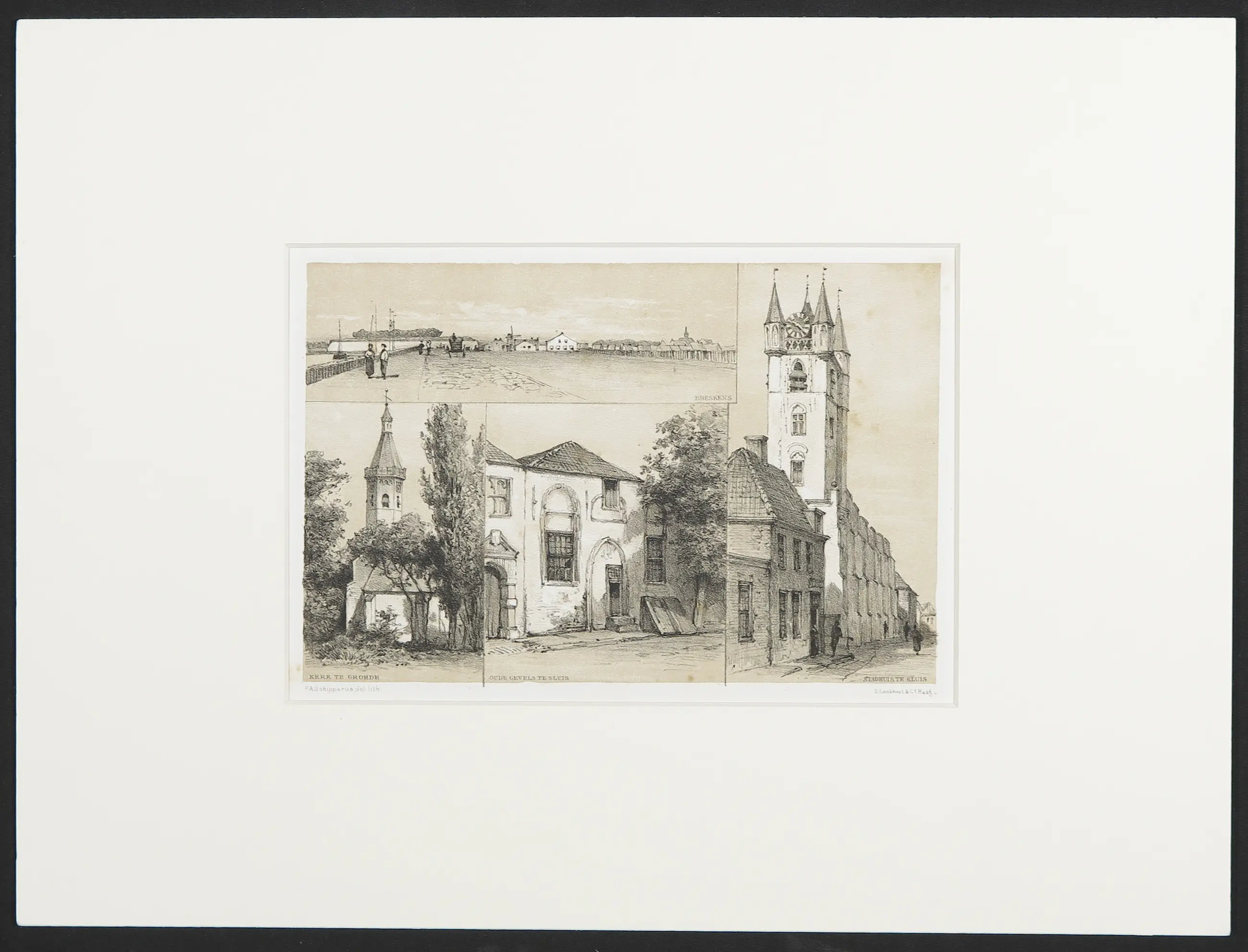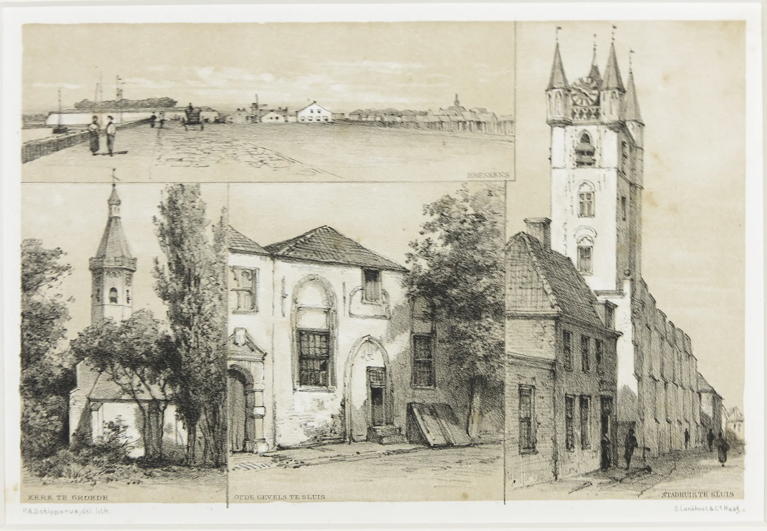5) P.A. Schipperus (litho), Kerk te Groede, Oude gevels te Sluis, Stadhuis te Sluis, 1884 (afmetingen zonder passe-partout: 15 x 22 cm)