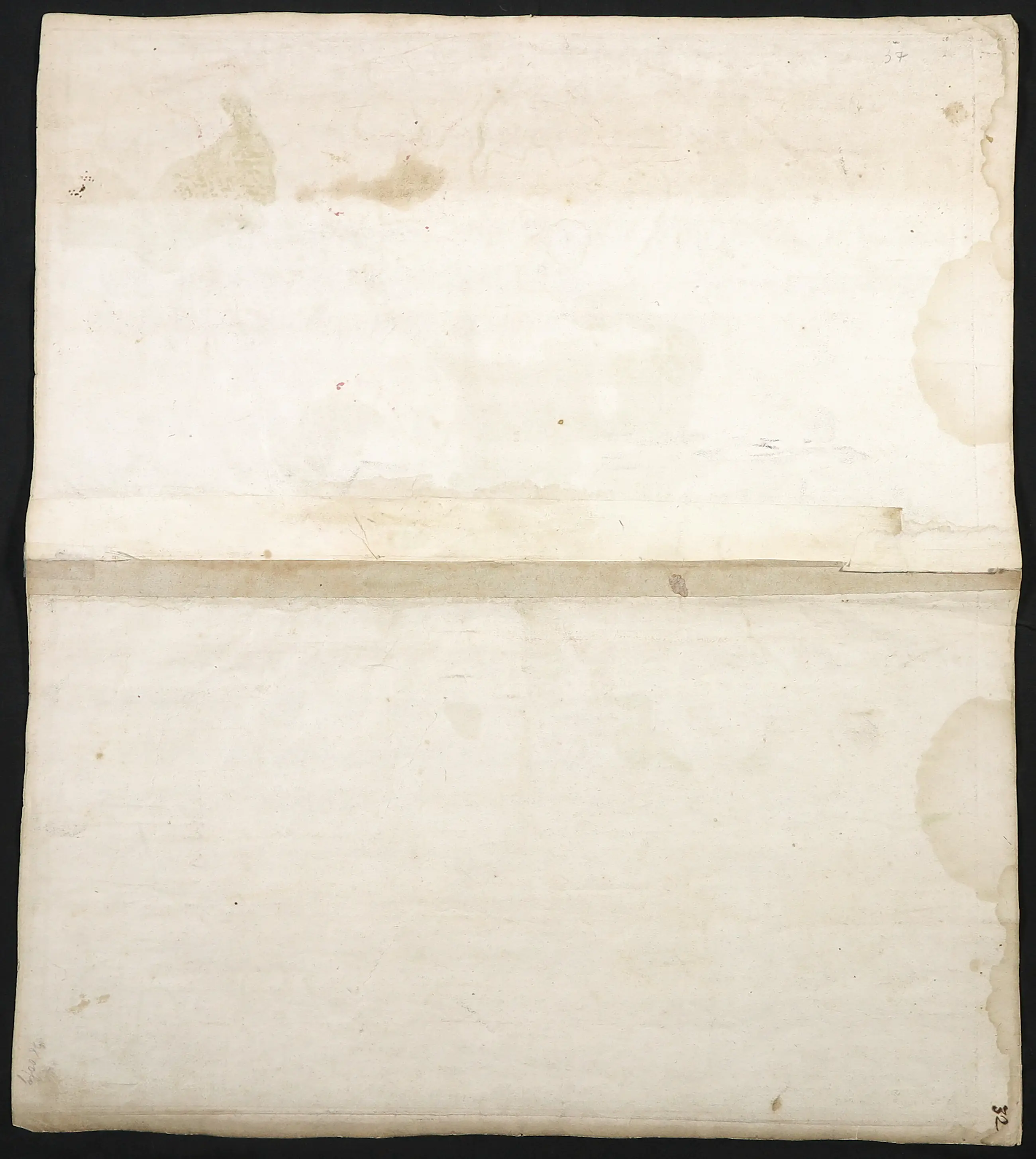 | Zeer goede staat gezien leeftijd. Meerdere vlekjes en verkleuringen verspreid over het blad en langs de randen. In het midden een vouwlijn. | |||