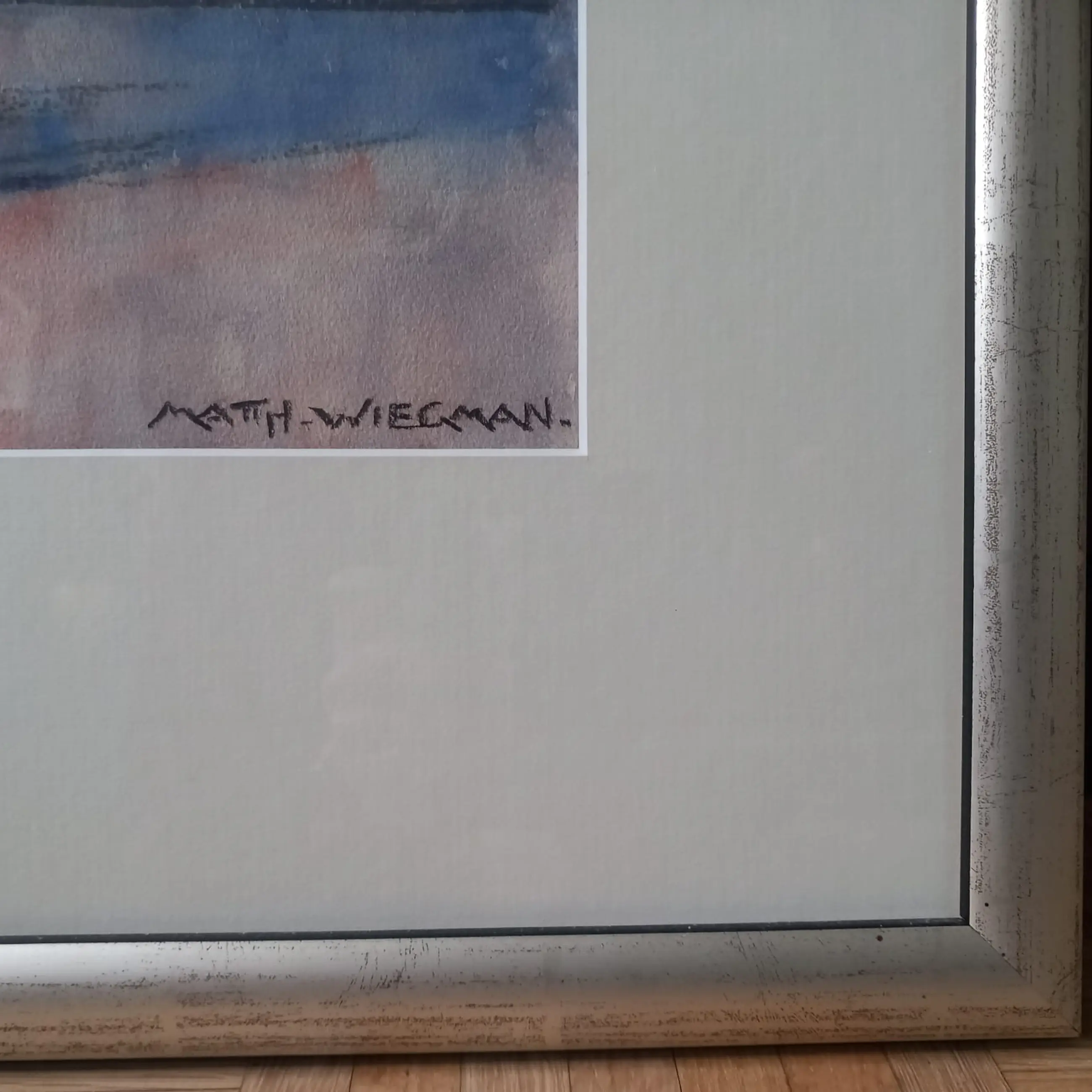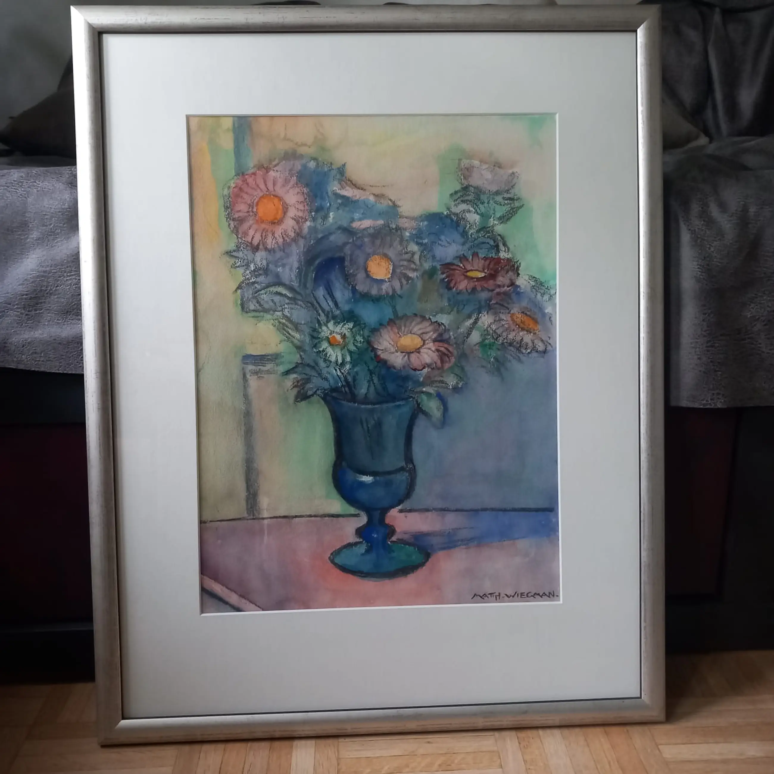 prachtig ingelijste Gouache van Matthieu Wiegmans. Stilleven, bloemen, vaas. Uitstekende conditie ingelijst achter glas met zilverkleurige lijst en pass-partout. Rechtsonder gesigneerd. Mooi kunstwerk met warmte en kleur.