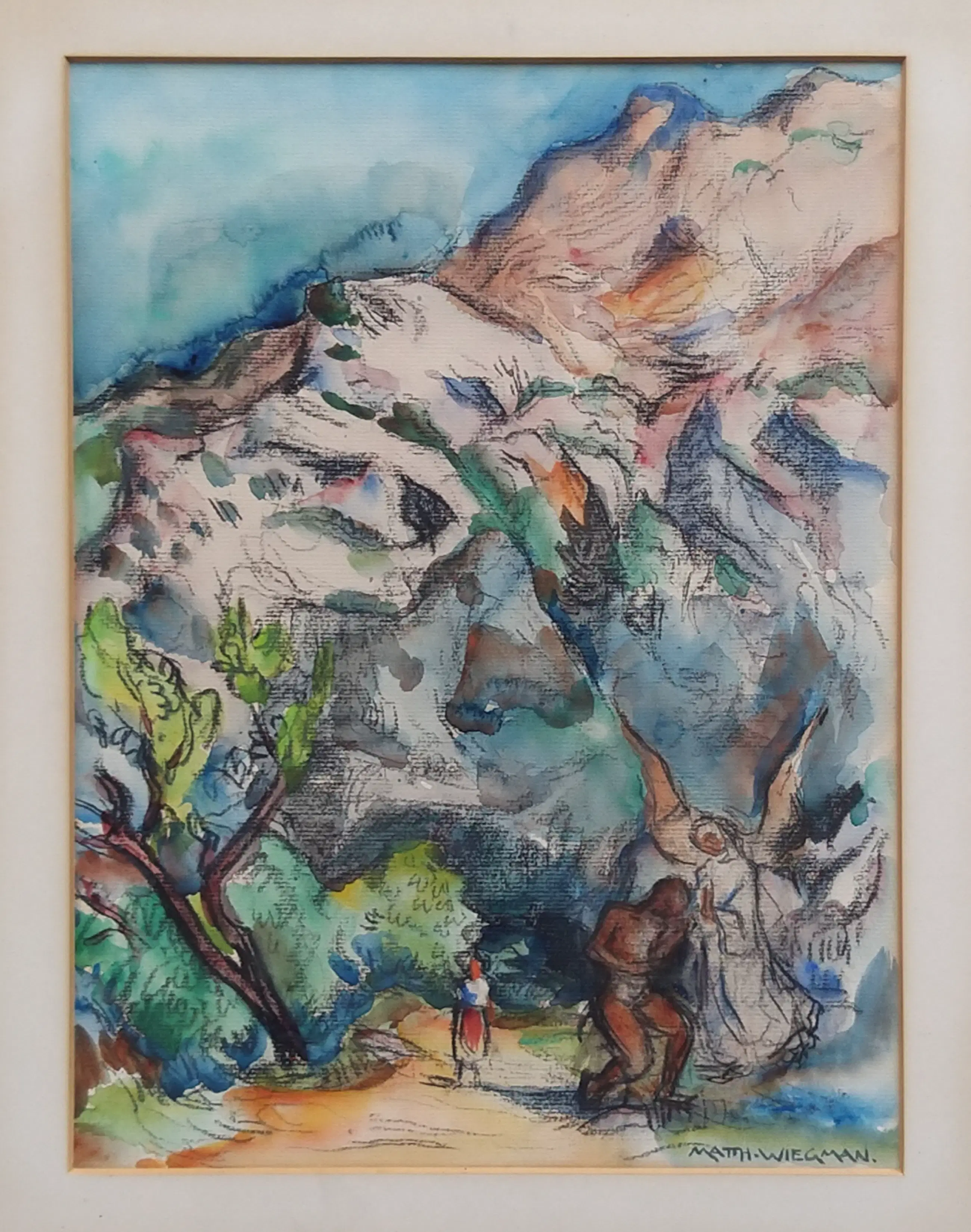 Personen in een landschap Gouache op papier - rechtsonder gesigneerd Ingelijst