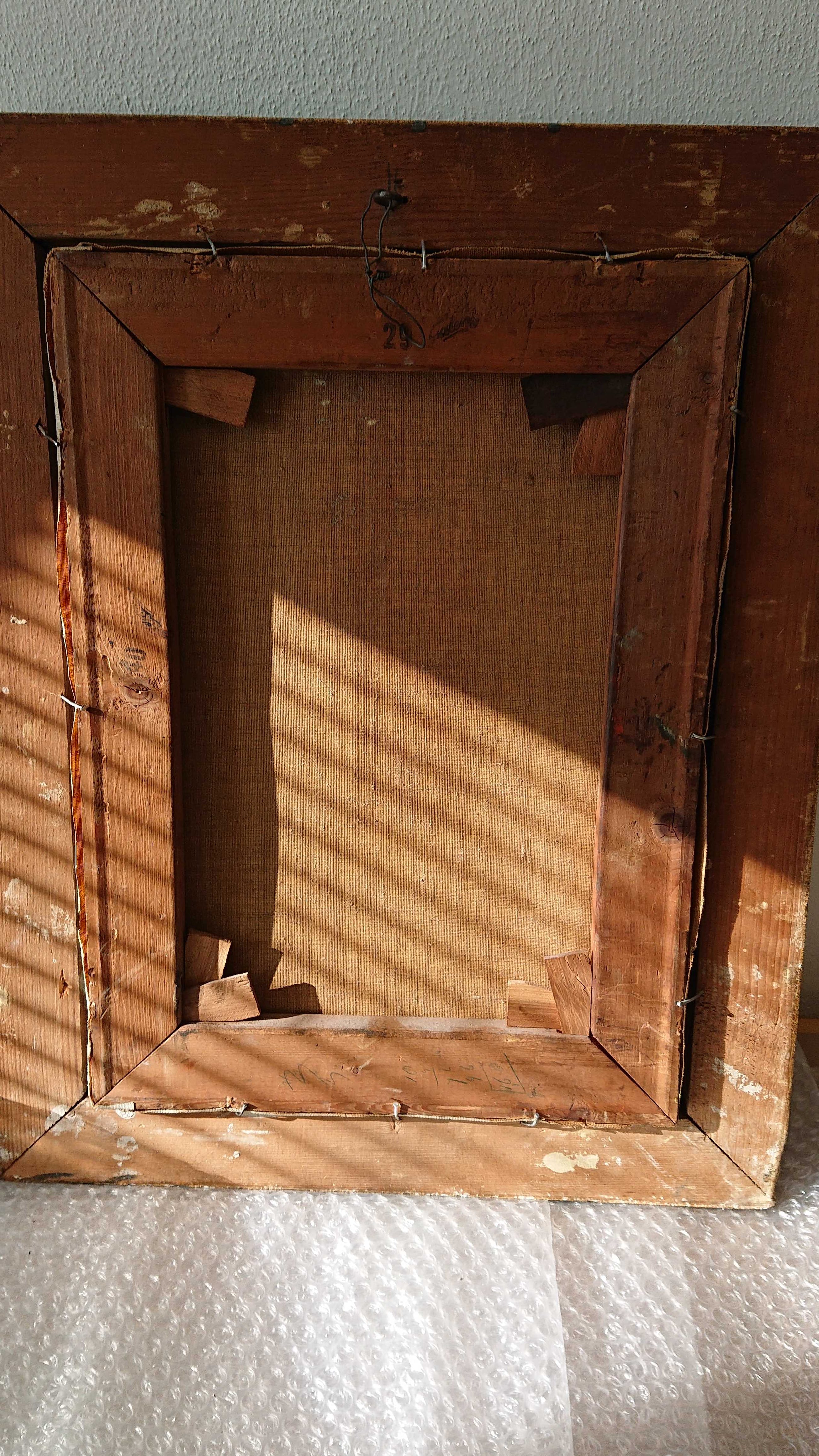 De lijst vertoont sporen van de tijd, tevens zitten er enkele kleine beschadigingen waar de lijst het doek raakt (zie foto's).